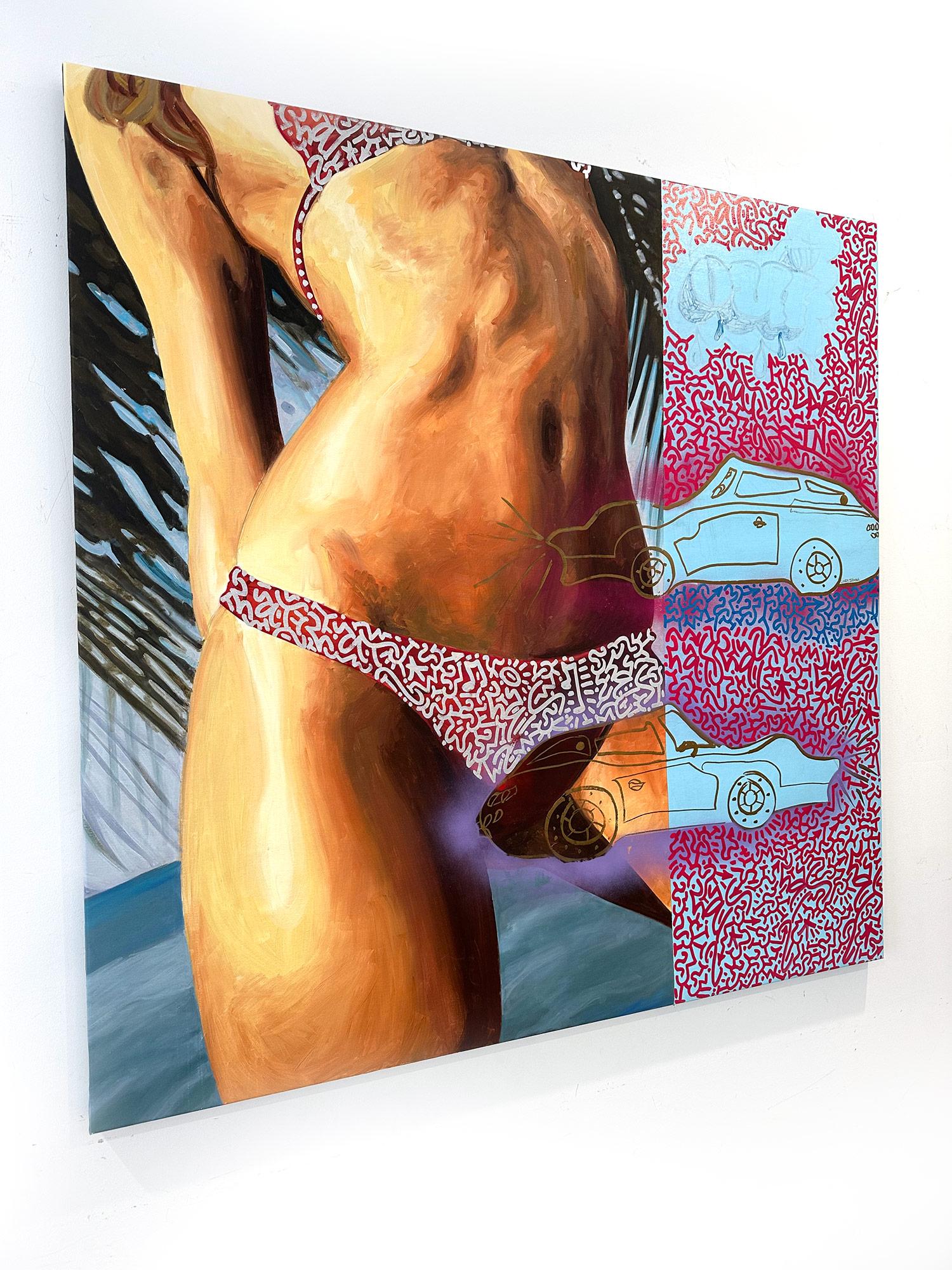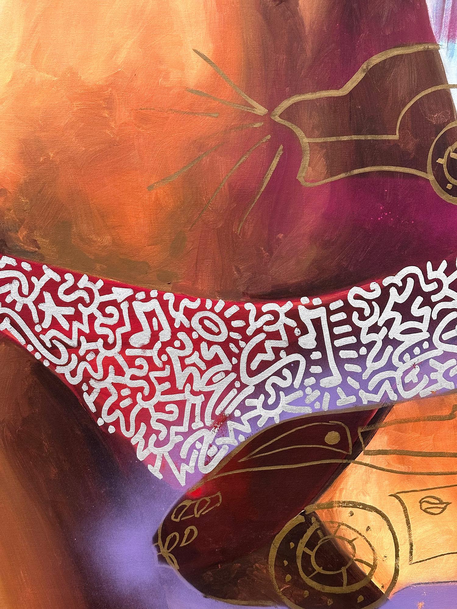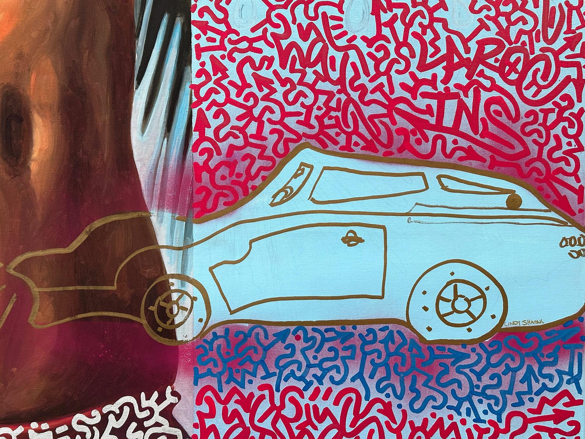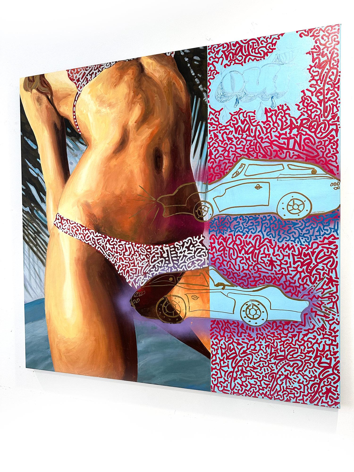 Diese Arbeit ist eine Collaboration zwischen Angel Ortiz, Chaval und Cindy Shaoul. Die Kollaboration begann 2010 mit der ikonischen Serie "Street Cars", die Autos mit Angels charakteristischer Graffiti-Kalligrafie zeigt, die sie umgibt. Hier ziert ein weiblicher Torso die Leinwand in einem von Keith Haring beeinflussten Pop-Stil. Dieses Werk stammt aus der Serie "80's Pop Art".