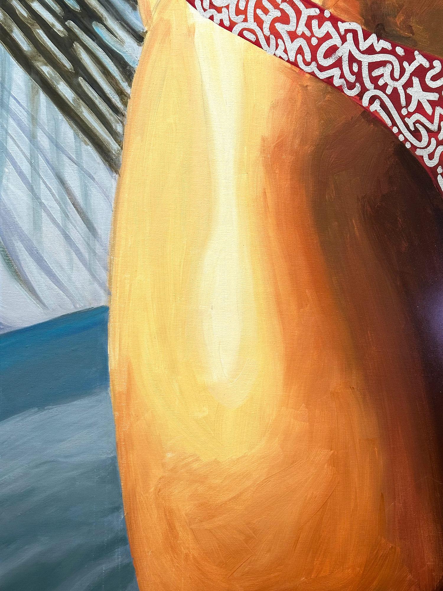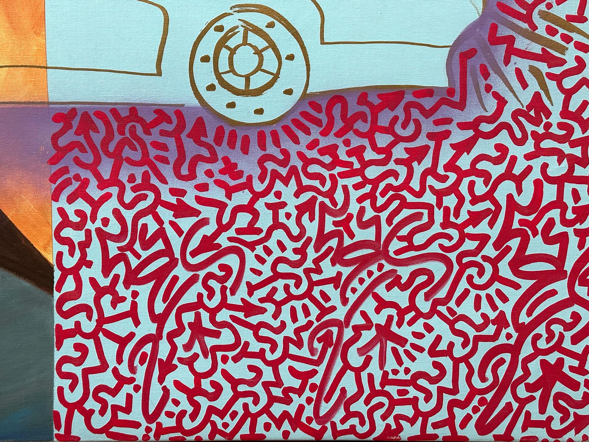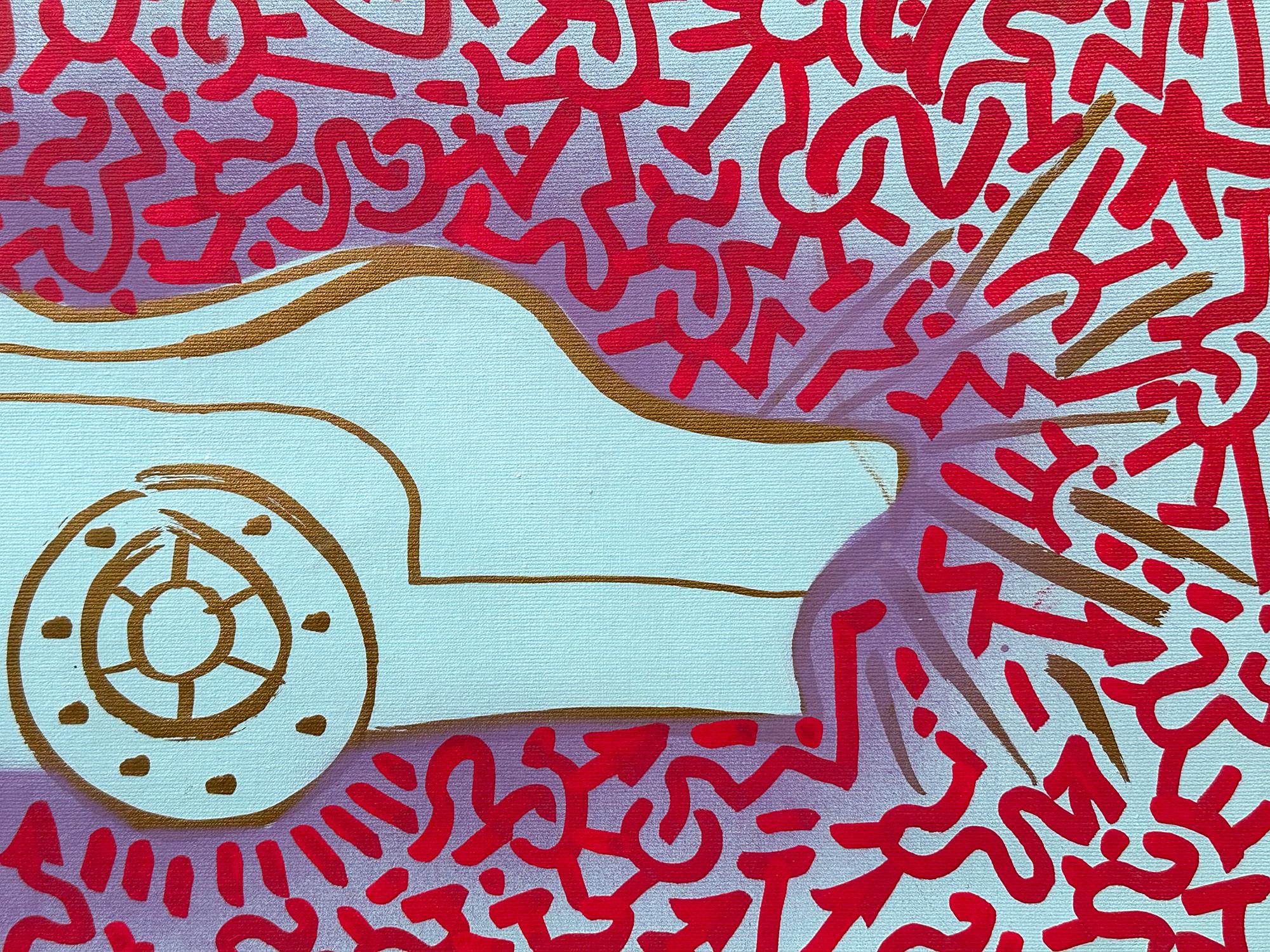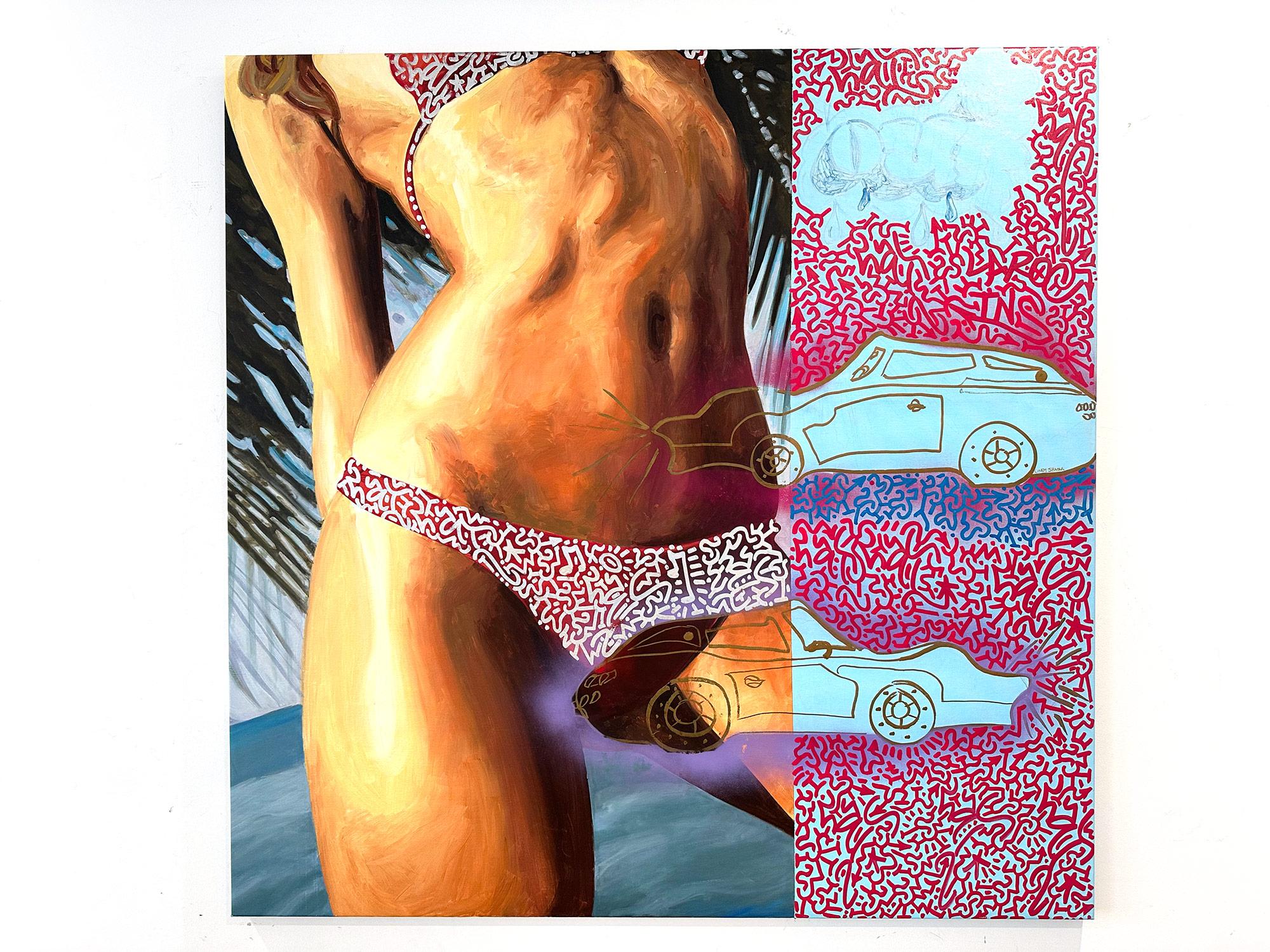 Diese Arbeit ist eine Collaboration zwischen Angel Ortiz, Chaval und Cindy Shaoul. Die Kollaboration begann 2010 mit der ikonischen Serie "Street Cars", die Autos mit Angels charakteristischer Graffiti-Kalligrafie zeigt, die sie umgibt. Hier ziert ein weiblicher Torso die Leinwand in einem von Keith Haring beeinflussten Pop-Stil. Dieses Werk stammt aus der Serie "80's Pop Art".