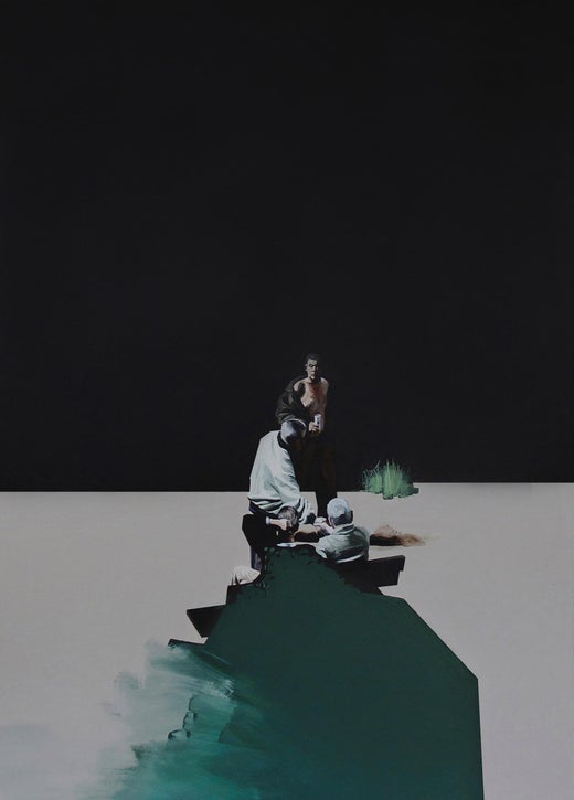 Der Zyklus "Final Fantasy" von Magdalena Peszkowska ist eine Reihe von kunstvollen, figurativen Kompositionen in einer trostlosen Landschaft, ohne Trubel, still, eingefroren, irgendwie erstarrt. Von unruhigem Grün bedeckt, wird er zu einem magischen Reich. Es ist nicht länger ein Hof, es ist