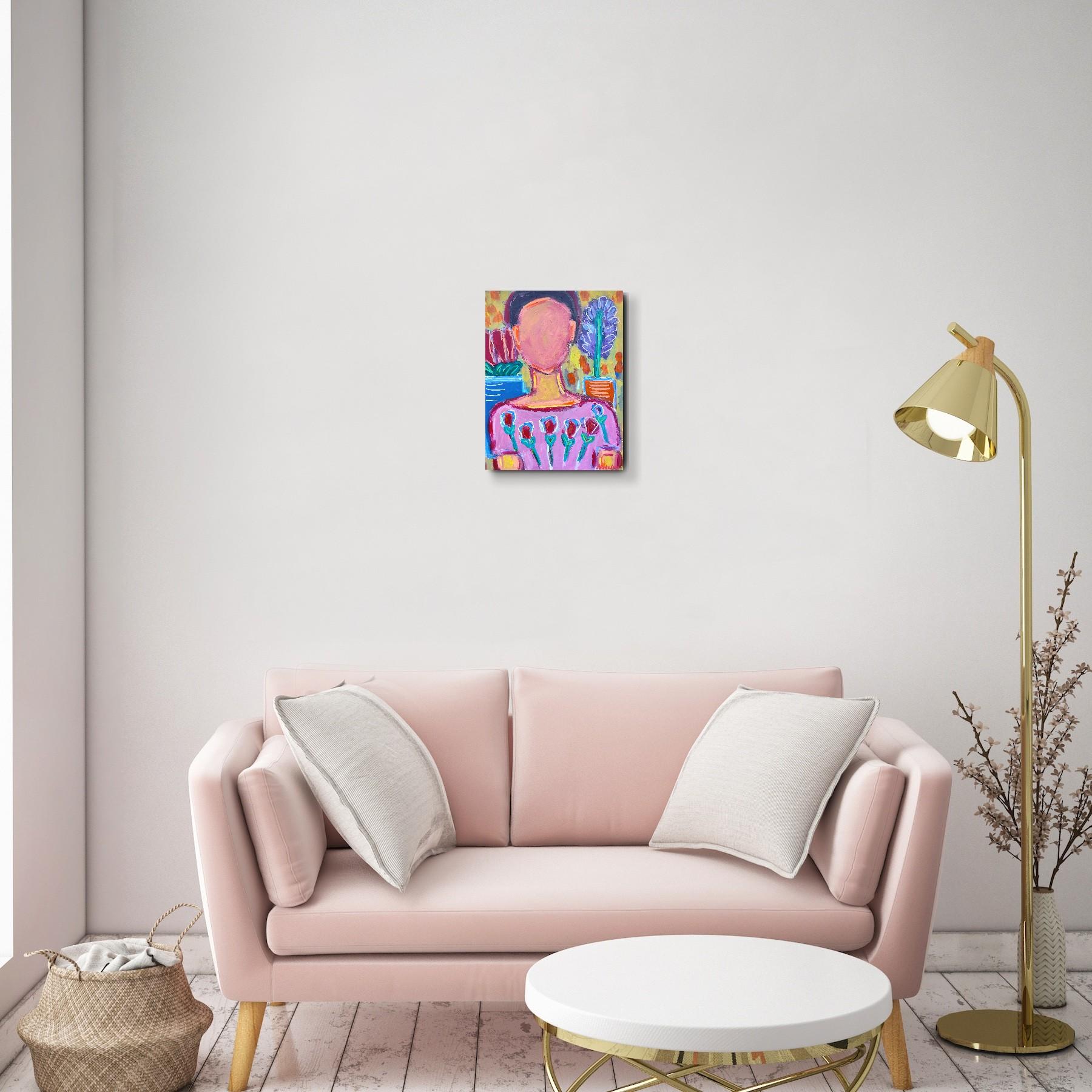 In dieser Arbeit erscheint die Frau ohne definierte Gesichtszüge, was es dem Betrachter ermöglicht, seine eigenen Gefühle, Erfahrungen und Geschichten auf sie zu projizieren. Umgeben von lebhaften Blüten und leuchtenden Vasen steht sie als Symbol für Erneuerung, Weiblichkeit und inneres Wachstum. Die Blumen auf ihrem Kleid spiegeln dieses Erwachen wider und deuten an, dass ihre Identität sanft und doch kraftvoll unter der Oberfläche erblüht.
