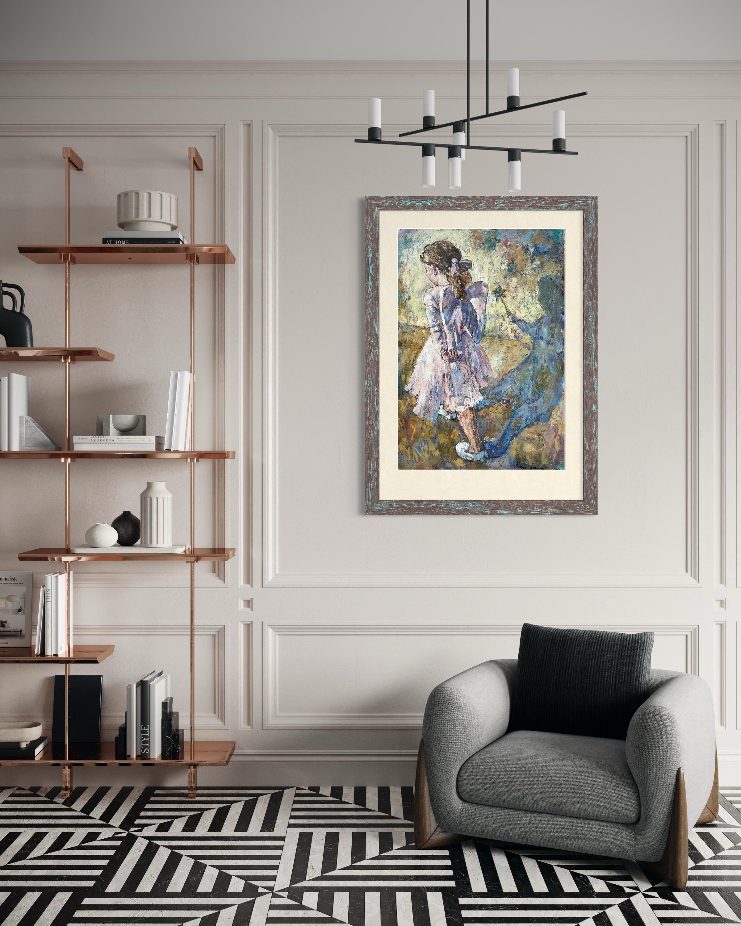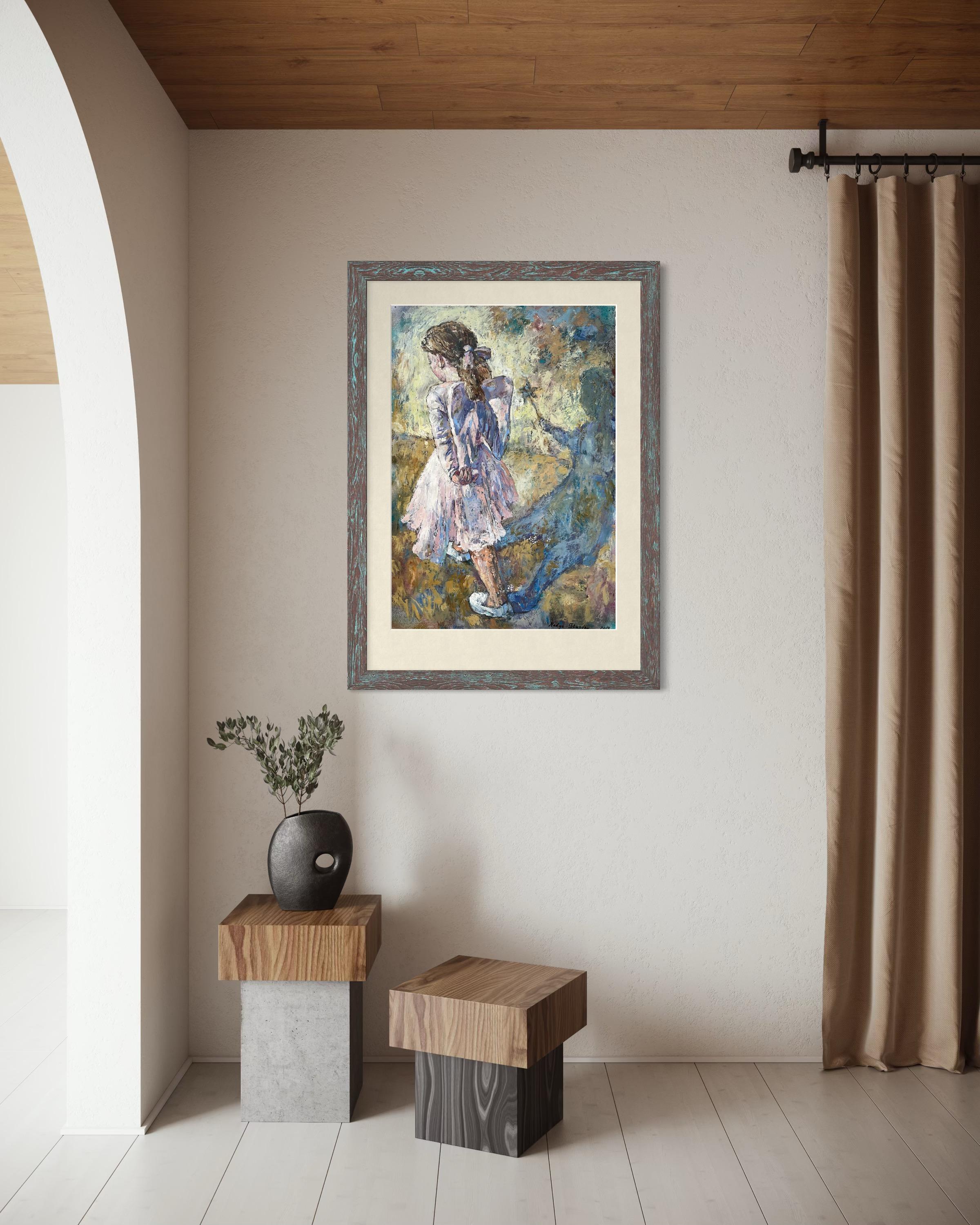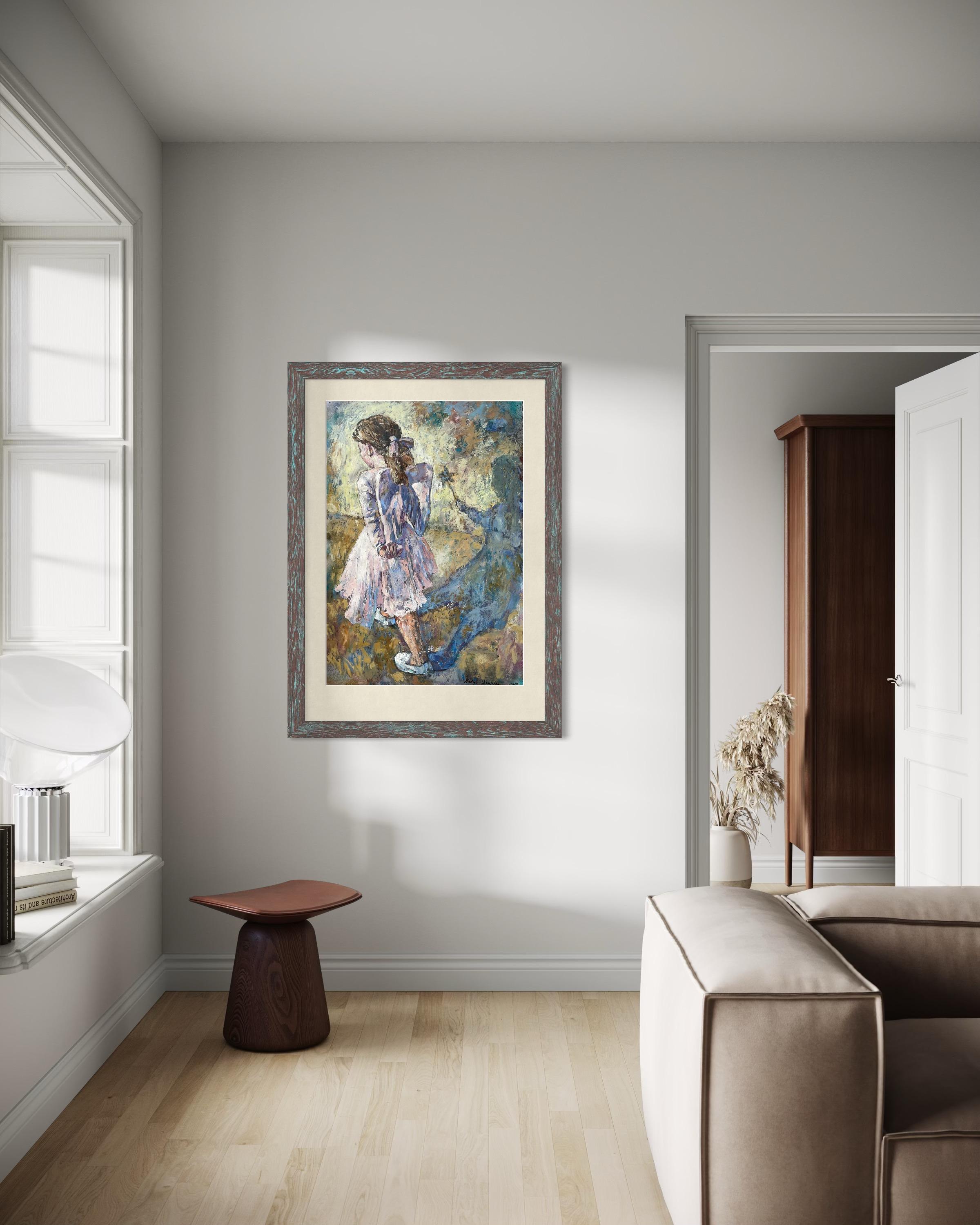 Dieses exquisite Kunstwerk fängt ein junges Mädchen in einem Moment der stillen Kontemplation ein, dargestellt mit einer meisterhaften Verwendung von Textur und Farbe. Sie ist von hinten dargestellt und trägt ein blasses, zart bemaltes Kleid, das Unschuld und Ruhe suggeriert. Der Künstler verwendet einen impressionistischen Stil mit kühnen, ausdrucksstarken Pinselstrichen, die dem Werk einen dynamischen Sinn für Bewegung verleihen. Das Spiel von Licht und Schatten ist sorgfältig ausgearbeitet, wobei sich der längliche Schatten des Mädchens lebhaft auf den Boden wirft, was ihm Tiefe und Faszination verleiht. Dieses Zusammenspiel unterstreicht nicht nur die ätherische Qualität der Szene, sondern deutet auch eine Erzählung jenseits der Leinwand an. Die harmonische Mischung aus sanften Blautönen, zarten Rosatönen und Erdtönen schafft eine Atmosphäre der Ruhe und Besinnlichkeit. Dieses Kunstwerk zeichnet sich durch seine Fähigkeit aus, Emotionen hervorzurufen und gleichzeitig den Betrachter einzuladen, über die ungesehenen Gedanken des abgebildeten Kindes nachzudenken, indem es Realismus mit einer traumhaften Essenz verbindet.