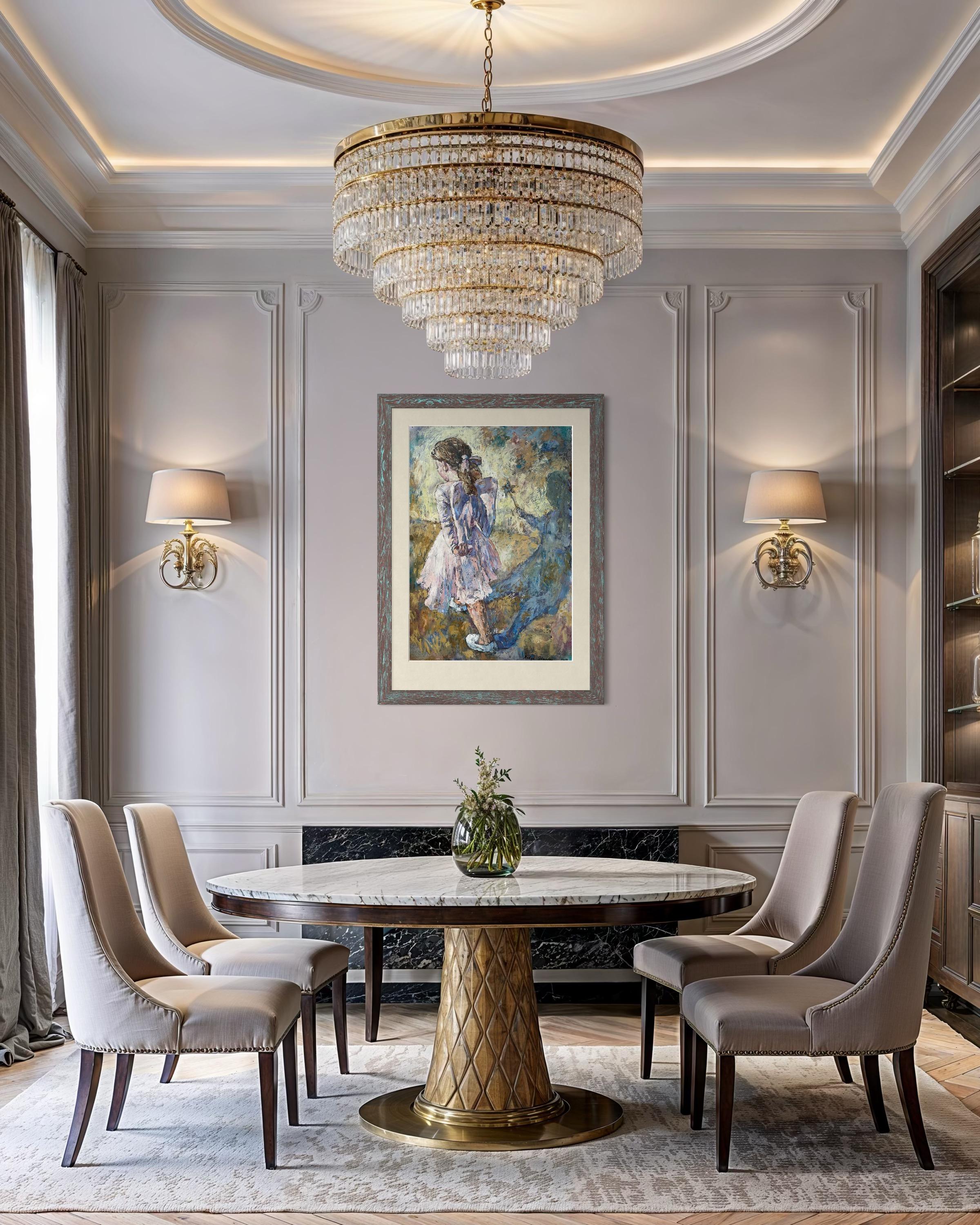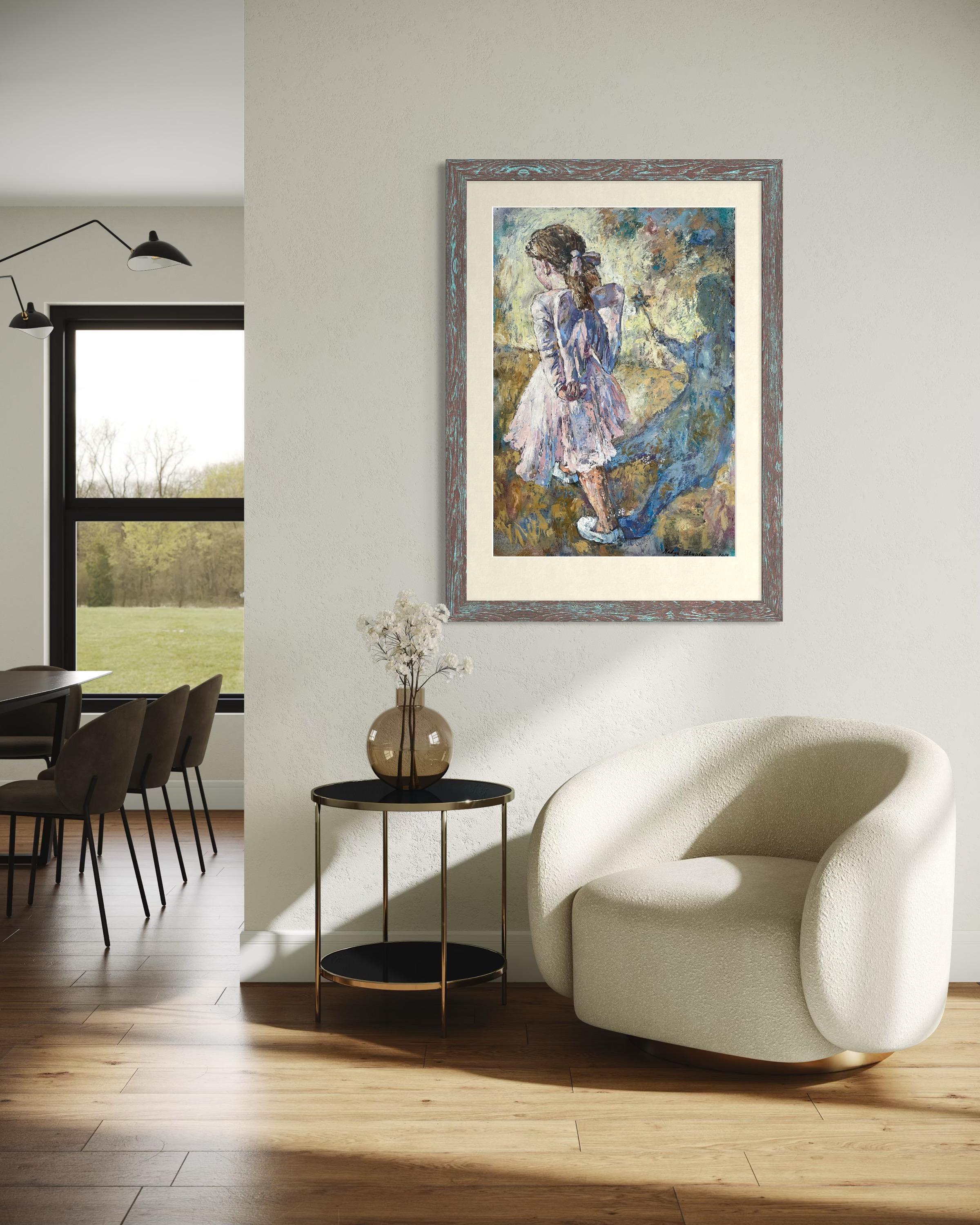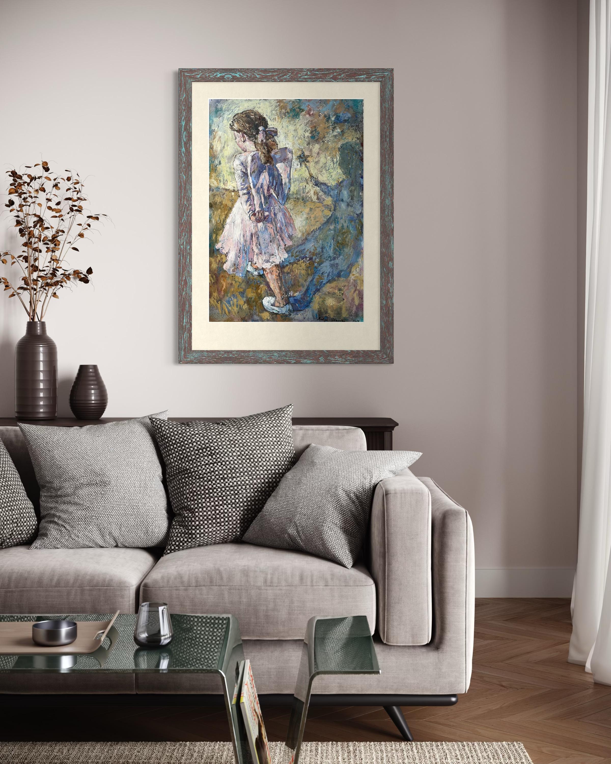 Dieses exquisite Kunstwerk fängt ein junges Mädchen in einem Moment der stillen Kontemplation ein, dargestellt mit einer meisterhaften Verwendung von Textur und Farbe. Sie ist von hinten dargestellt und trägt ein blasses, zart bemaltes Kleid, das Unschuld und Ruhe suggeriert. Der Künstler verwendet einen impressionistischen Stil mit kühnen, ausdrucksstarken Pinselstrichen, die dem Werk einen dynamischen Sinn für Bewegung verleihen. Das Spiel von Licht und Schatten ist sorgfältig ausgearbeitet, wobei sich der längliche Schatten des Mädchens lebhaft auf den Boden wirft, was ihm Tiefe und Faszination verleiht. Dieses Zusammenspiel unterstreicht nicht nur die ätherische Qualität der Szene, sondern deutet auch eine Erzählung jenseits der Leinwand an. Die harmonische Mischung aus sanften Blautönen, zarten Rosatönen und Erdtönen schafft eine Atmosphäre der Ruhe und Besinnlichkeit. Dieses Kunstwerk zeichnet sich durch seine Fähigkeit aus, Emotionen hervorzurufen und gleichzeitig den Betrachter einzuladen, über die ungesehenen Gedanken des abgebildeten Kindes nachzudenken, indem es Realismus mit einer traumhaften Essenz verbindet.