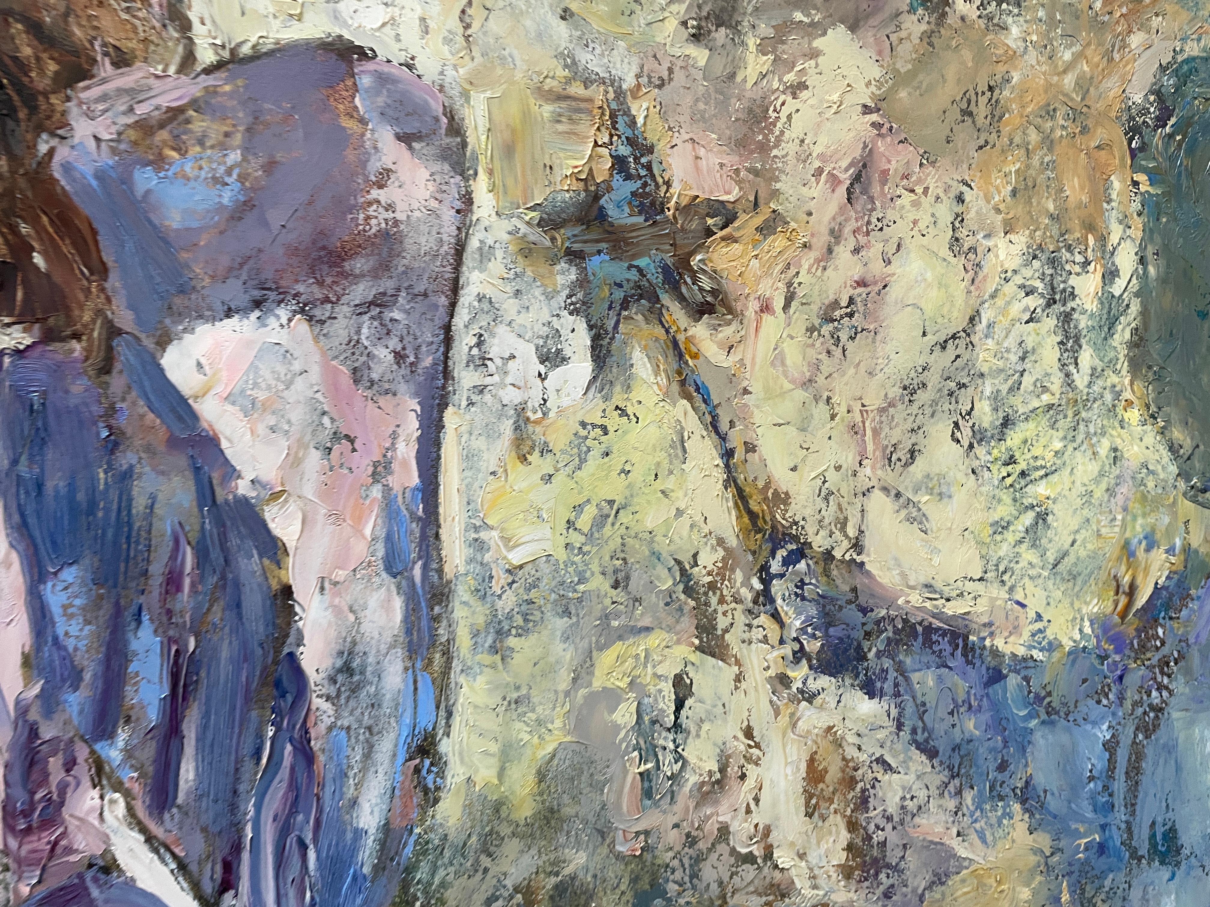 "Süße Abenteuer" Original-Ölgemälde auf Papier. Vertikaler großer Impressionismus