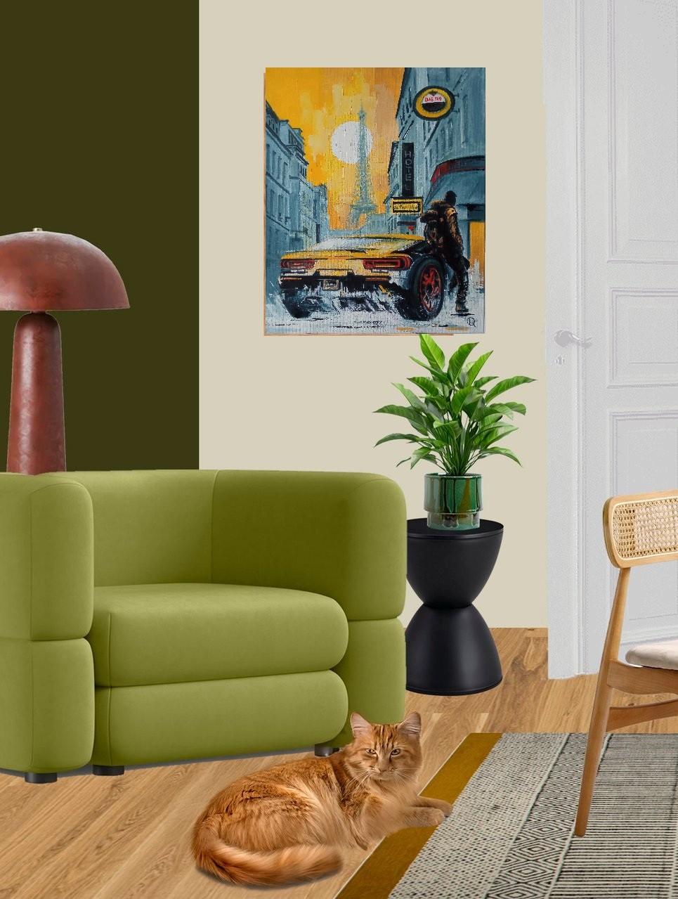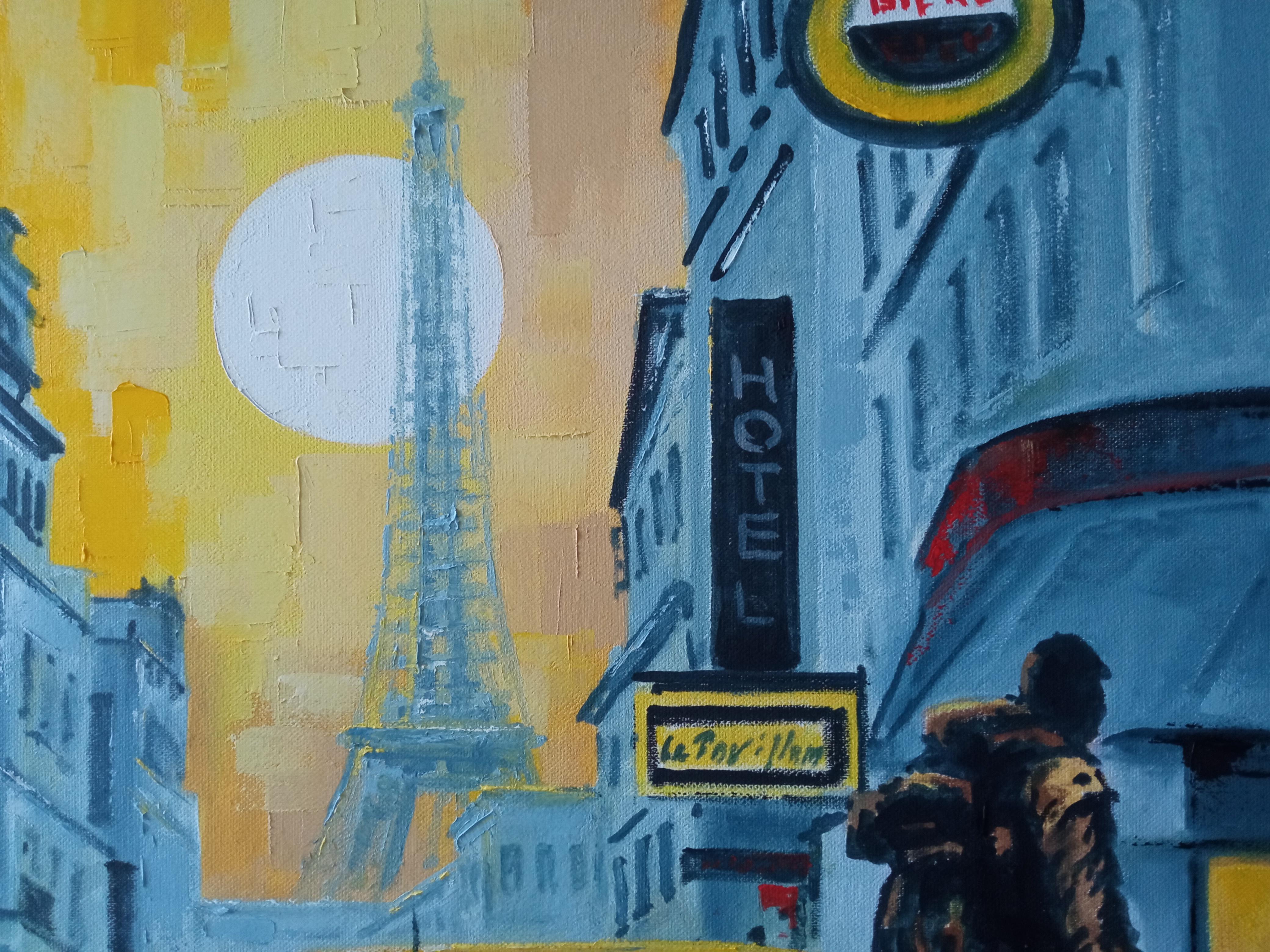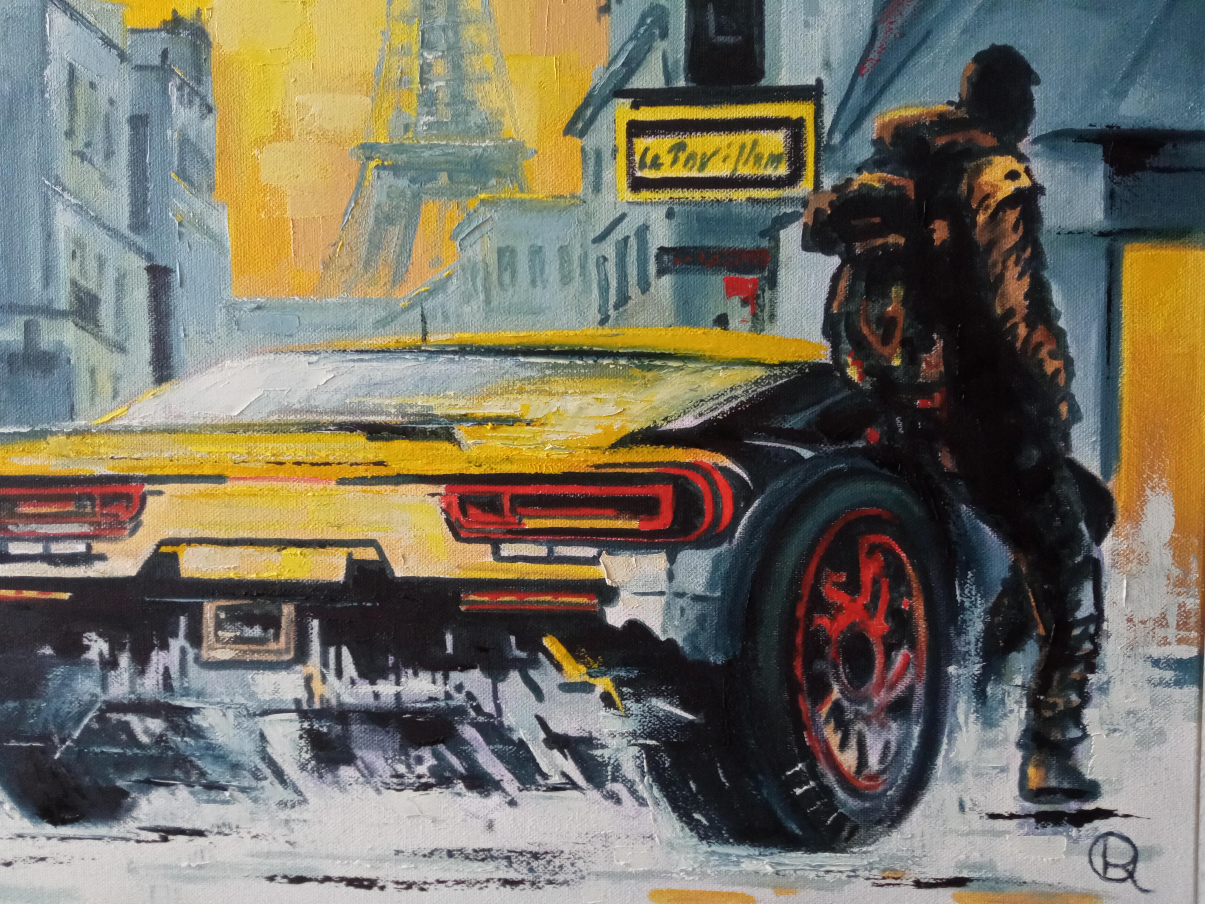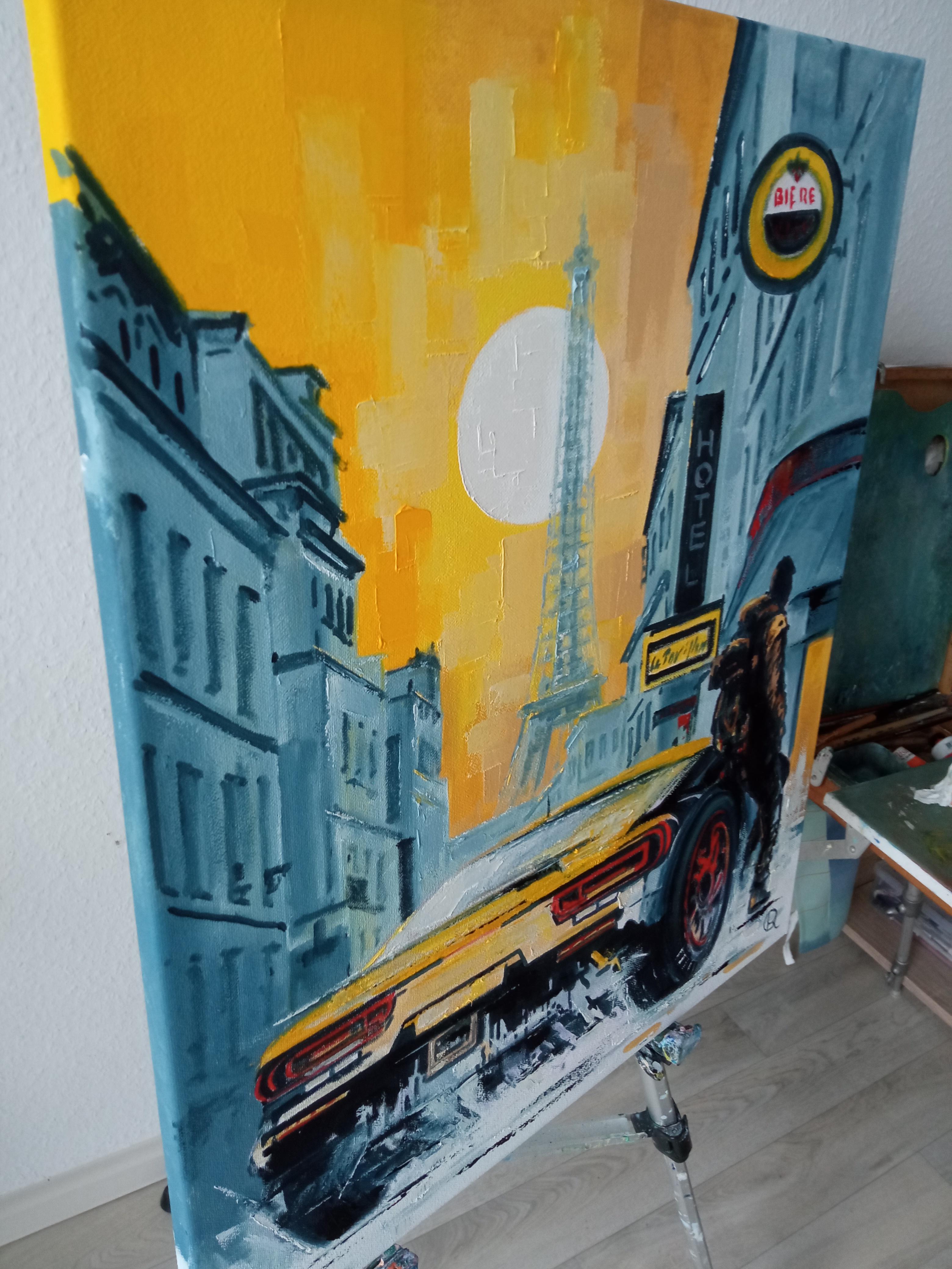 Das Gemälde fängt einen filmischen Moment ein, der von Bewegung und Vorfreude geprägt ist. Vor dem Hintergrund eines goldenen Sonnenuntergangs und der Silhouette des Eiffelturms steht eine einsame Figur neben einem futuristischen Auto, als würde sie am Rande eines Traums innehalten. Paris erscheint nicht nur als Stadt, sondern auch als Symbol der Sehnsucht und des Strebens.