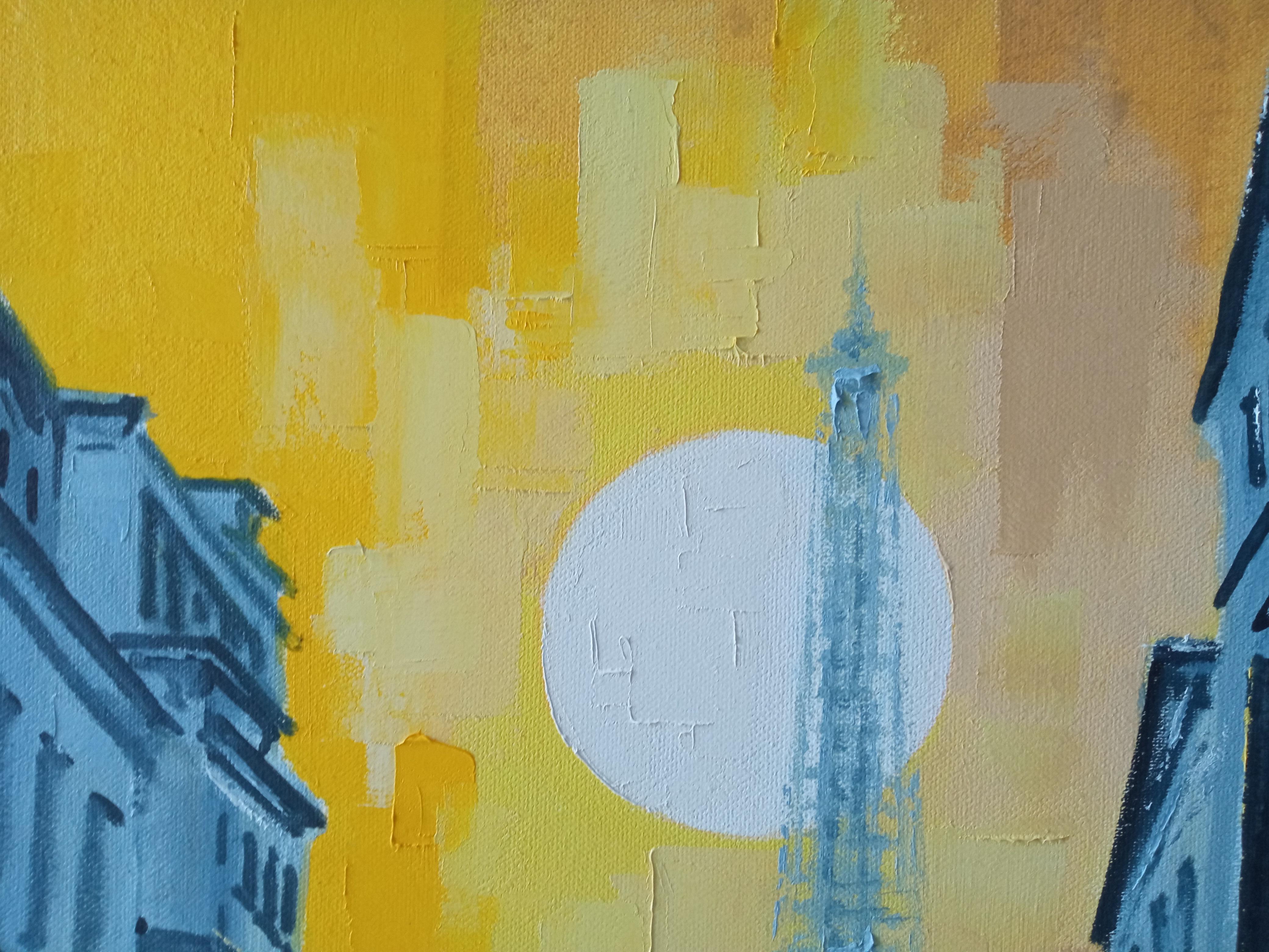 Der Kontrast zwischen den kühlen Tönen der Architektur und dem warmen Leuchten des Himmels erzeugt eine Spannung zwischen Realität und Fantasie. Die Künstlerin verbindet urbane Energie, menschliche Entschlossenheit und einen Hauch nostalgischer Romantik - alles, was Paris zu einer ewigen Quelle der Inspiration macht.