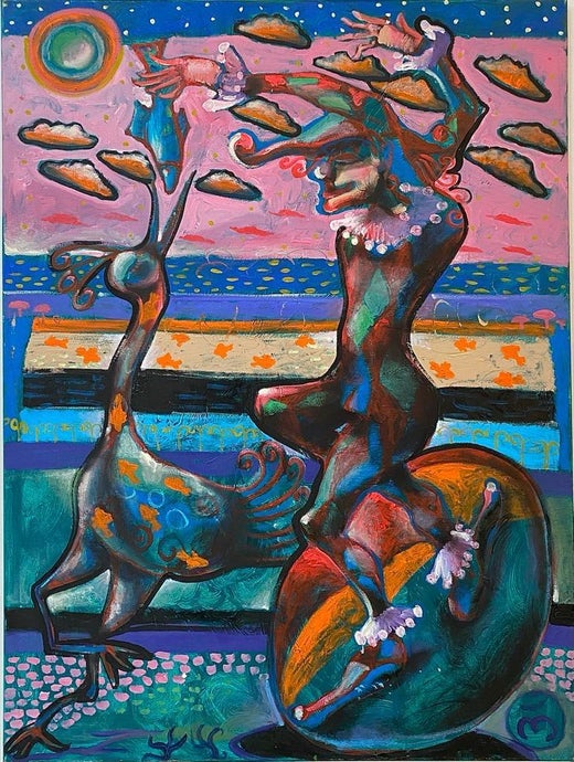 Ramaz Chantladze ist ein georgischer Künstler, der 1960 geboren wurde und in Tiflis, Georgien, lebt und arbeitet. Er studierte an der Jacob Nikoladze School of Art. Von 1979-1985 studierte er an der Staatlichen Kunstakademie Tiflis. Seit 1997 ist er Mitglied der Union of Artists of Georgia. Ramaz Chantladze, ein interessanter und vielseitiger Maler, hat die Aufmerksamkeit der Kritiker schon zu Beginn seiner Karriere mit seinen Werken auf sich gezogen. Er definiert sich durch eine besondere Vision und individuelle Art. Er hat während seiner gesamten Karriere nach kreativen Wegen gesucht, nicht nur in der Kunst, sondern auch in der Performance und den experimentellen Maltechniken. Jeder Künstler hat seine eigene spezielle Ausdrucksmethode, die sich in seiner Kunst am häufigsten wiederfindet. Die wichtigste Ausdruckssprache der Werke von Ramaz Chantladze ist die Farbe. Die führende Rolle der Farben wird vielleicht am besten in seinen zahlreichen Stillleben und vor allem in seinen "Porträt"-Darstellungen von Clowns dargestellt. Erwähnenswert ist auch die Serie von Bildern mit Tieren und Feenvögeln. Die gesamte Oberfläche der Gemälde basiert auf einer Art Farbenspiel, mal sind es ganz flächige, fleckige Ausdrücke, mal erscheinen im Gegenteil mosaikartige Farben, die in ihrer Räumlichkeit an die Technik des Pointillismus erinnern. Darüber hinaus lösen die Ausdruckskraft klarer Farben und das Zusammenspiel lebendiger Töne die Assoziation von Vitrage Art aus. Von großer Bedeutung sind auch bunte Konturbilder, die eine ganze farbige Fläche bilden. Die vertikalen Ströme und spiralförmigen Bewegungen der Konturen entsprechen den Kompositionsbildern und farbigen Rhythmen jedes einzelnen Falles. Vielleicht ist das der Grund, warum der Künstler bei jedem, der seine zahlreichen Werke betrachtet, ein seltsames Gefühl auslöst. Die Formen und Gegenstände in seinen Gemälden werden durch die Konturen vor den Augen des Betrachters irgendwie vereinheitlicht.