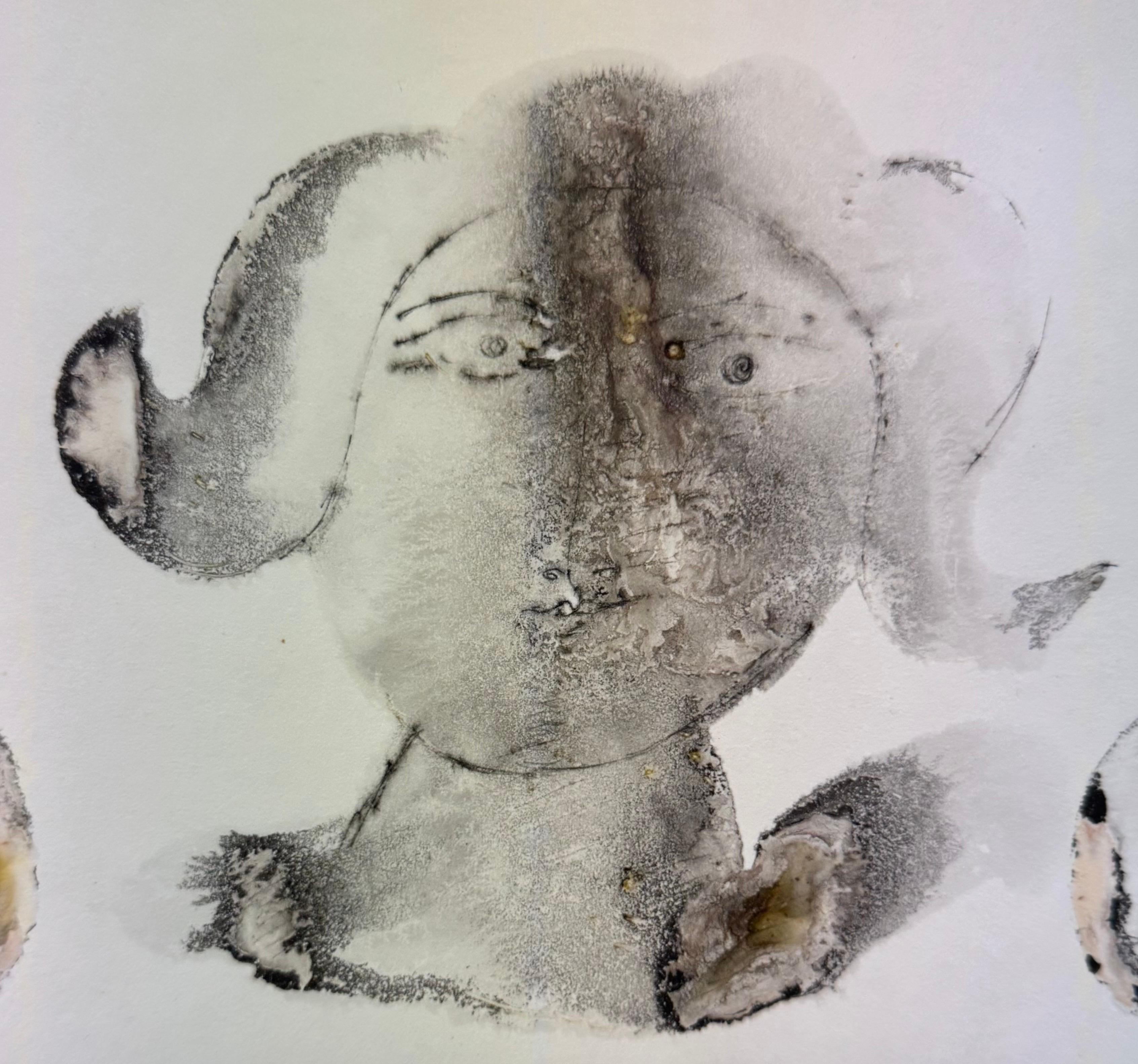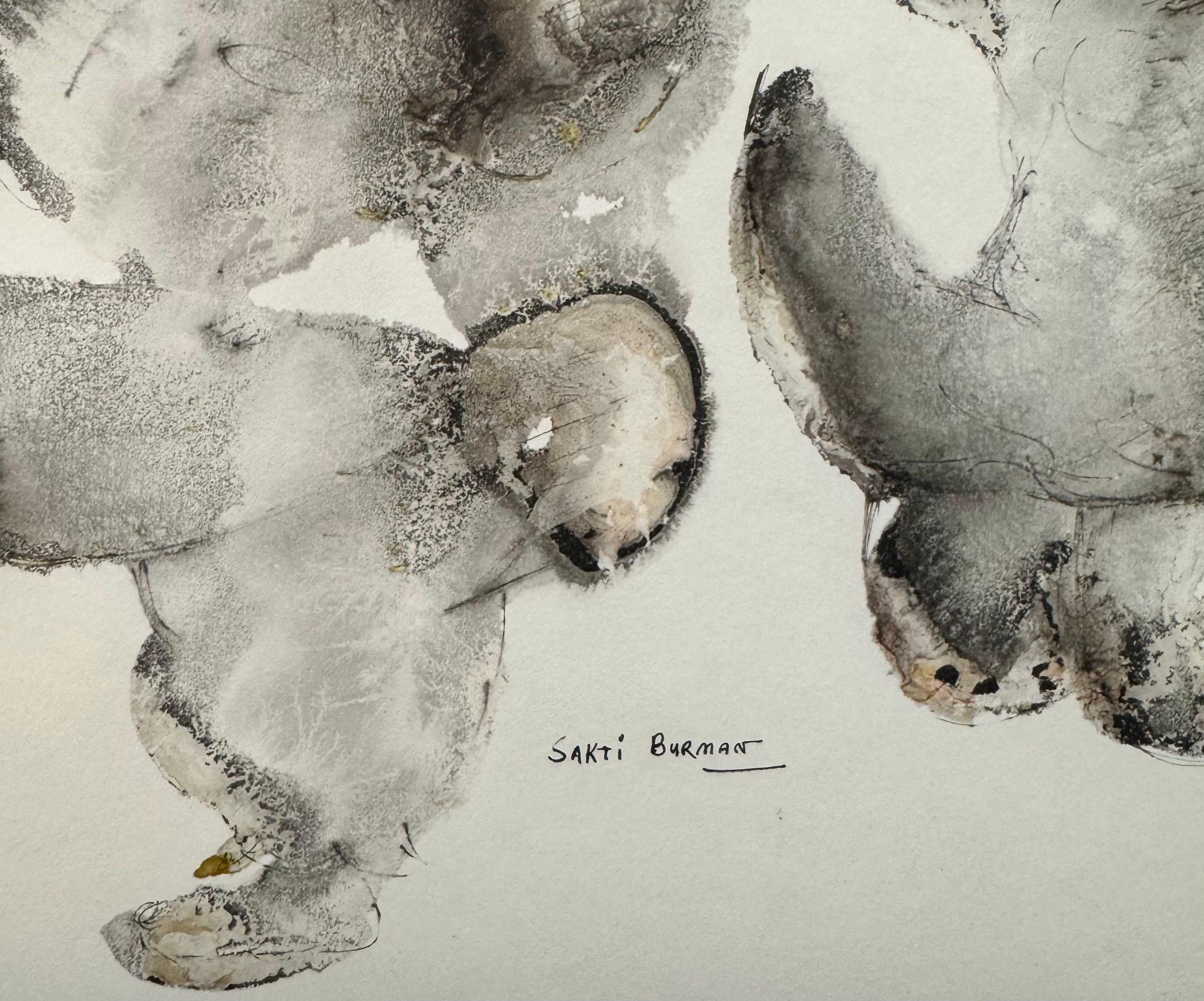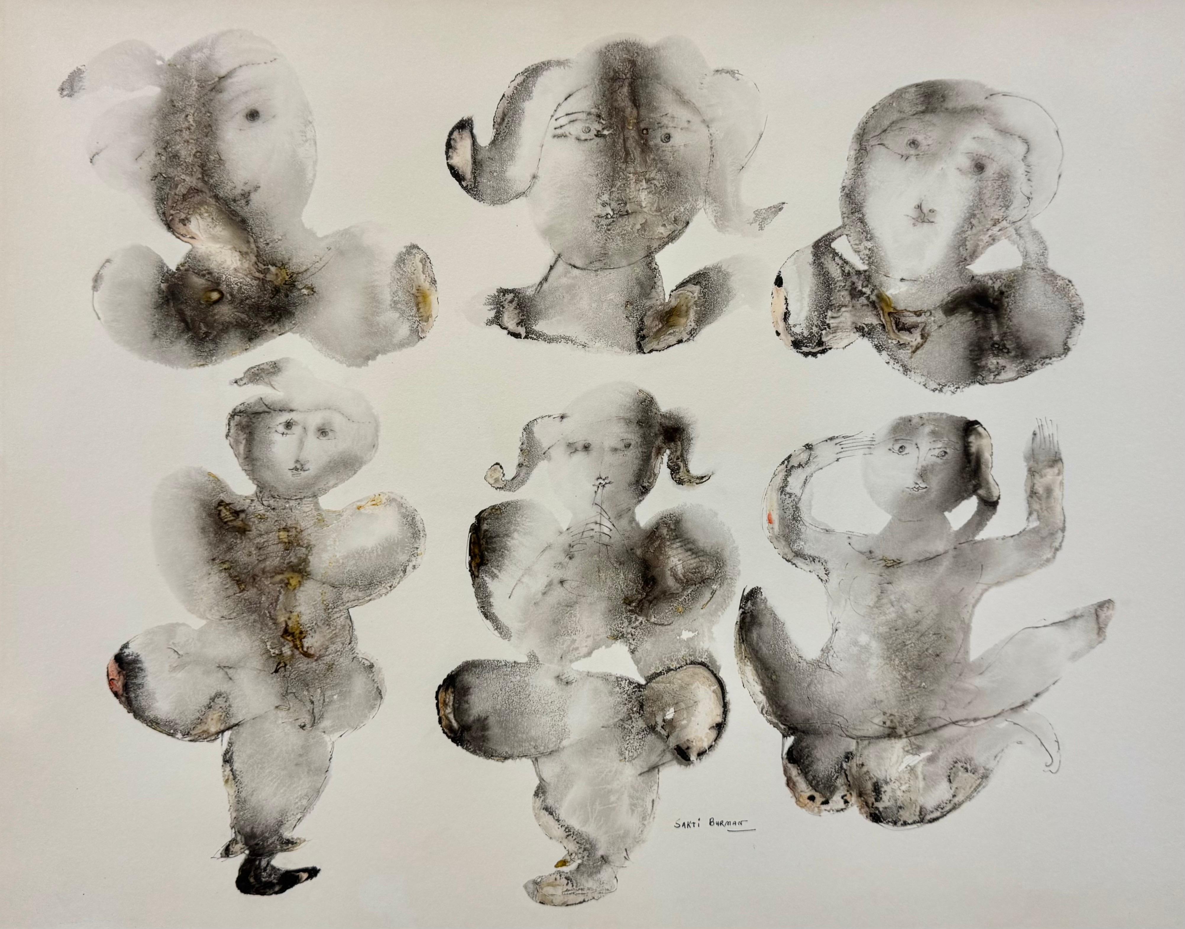 Die Formen sind täuschend einfach, aber unglaublich aussagekräftig. Burman baut sie mit gedämpften, rauchigen Tuschewaschungen auf, die durch einen leichten Hauch von Ocker und Siena zart verstärkt werden. Ihre Anatomie ist fließend - die Gliedmaßen erscheinen übertrieben oder eingefallen, und die Gesichter sind mit einer zarten, kaum wahrnehmbaren Zeichenkunst wiedergegeben. Sie wirken eher wie Geister oder Archetypen als wie echte Menschen, als ob jede Figur einem alten Epos oder einem kollektiven Unterbewusstsein entsprungen wäre. Sie scheinen in der Leere zu schweben, nicht durch Schwerkraft oder räumliche Zwänge verankert, sondern nur durch die innere Logik von Birmans privater Mythologie zusammengehalten.