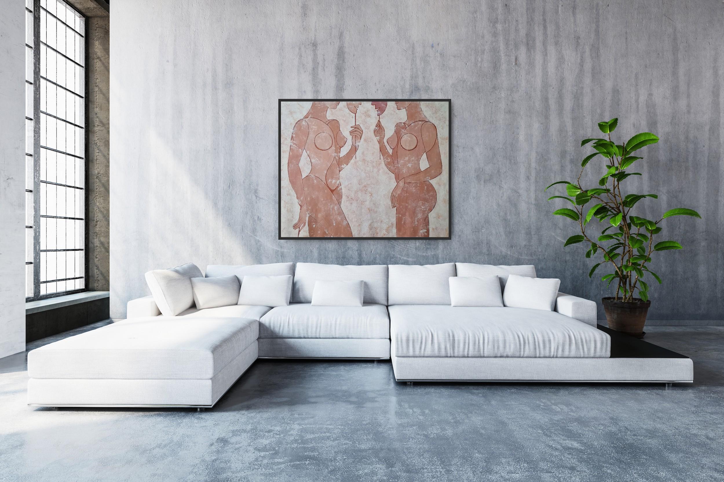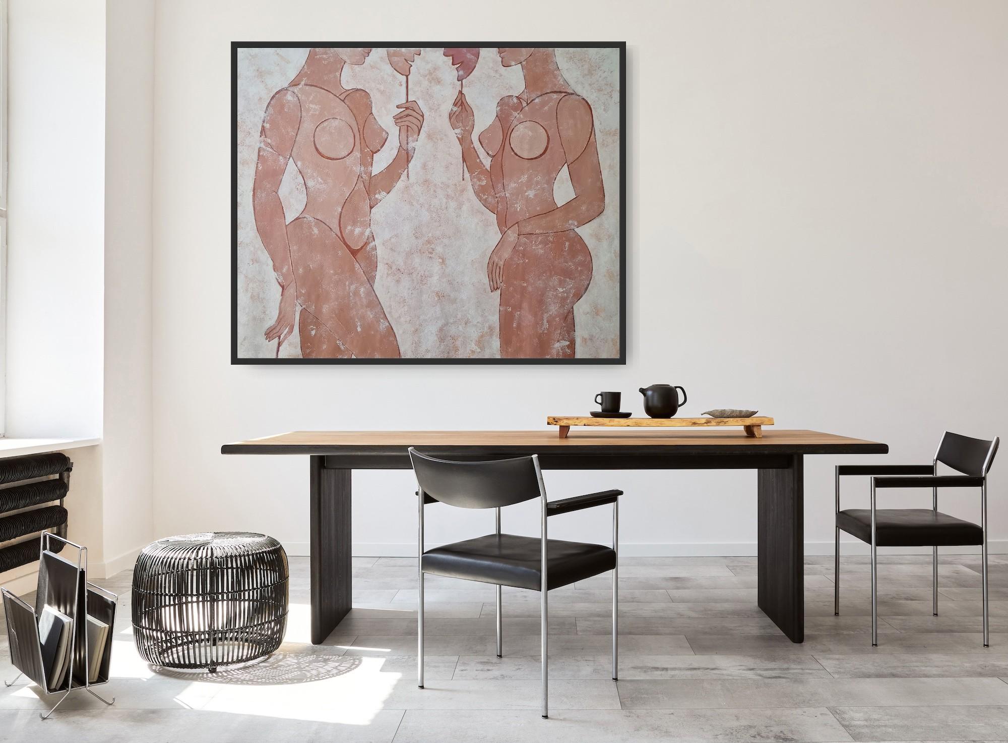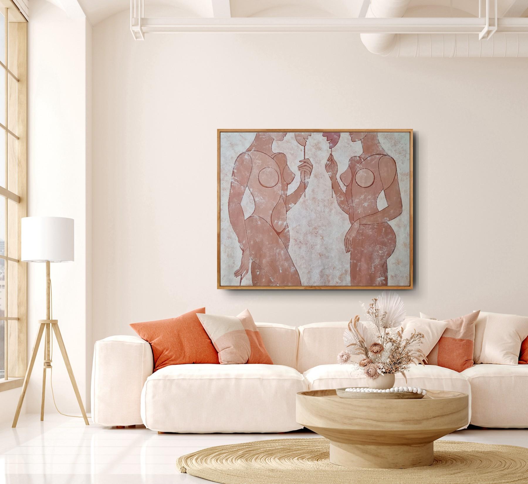 Alla Bartoschtschuks "Recall" ist ein handgefertigtes Original-Ölgemälde, das eine nackte weibliche Figur in Gesellschaft lachender blauer und violetter Frauen zeigt, wobei einige Gl...