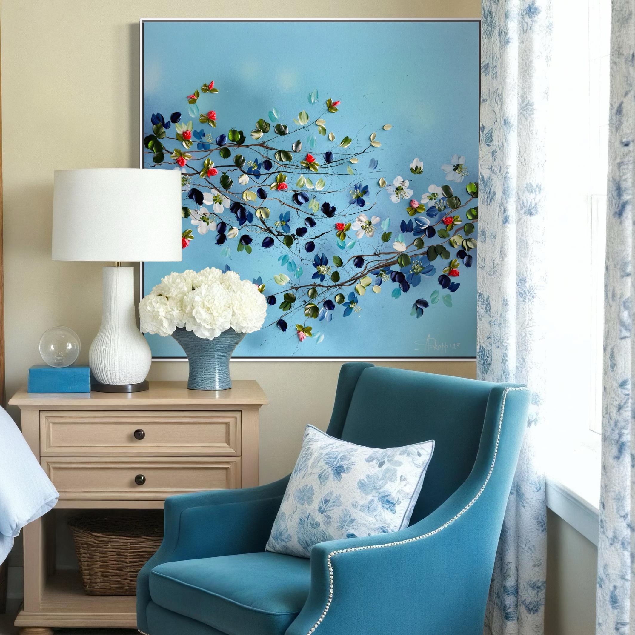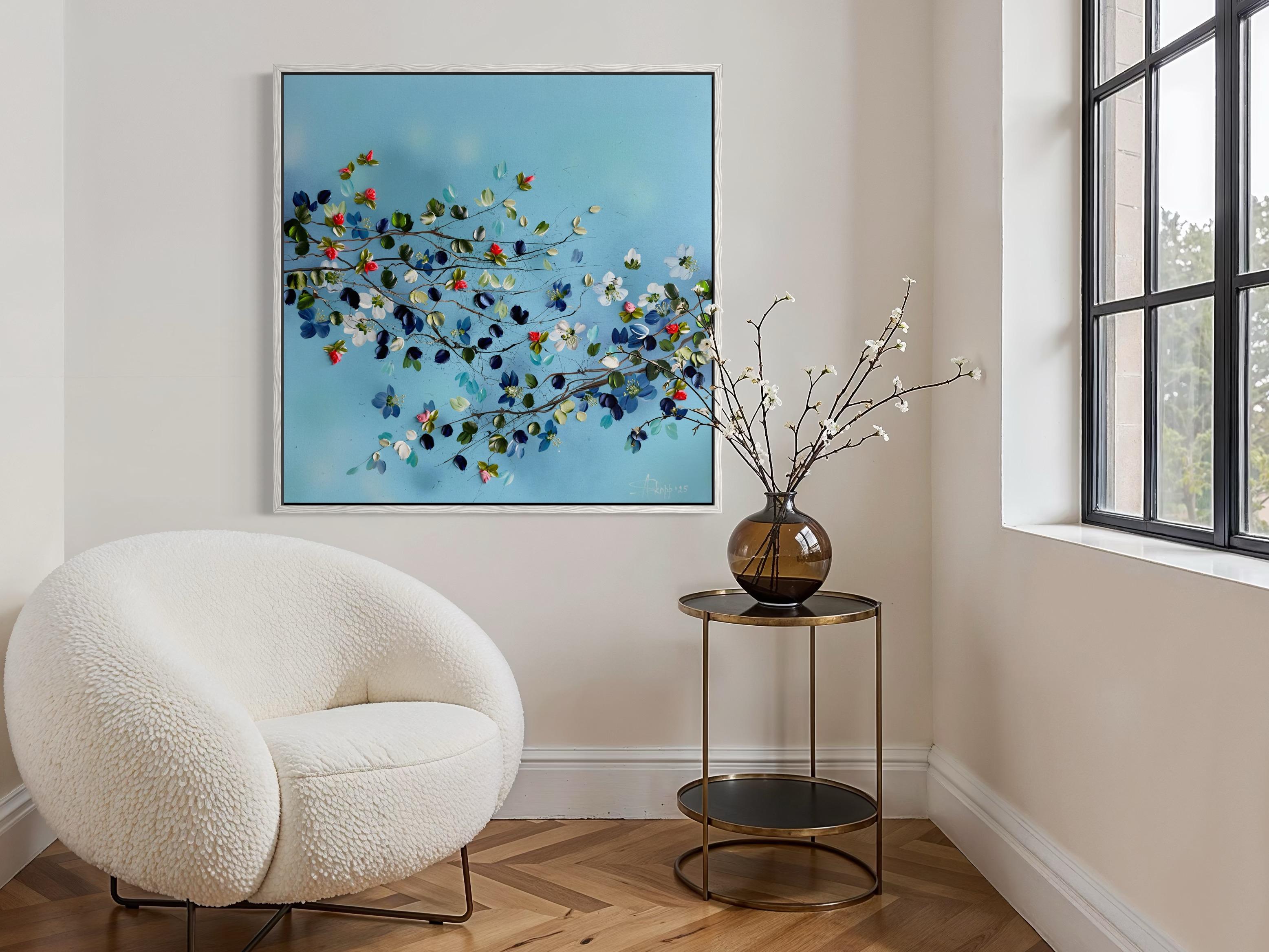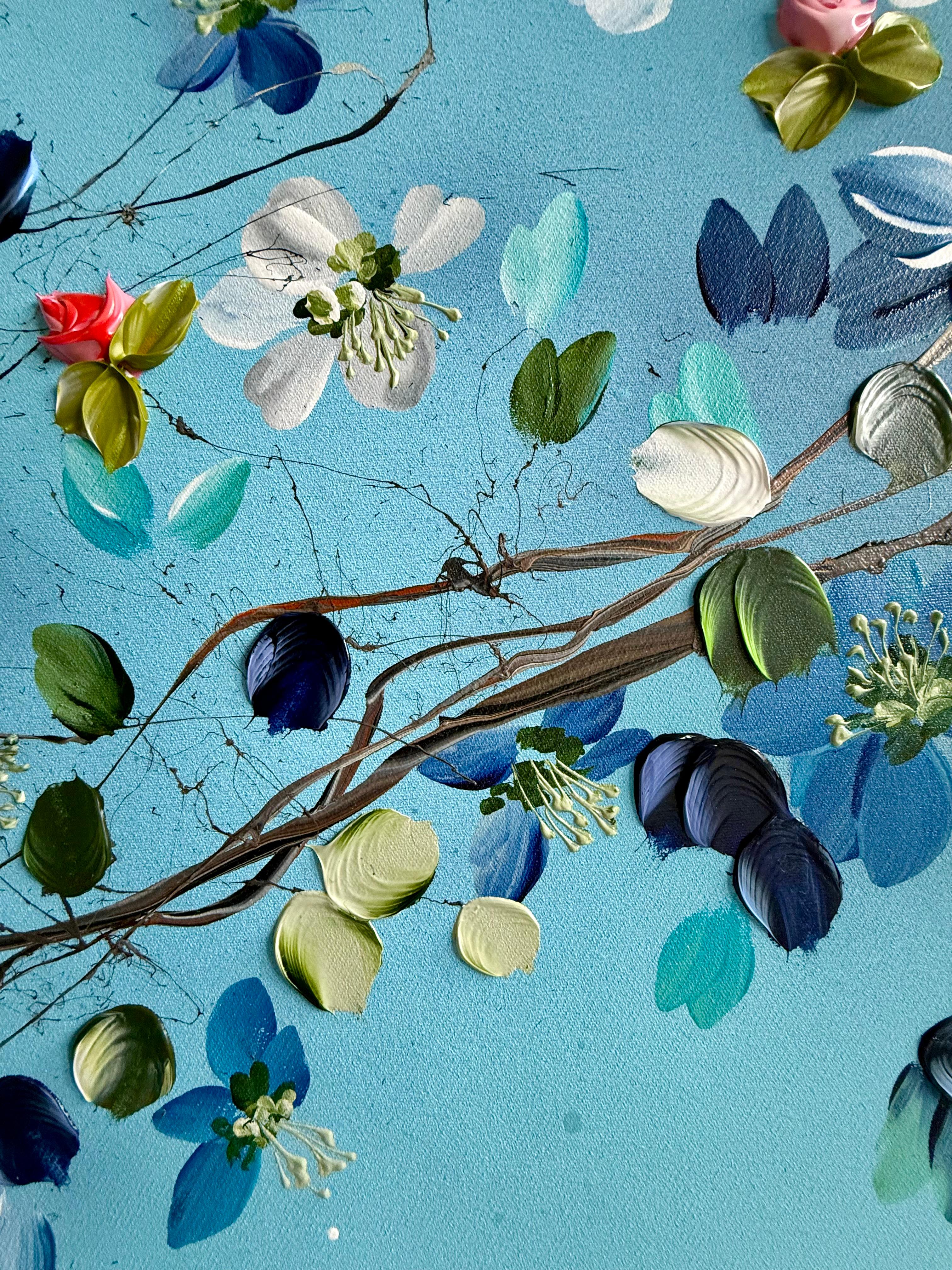 Blue Stillness spiegelt ein Gefühl der Ruhe und Klarheit durch zarte Blumenformen wider, die vor einem ruhigen blauen Hintergrund schweben. Zweige schlängeln sich sanft durch die Komposition und tragen Blüten in Weiß-, Marine-, Rosa- und zarten Türkistönen - ein sanfter Dialog zwischen Luft, Licht und Stille.