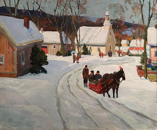 Stowe Vermont Village Sleigh Ride, figurative Winterlandschaft aus der Mitte des Jahrhunderts