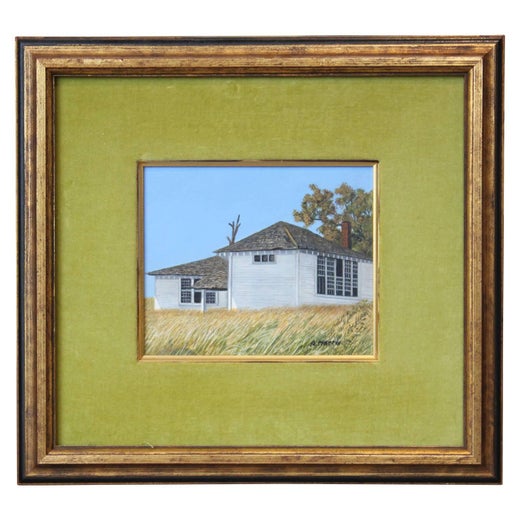 Architektonisches Landschaftsgemälde von Anthony V. Martin, das ein weißes Haus mit einer schönen grünen Samtmatte und einem goldenen Rahmen zeigt.
