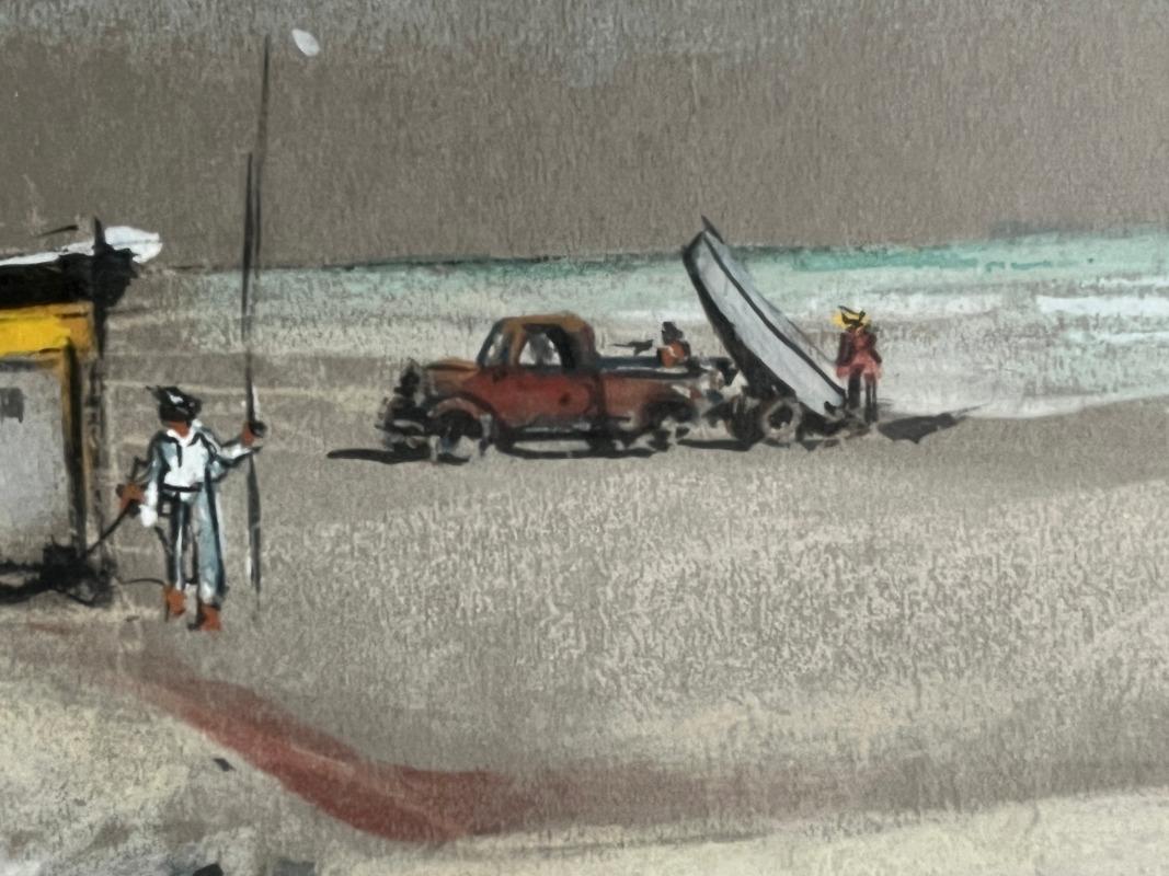 Beach-Szene aus der Mitte des Jahrhunderts, Öl auf Karton in Originalrahmen, signiert, Nachkriegsstil
