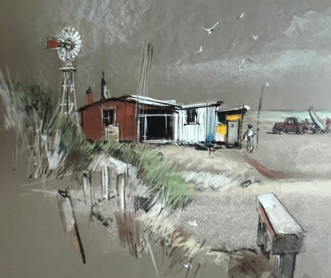 Dieses Kunstwerk "Texas Cpast Line with Shack" 1964 ist ein Aquarell auf Papier des bekannten texanischen Künstlers Jim Jones, 1922-1999. Es ist in der rechten unteren Ecke vom Künst...