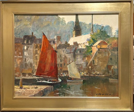 Honfleur von Charles Movalli fängt den Charme der französischen Hafenstadt wunderbar ein. Im Hafen liegt ein rotes Segelboot, daneben ein kleineres Boot mit weißen Segeln, im Hinter...