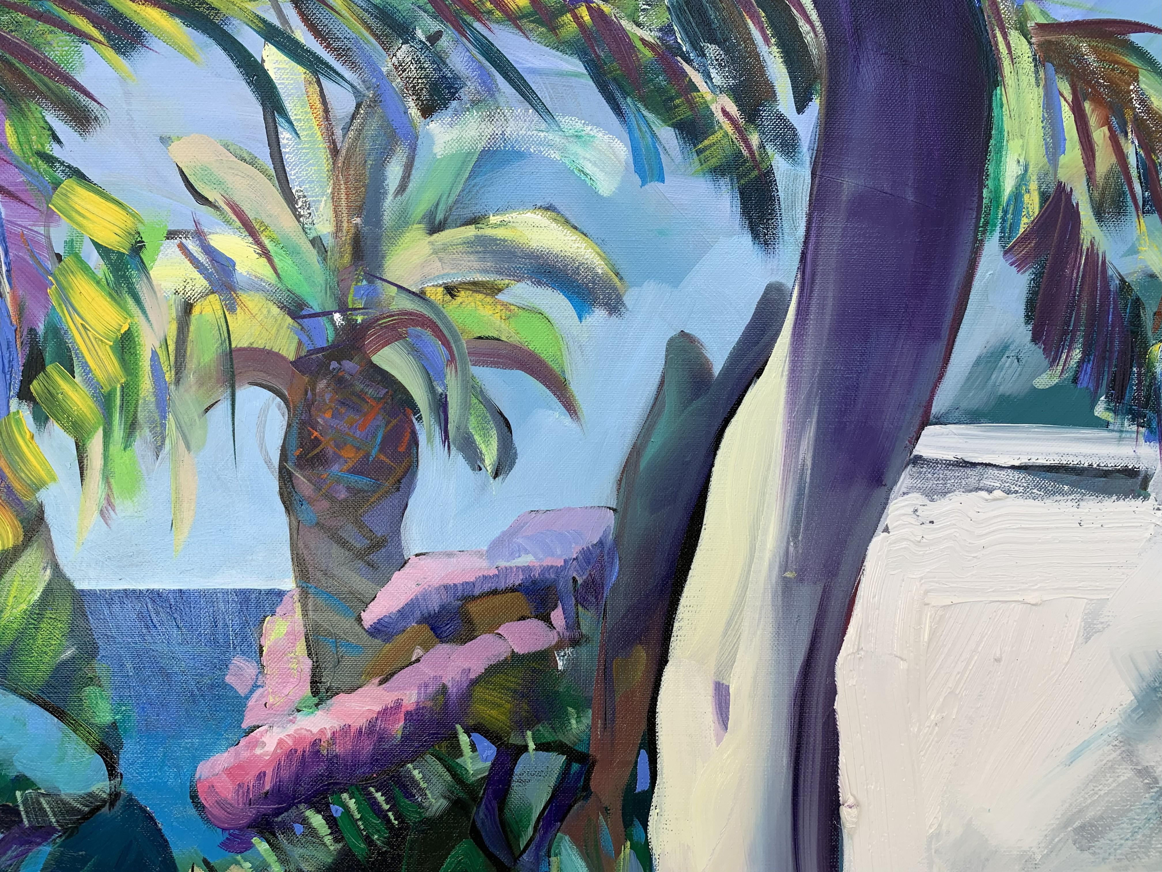 The flow of botanical splendor bursts in lavish color in the foreground while the palms and trees open the view to distant mountains in this tropical painting.