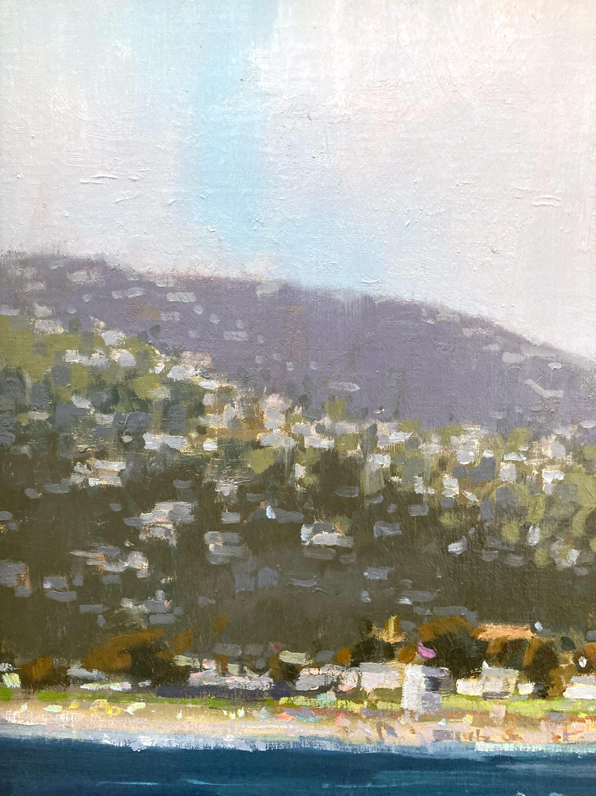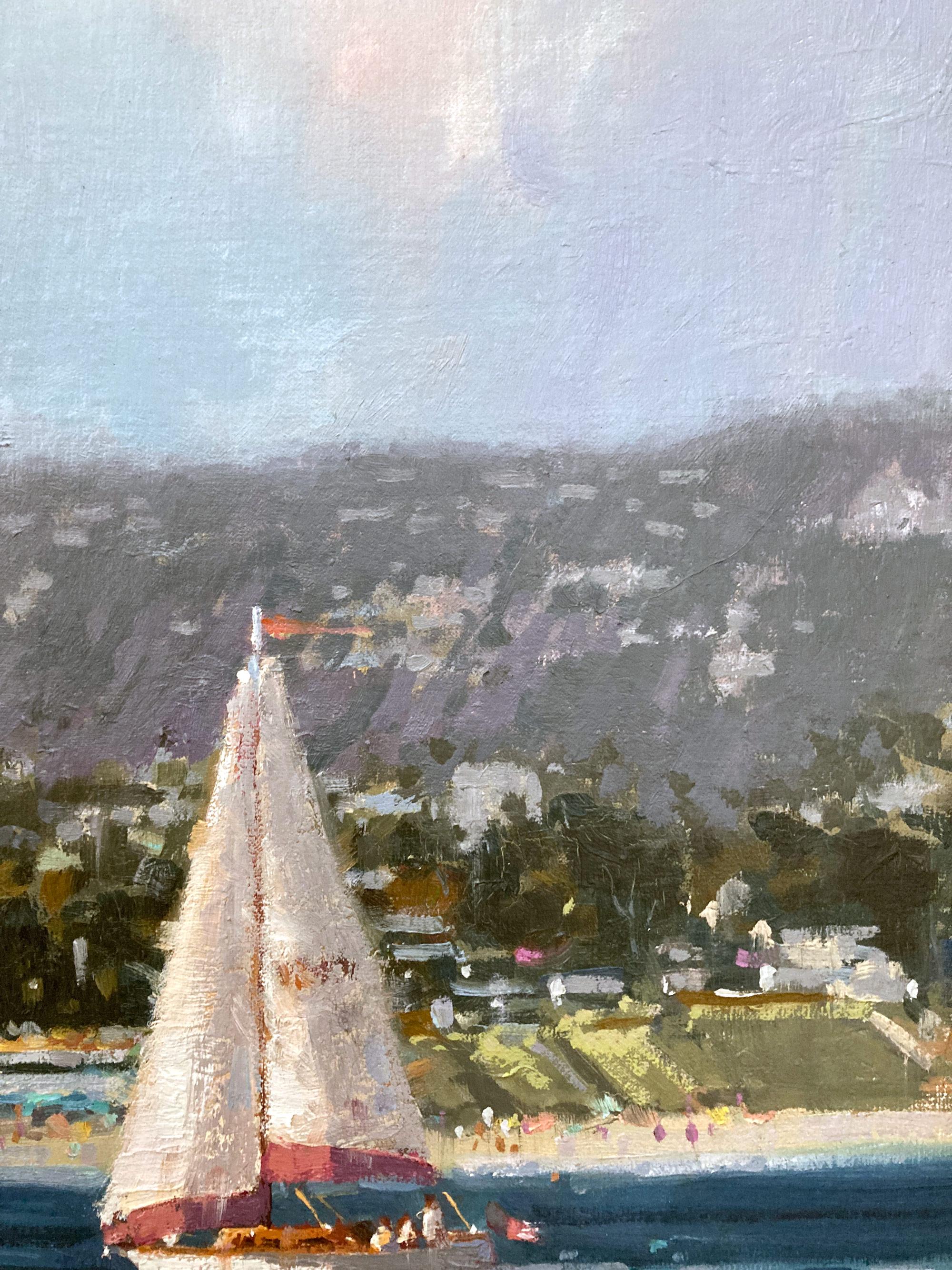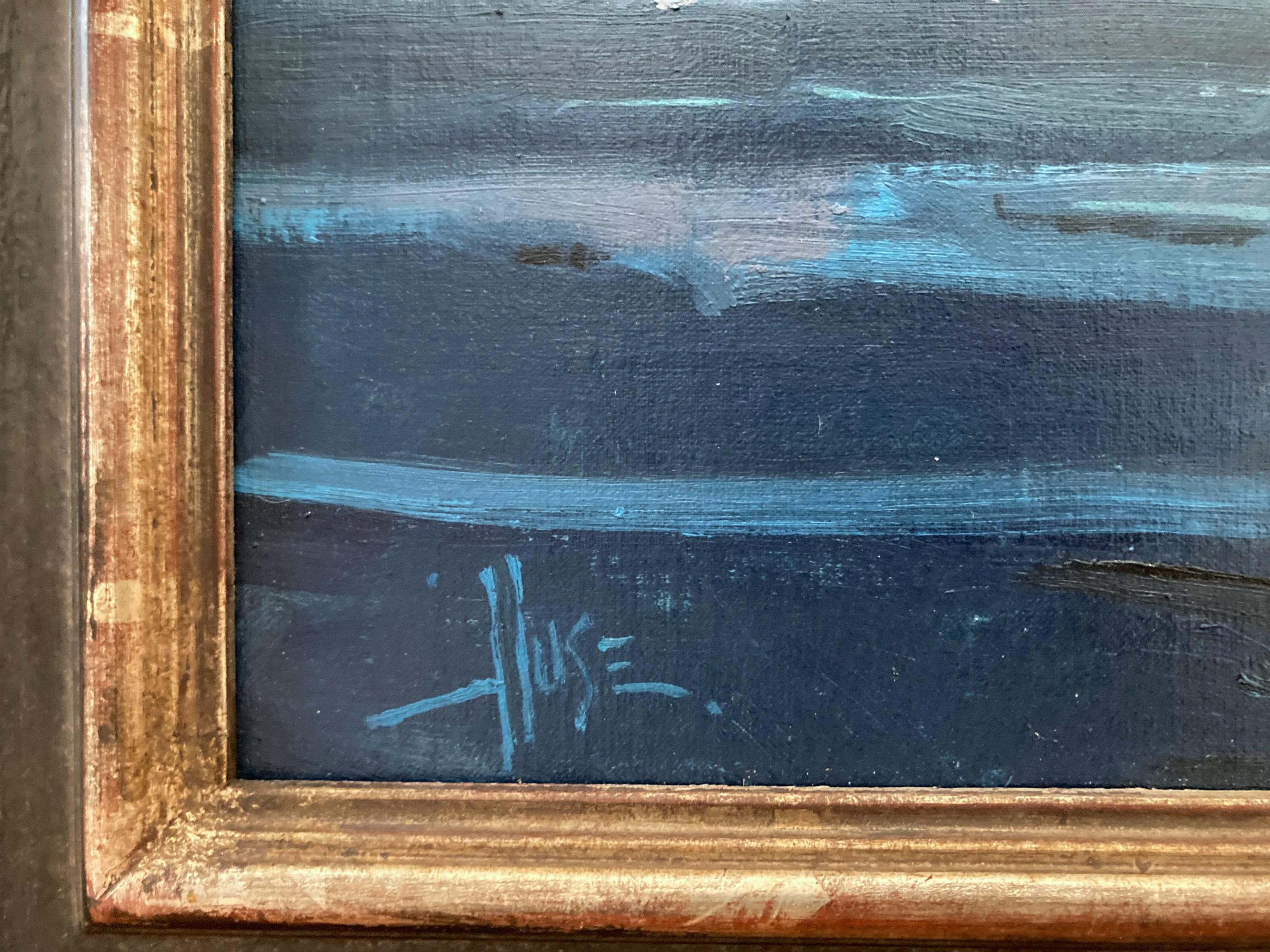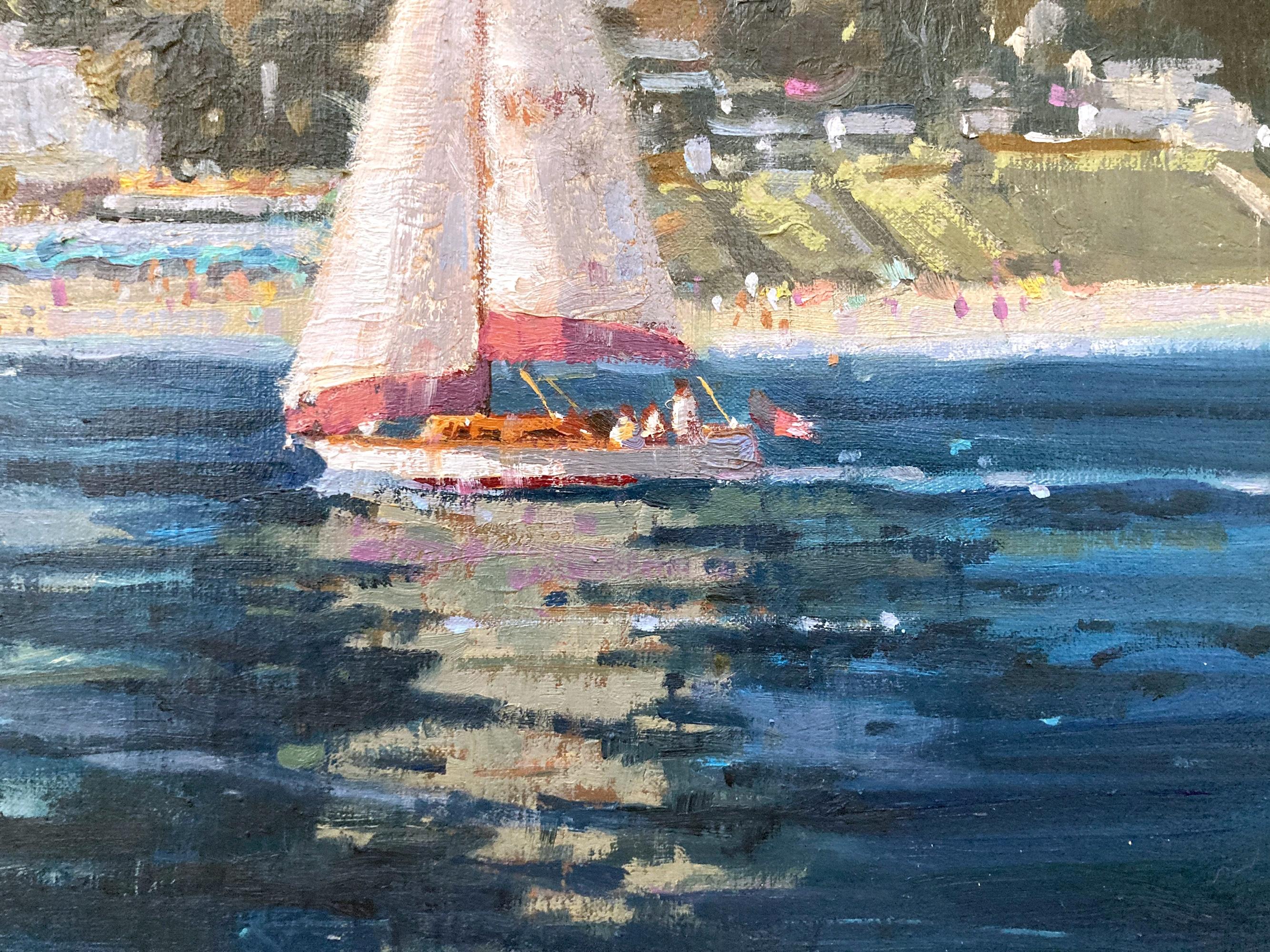 Ein meisterhaftes Ölgemälde, das eine Szene am Strand von New Port mit einem Segelboot zeigt, das durch das schimmernde Wasser fährt. Bei dieser Szene handelt es sich um ein Pleinairbild, da Huse dafür bekannt ist, auf ihrem Boot mit Blick auf das