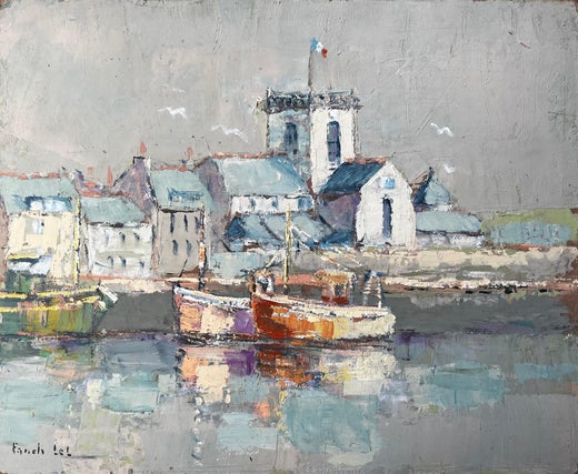 Alle anzeigenFranzösische impressionistische Hafenszene des Impressionismus mit Moored-Fischbooten von Fanch Lel
