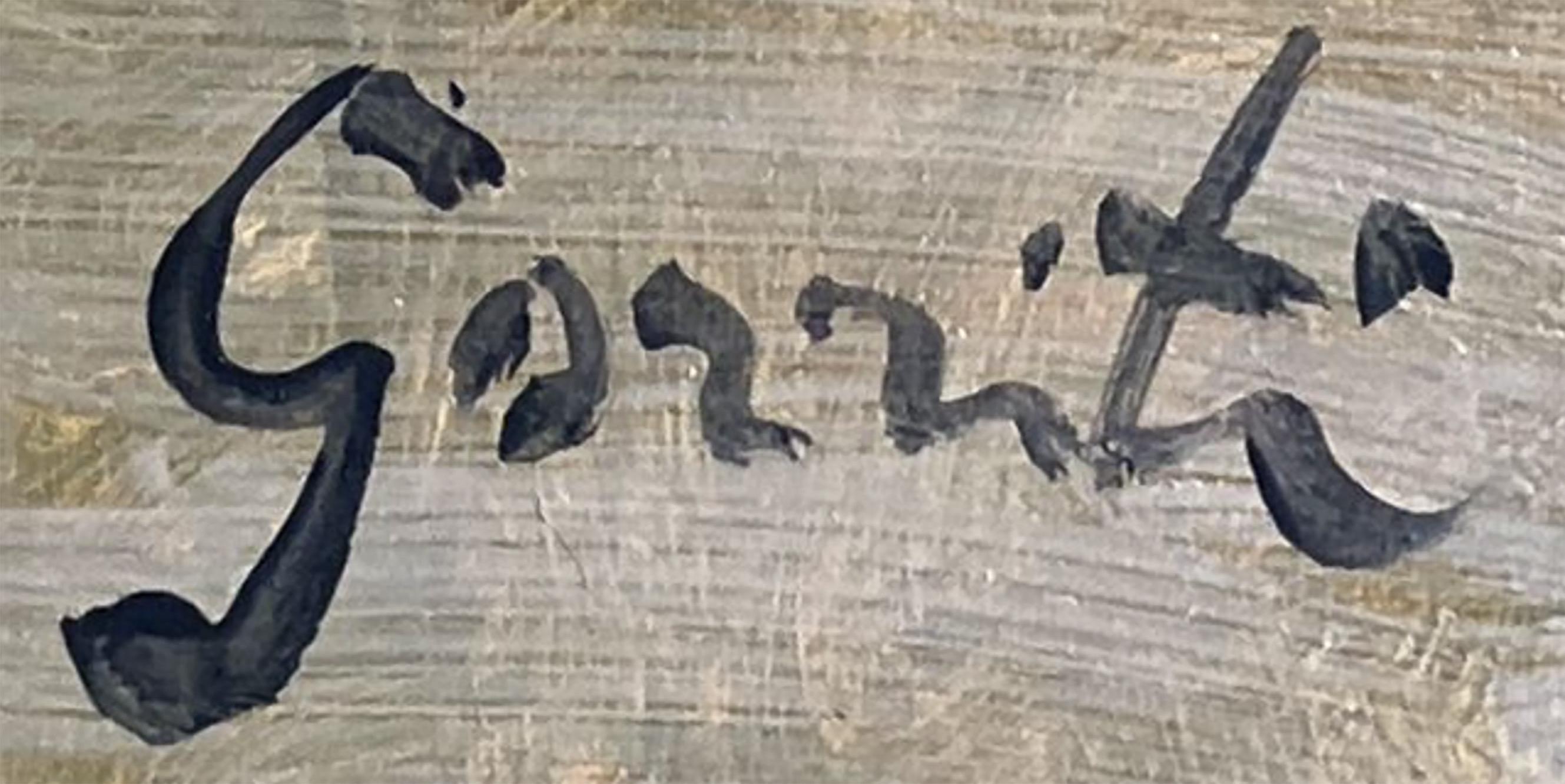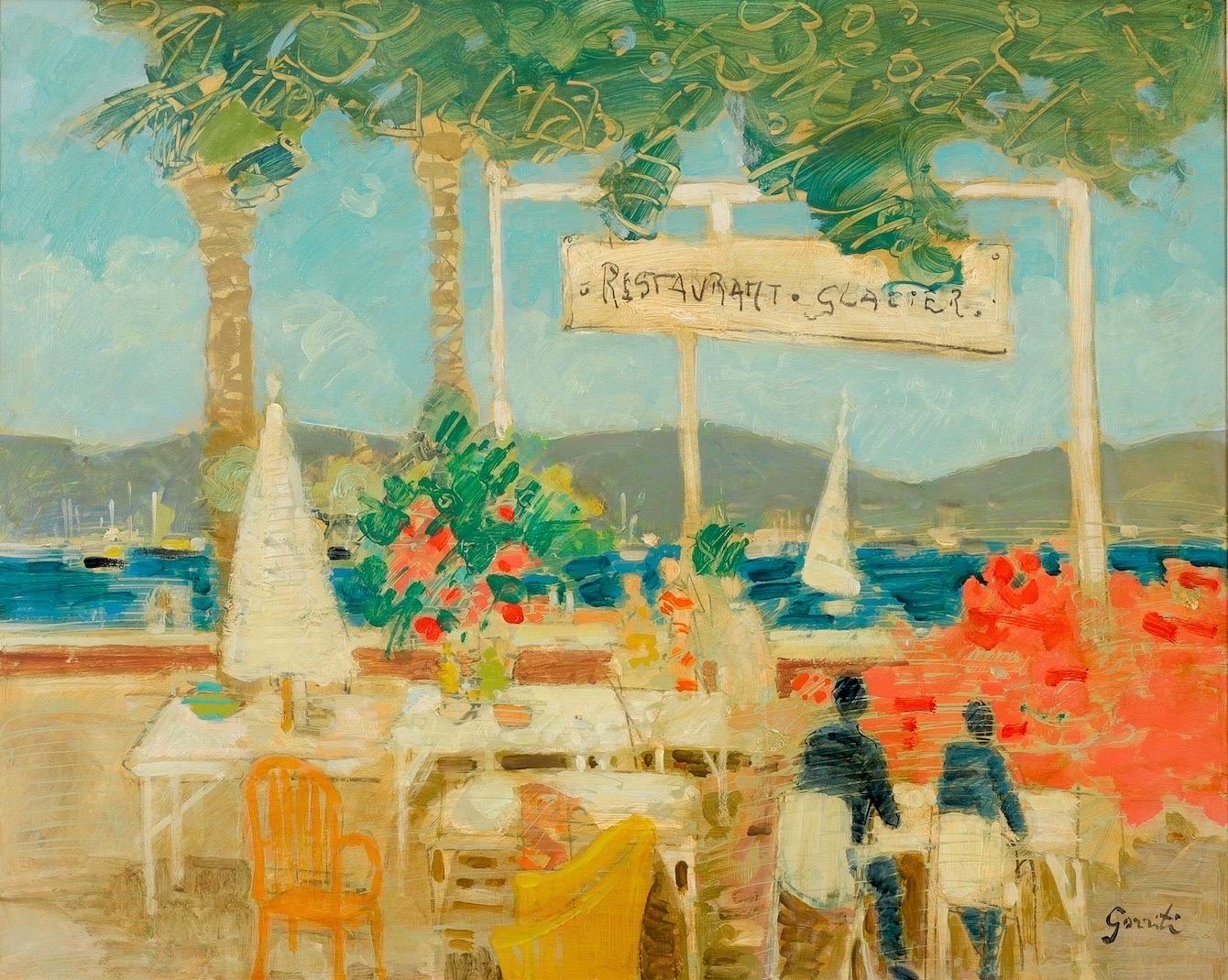 Gorritis Pinselführung hat eine lebendige Kurzschrift, die den sinnlichen Charme eines Nachmittags am Meer einfängt. Segelboote treiben über die Bucht, die Luft scheint warm von reflektiertem Licht, und ein Paar von Figuren verweilt bei einem zwanglosen Essen unter dem Restaurantschild, das die Komposition verankert. Die ganze Szene wirkt wie ein improvisierter Moment der Freizeit, der in Farbe festgehalten wurde.