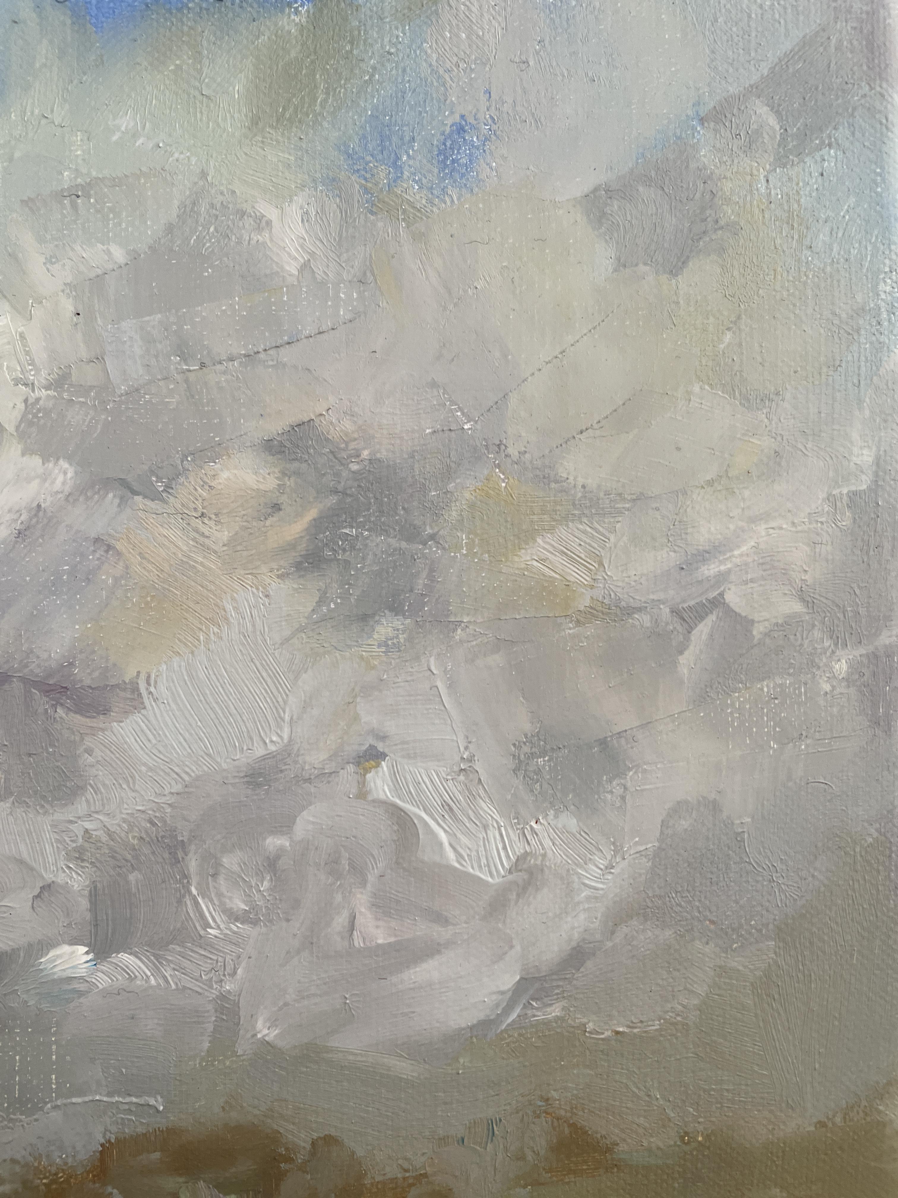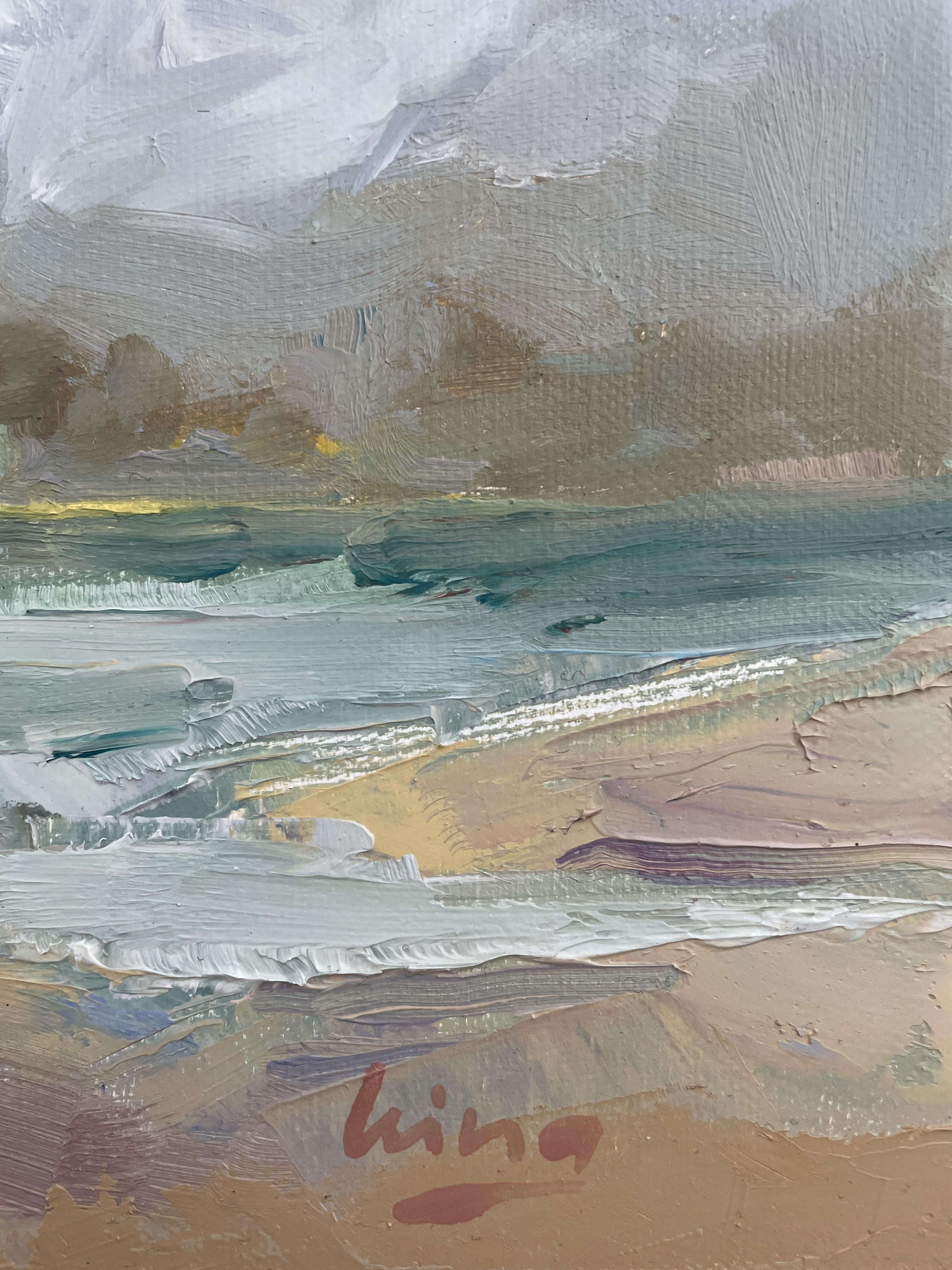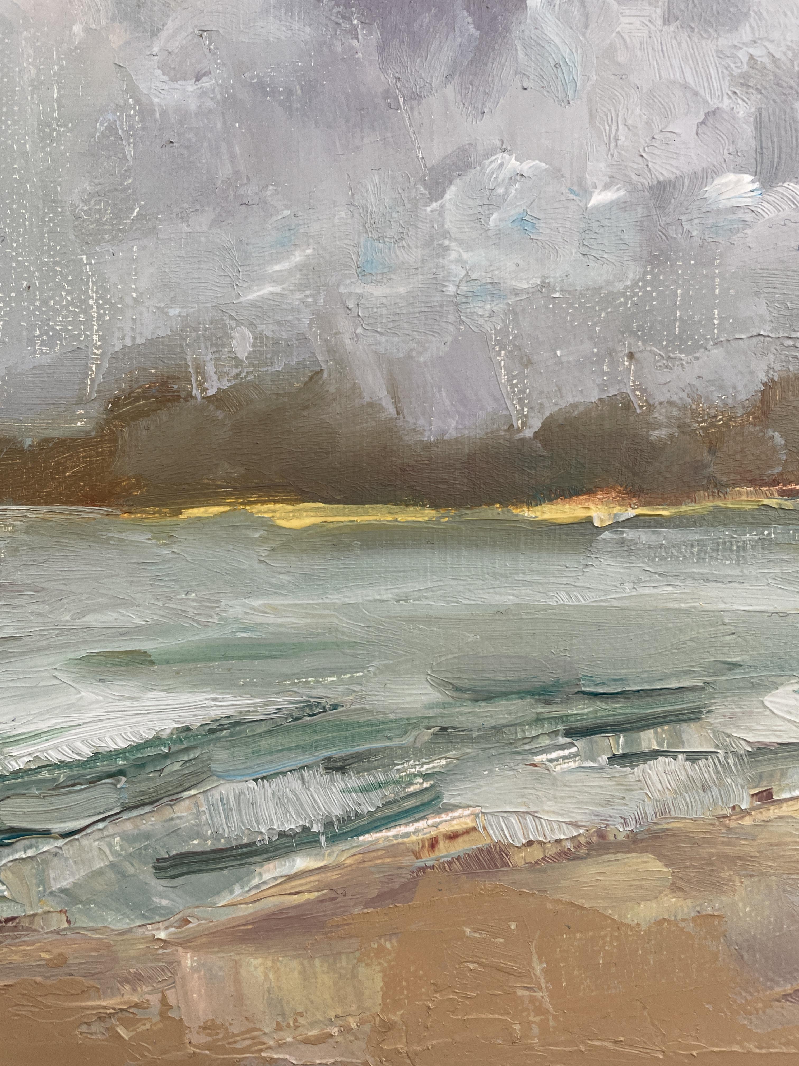 "A Storm That Never Came" ist ein fesselndes Pleinair-Ölgemälde, das während des Urlaubs des Künstlers in Indonesien entstand. Nach dem Leben gemalt (da die Künstlerin immer mit ihren Materialien reist), fängt es das flüchtige Licht und die sich verändernde Atmosphäre eines herannahenden Sturms ein, der schließlich vorbeizieht. Die strukturierten Pinselstriche erinnern an die Bewegung des Meeres unter einem dramatischen Himmel, wo sanftes Weiß und stimmungsvolle Grautöne in subtile Gold- und Türkistöne übergehen. Das sandige Ufer im Vordergrund verankert die Szene und verleiht dem kühlen, unruhigen Wasser Wärme und Kontrast. Dieses Werk spiegelt die tiefe Verbundenheit des Künstlers mit der Natur und die Spontaneität des Malens unterwegs wider - eine Erinnerung an die Schönheit, die in unsicheren Momenten liegt.