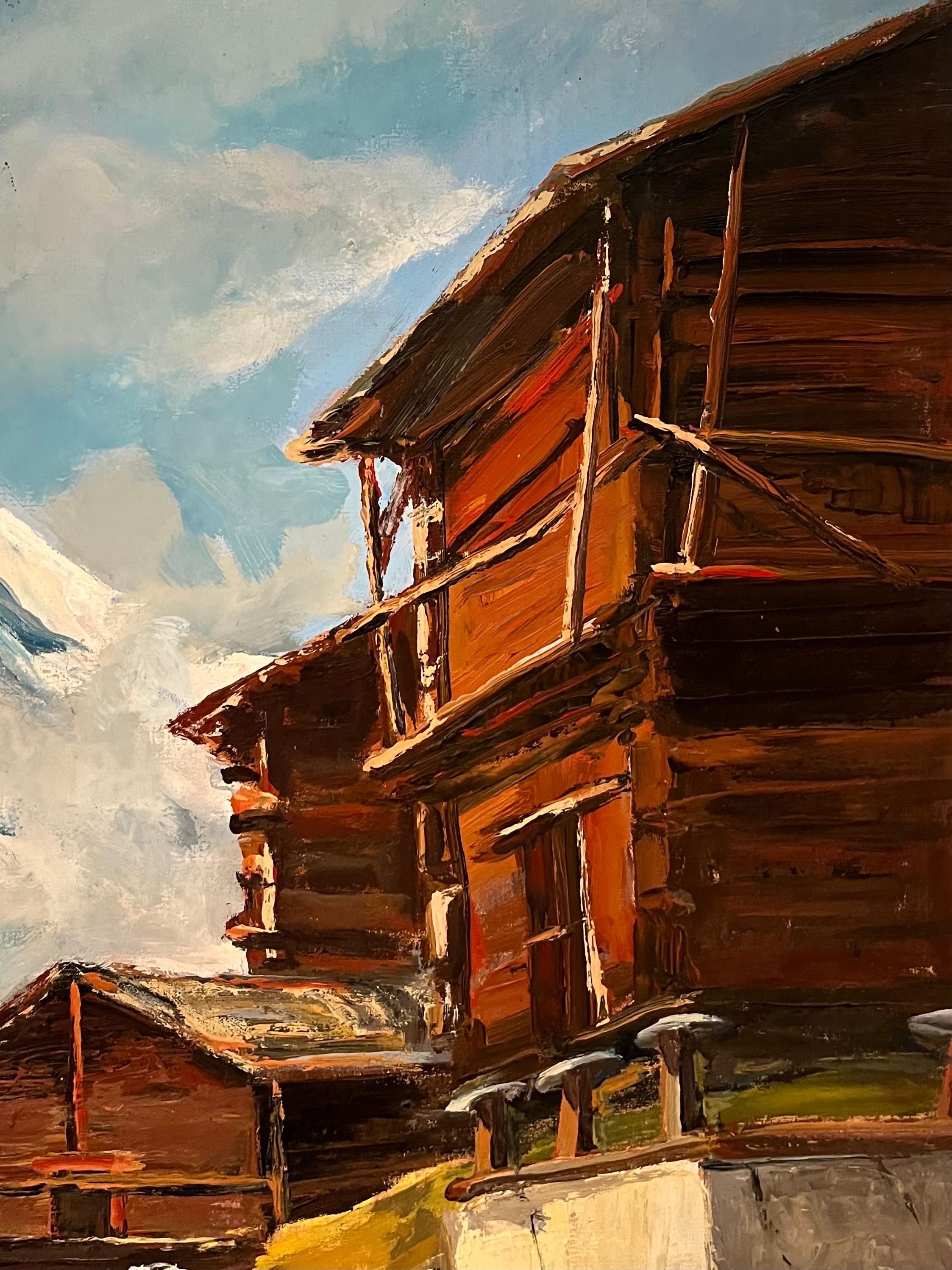 Original-Ölgemälde aus den 1970er Jahren, das ein kleines Chalet in den Schweizer Alpen zeigt, von Emma E. Meiklejohn (Amerika...