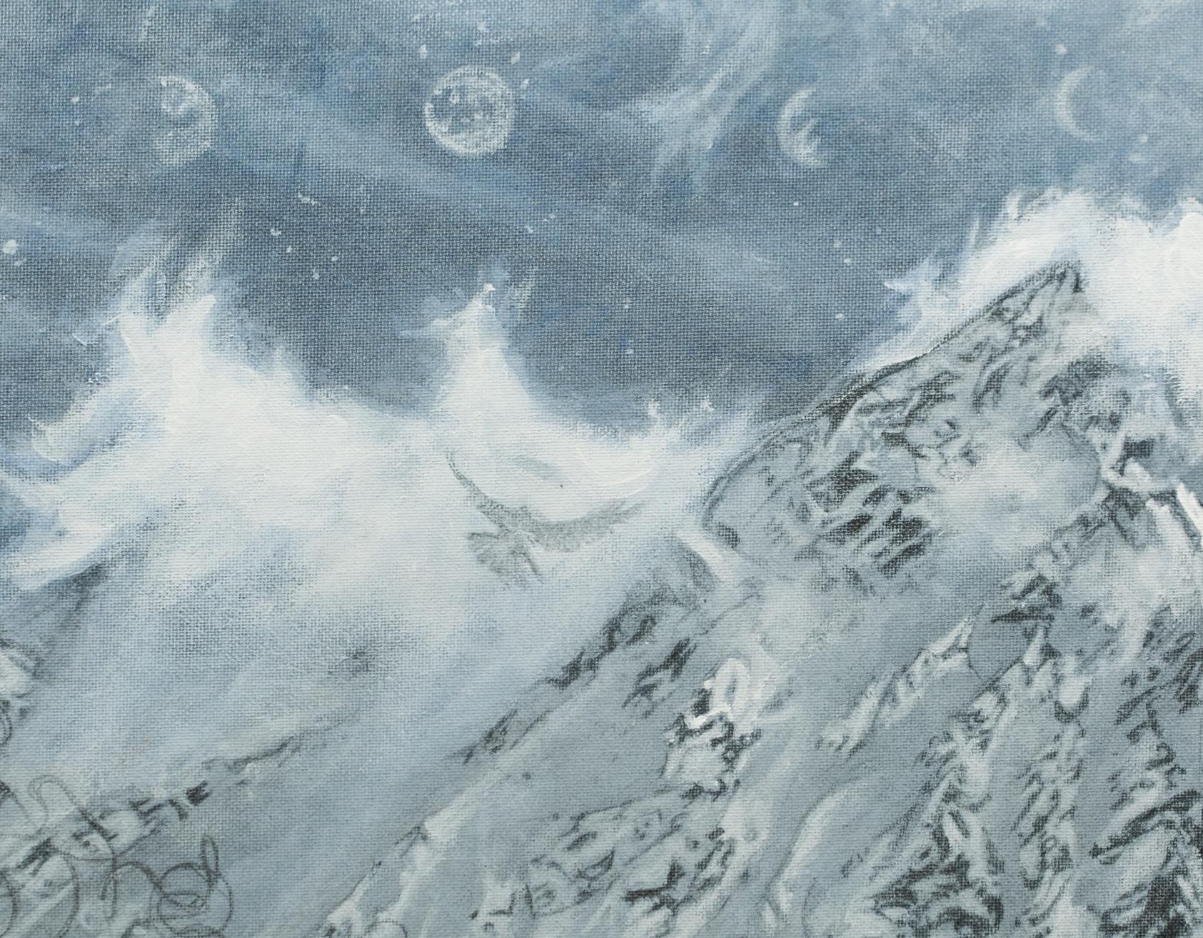 Dieses blaue, graue und weiße Landschaftsgemälde mit dem Titel "Time" ist ein Originalkunstwerk von Jessie Pitt aus Acryl auf Leinwand. Jessie Pitt zeigt eine verschneite Bergszene mit verschiedenen Mondphasen, die ein zweideutiges Zeitgefühl erzeugen. Das Stück misst 9 "h x 12 "b.