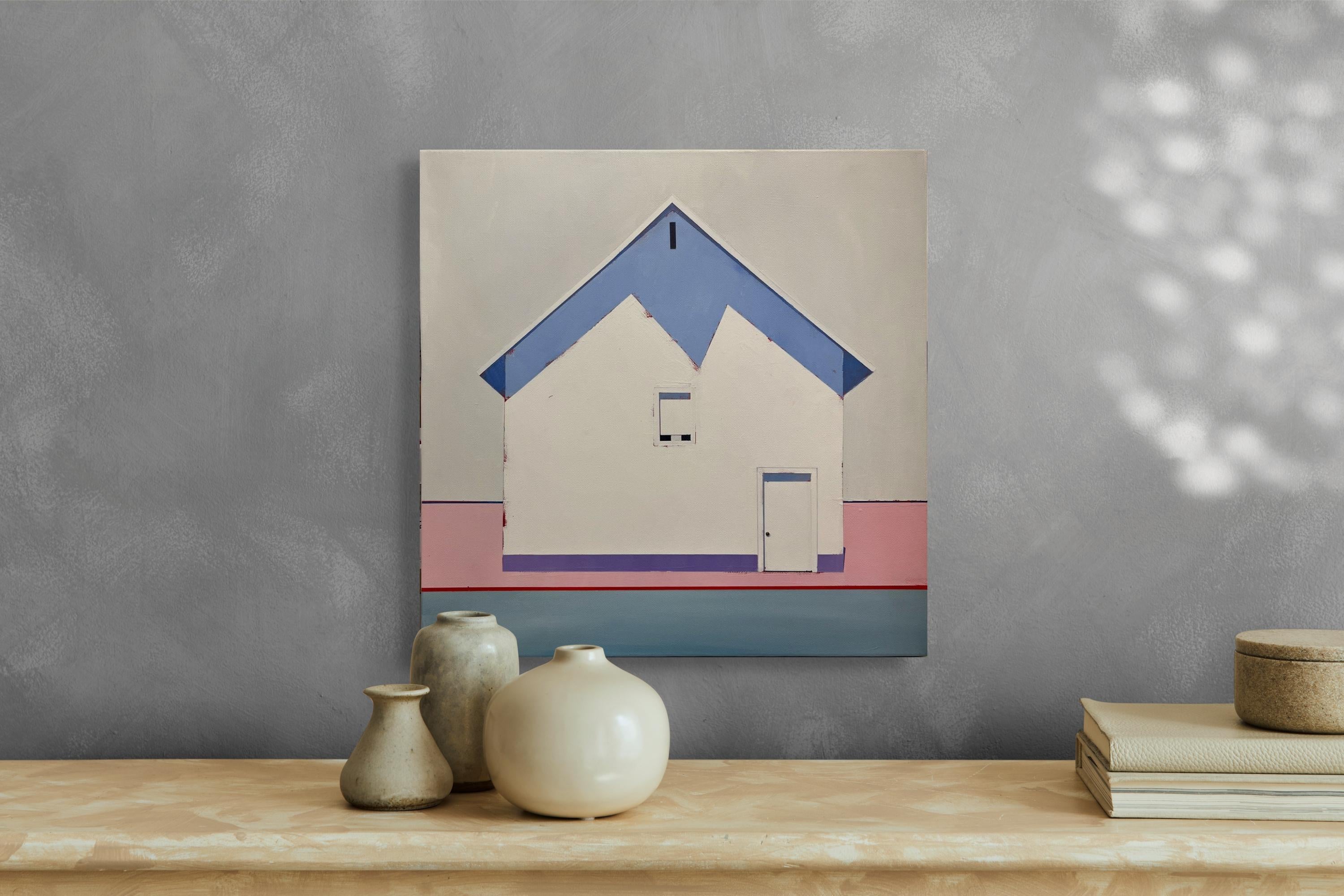 Zeitgenössische farbenfrohe pastorale Landschaft des in Texas lebenden Künstlers Jacob Spacek. Das Werk zeigt eine hellblaue Hütte inmitten eines offenen Feldes vor einem leuchtend r...
