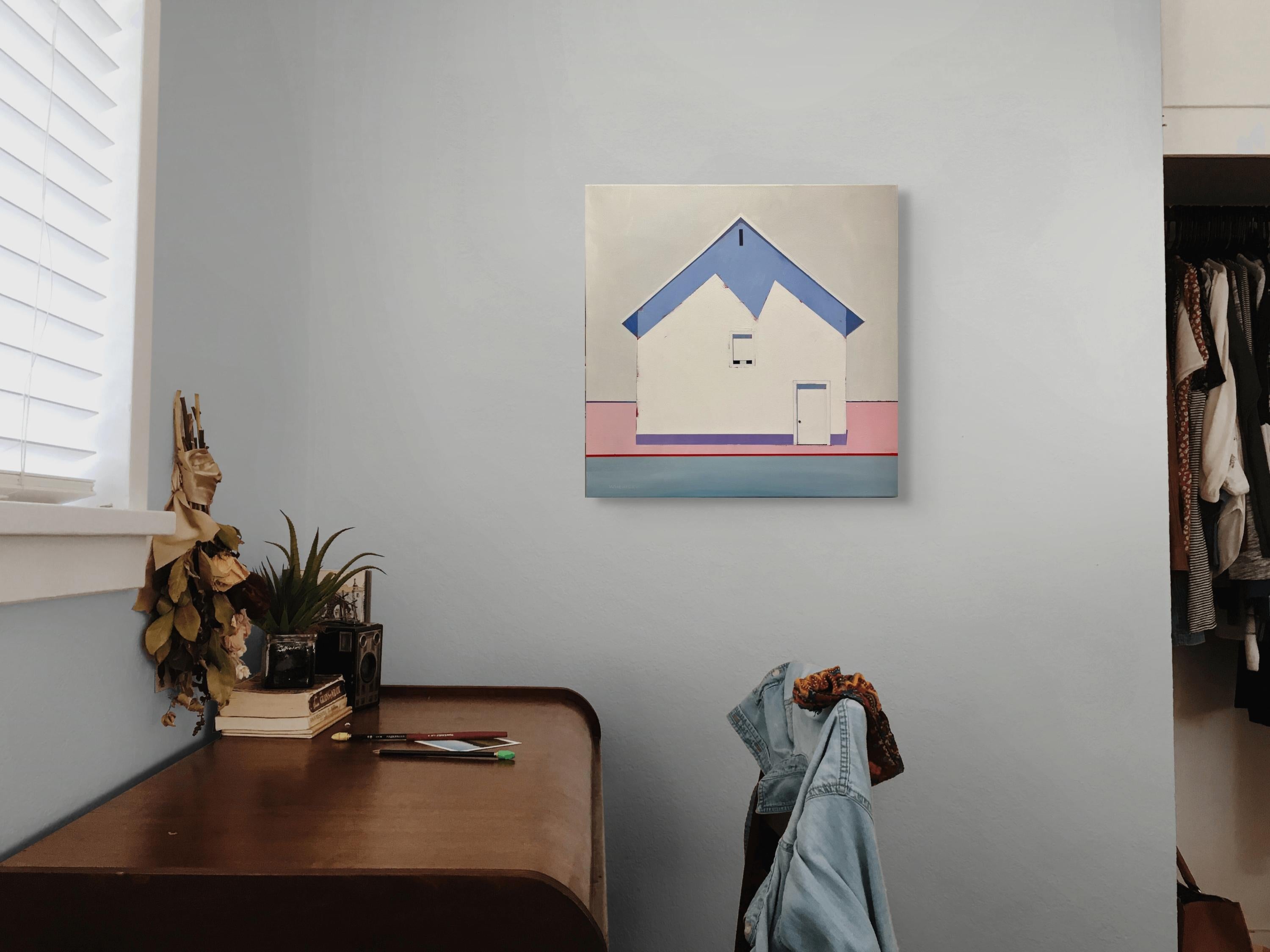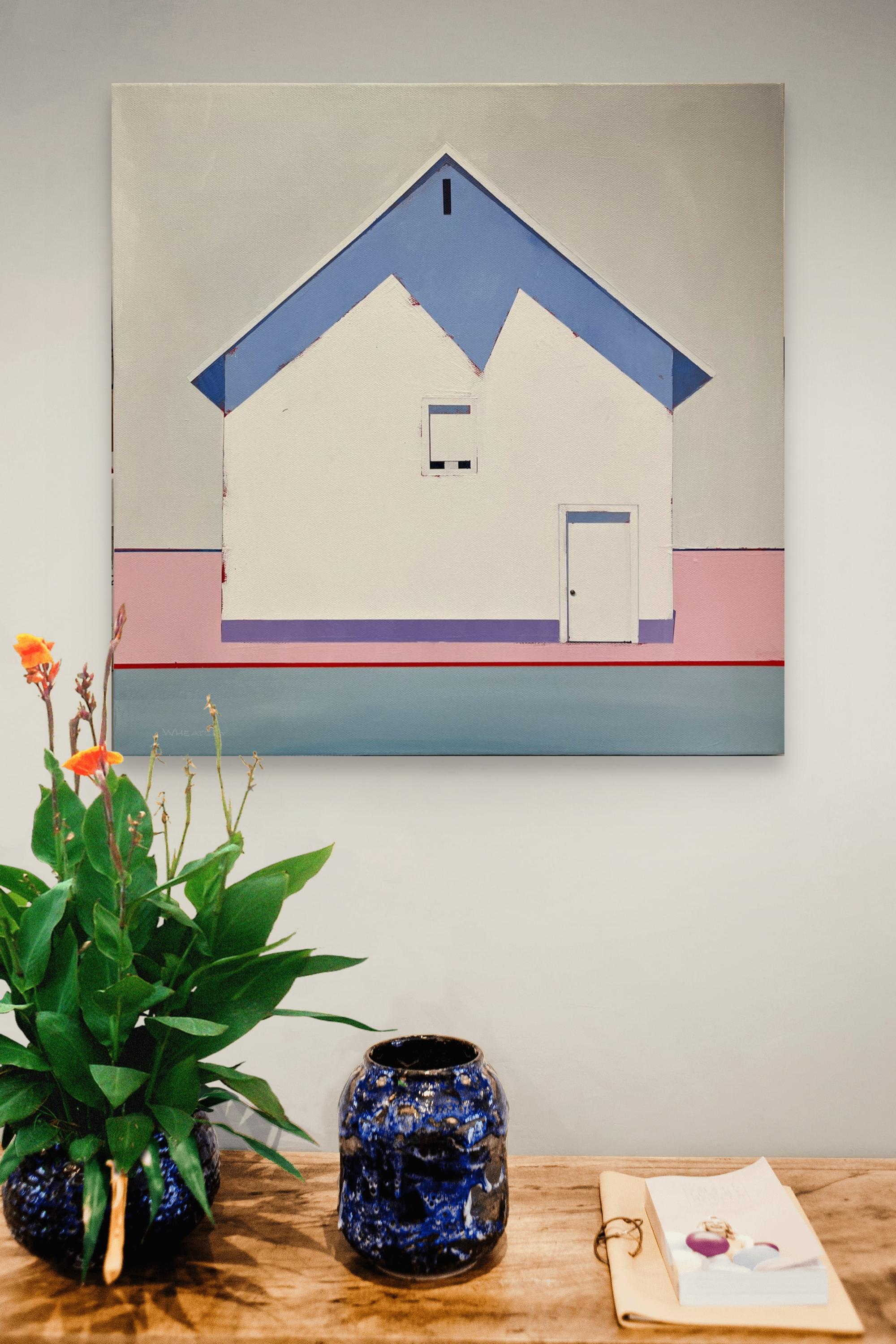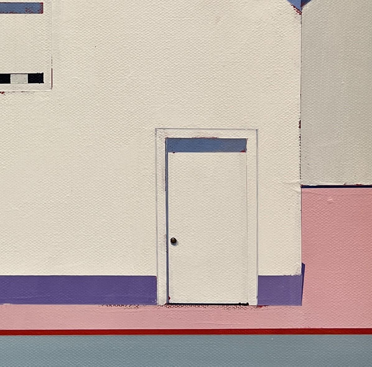Justin Wheatleys (US-basiertes Gemälde „Avenida Del Sol“) ist ein originales, handgefertigtes Acrylgemälde, das die Vorderseite eines grauen Hauses mit einer roten Tür zeigt.