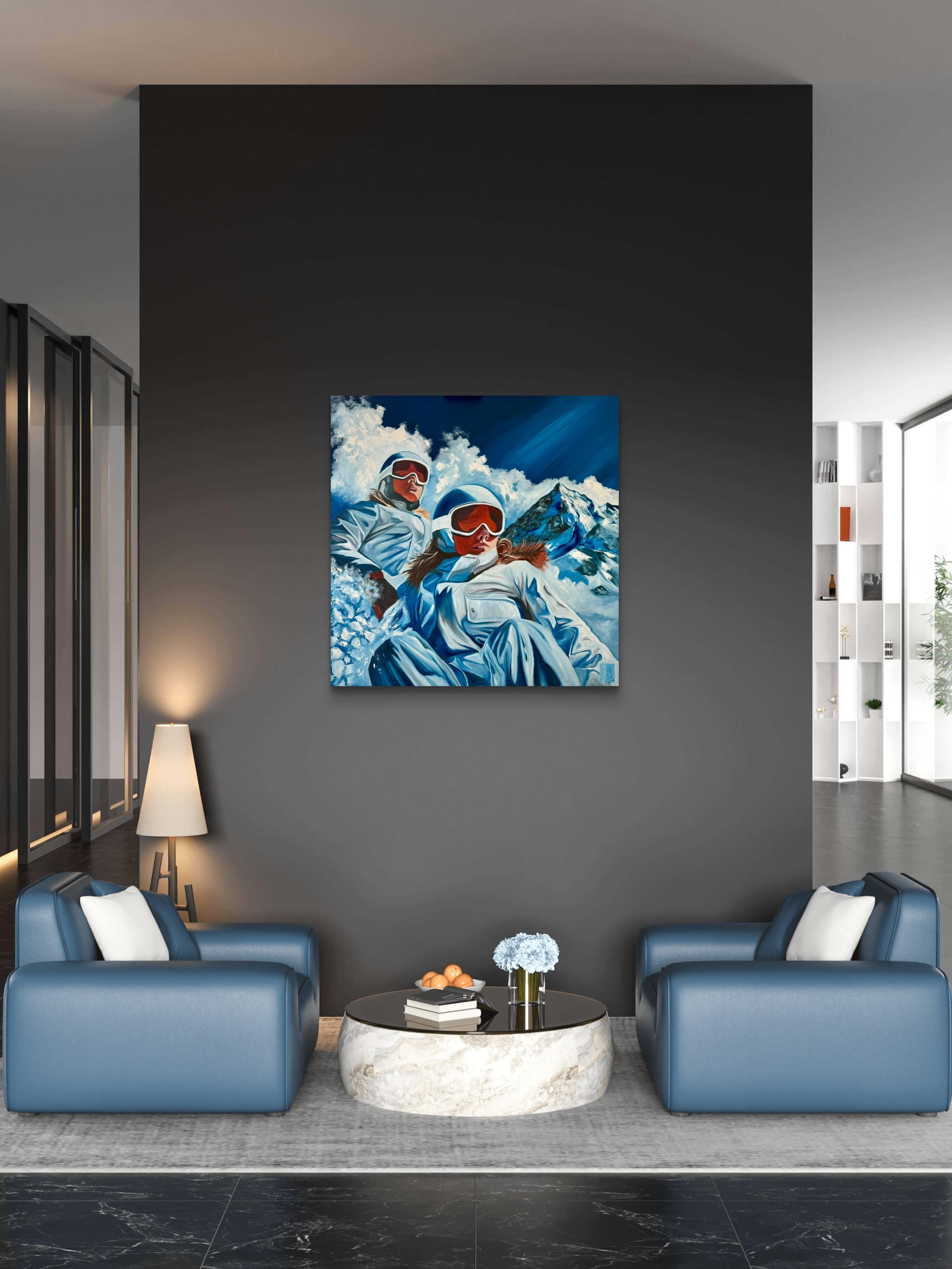 Ein strukturiertes Gemälde, das den Nervenkitzel einer Winterabfahrt und die frische Energie der Berge einfängt. Der geformte Schnee, die dynamischen Skispuren und der dramatische Hi...