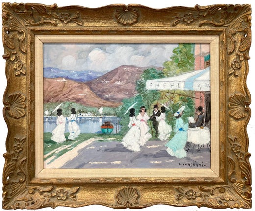 Ein skurriles Ölgemälde, das eine Cafészene mit Blick auf den Luganer See darstellt. Eine Region zwischen der Schweiz und Norditalien. Als Künstler des italienischen Impressionismus entstanden die meisten Werke Caglianis in der ersten Hälfte des 20. Jahrhunderts. Er war für seine charmanten Kompositionen bekannt und ließ sich in der Lombardei nieder, was seine Leidenschaft für intime Gemälde im Pariser Stil erklärt. Außerdem malte er mit Vorliebe Szenen, die in Venedig spielen. Dieses Stück ist eine wunderbare Darstellung von Figuren, die in einem wunderschönen Café am Seeufer ihrem Tag nachgehen. Die Farben und die Beleuchtung dieses Stücks sind wirklich eine Freude zu entdecken, da wir den Moment in der Zeit wunderschön darstellen können. Die Details sind weich und elegant, während die Schatten auf dem Weg Lichtflecken aufnehmen. Das Gemälde wird in einem schönen Holzrahmen mit Aufhängedraht auf der Rückseite präsentiert und ist rechts unten signiert.