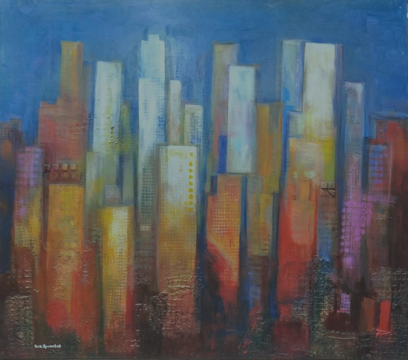 Manhatan original expressionistisches Acrylgemälde. virtuell gerahmt
