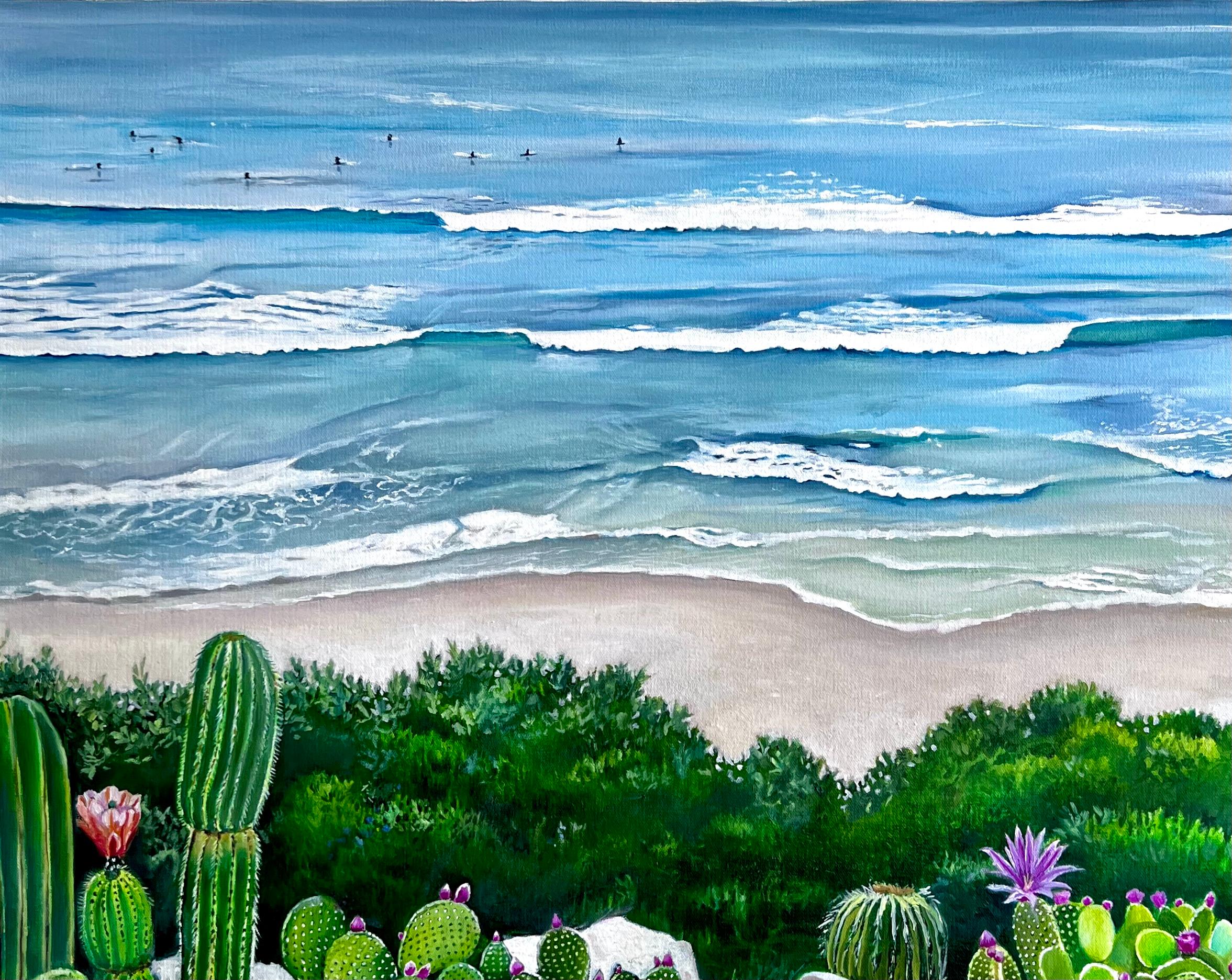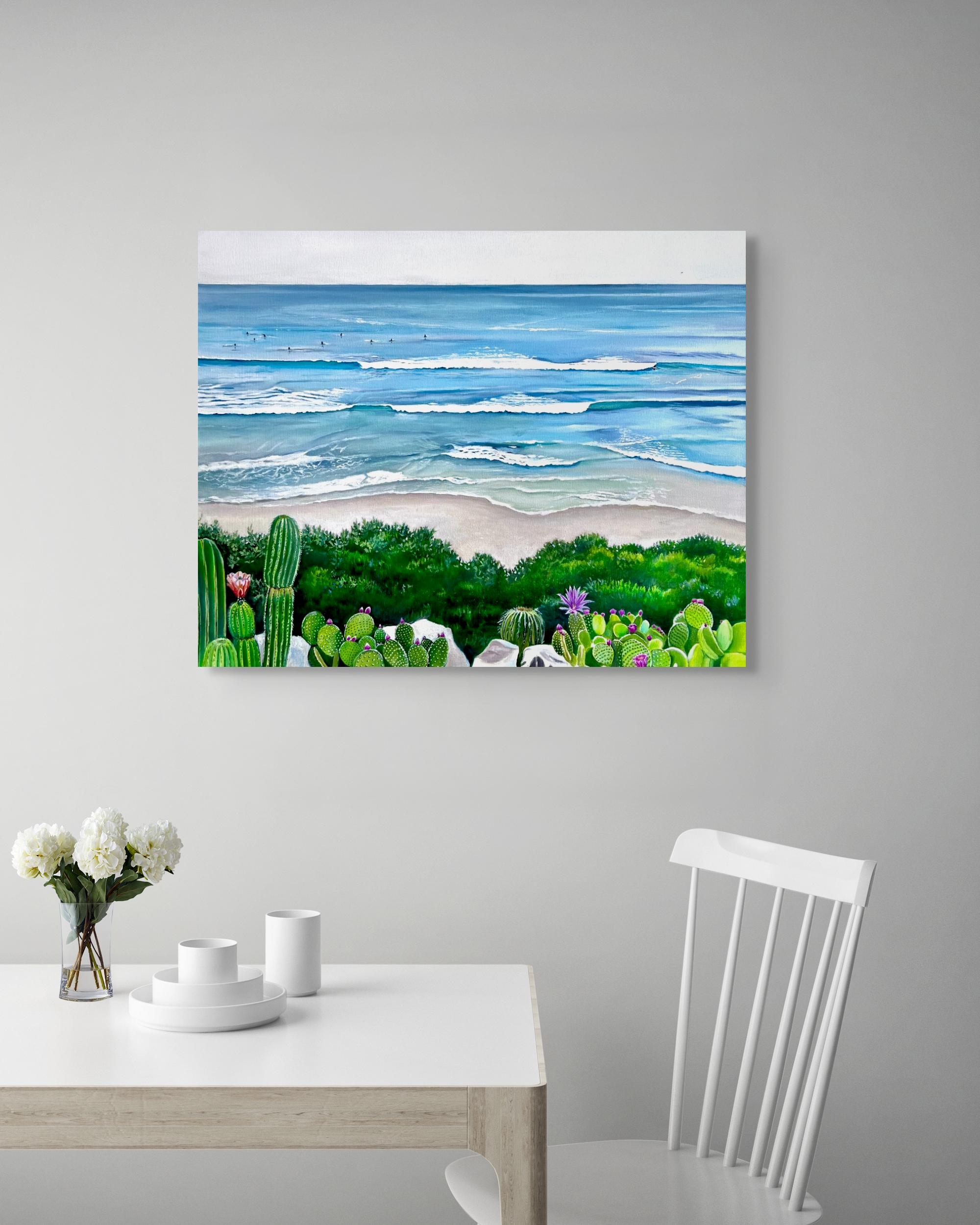 Diese ruhige Küstenlandschaft an einem bewölkten Surftag ist der Inbegriff von Encinitas, CA. In der Ferne sieht man Surfer unter einem kühlen, grauen Himmel. Eine Mischung aus Blau- und Grüntönen bildet die Kulisse für einheimische Kakteen und Büsche vor einem weiten, fast endlosen Blick auf das Meer.