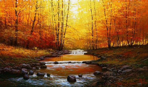 Fluss im Herbstwald, Gemälde, Öl auf Leinwand