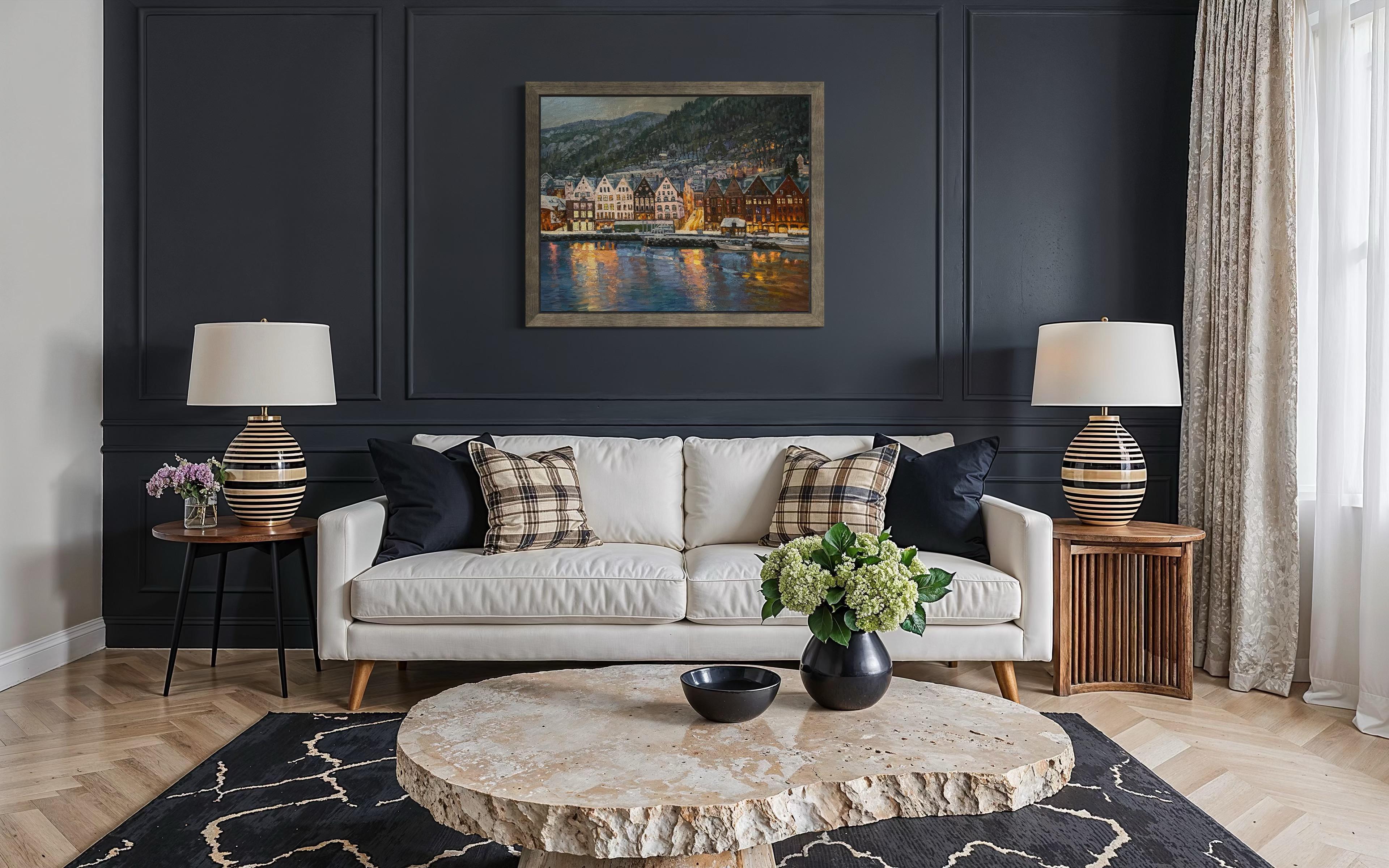 Dieses Kunstwerk fängt einen heiteren Winterabend in einer malerischen Hafenstadt ein. Eine Reihe malerischer, traditioneller Gebäude, jedes mit einzigartig gemusterten Fassaden, säumen die Uferpromenade, deren warme Lichter sich glänzend auf dem ruhigen Wasser spiegeln. Die Szene spielt vor dem Hintergrund sanft schneebedeckter Hügel und eines sich verdunkelnden Himmels, der ein Gefühl friedlicher Abgeschiedenheit vermittelt. Die akribische Detailtreue des Künstlers hebt die charmante Architektur und die reiche Struktur der Landschaft hervor. Die Verwendung von warmen Farben in Kombination mit kühlen, gedämpften Tönen schafft einen auffälligen Kontrast, der die einladende Ausstrahlung der Gebäude noch verstärkt. Dieses Werk vermittelt meisterhaft ein Gefühl von stiller Schönheit und historischer Tiefe und lädt den Betrachter dazu ein, sich die Geschichten in diesem bezaubernden Stück Küstenleben vorzustellen.