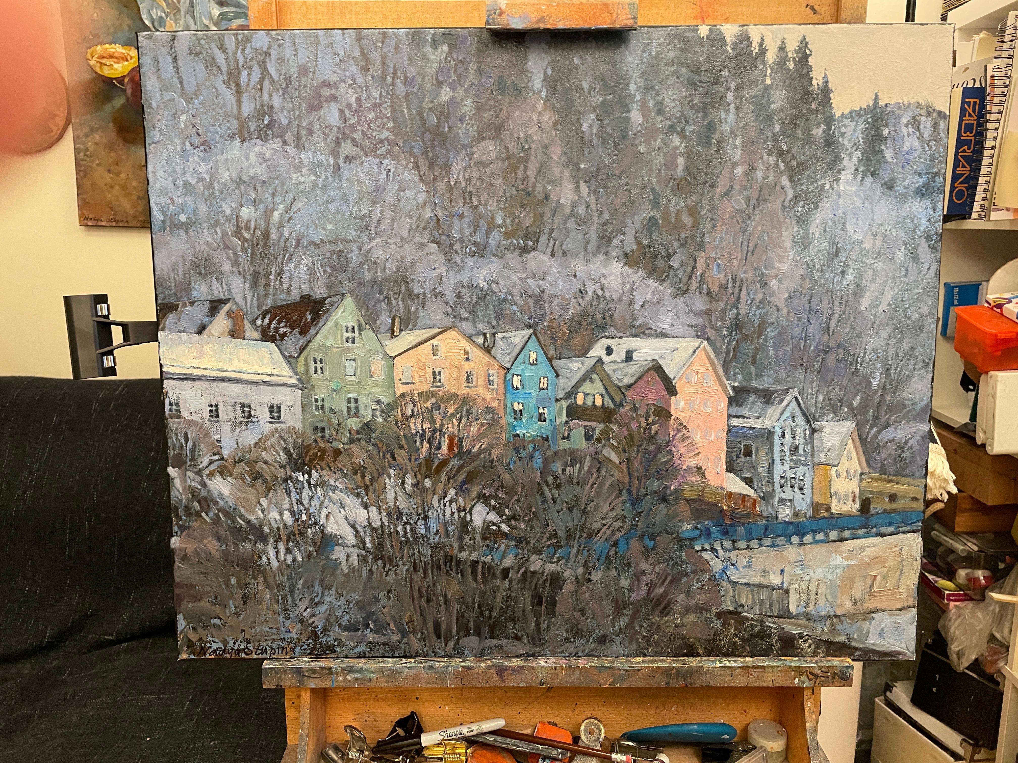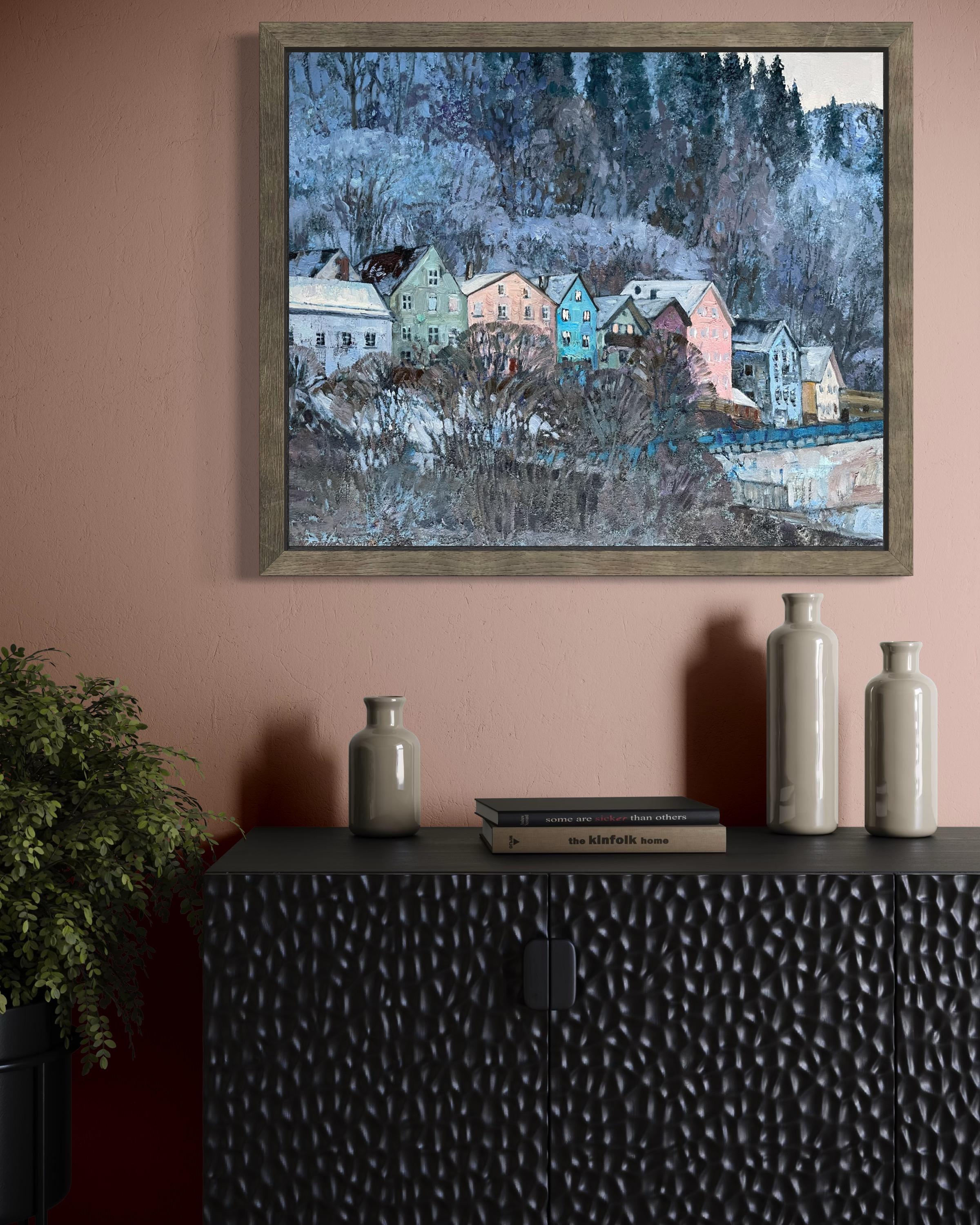 "Bergen. Die Stille des Weihnachtsmorgens": Originelle Landschaft. Impasto.
