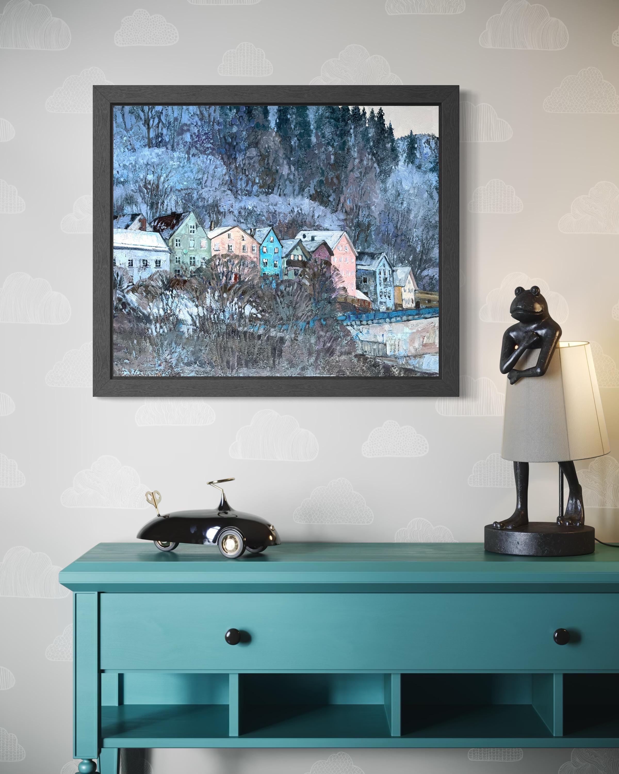 Dieses bezaubernde Kunstwerk zeigt eine ruhige Winterlandschaft mit einem malerischen Dorf, das an einem ruhigen, spiegelnden Gewässer liegt. Die leuchtenden Farben der Häuser des Do...
