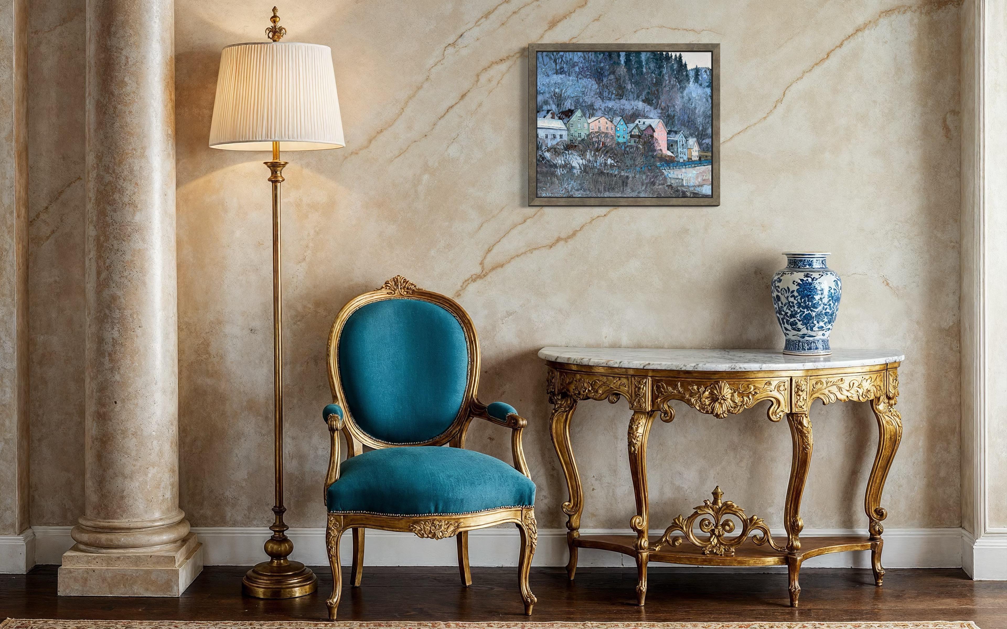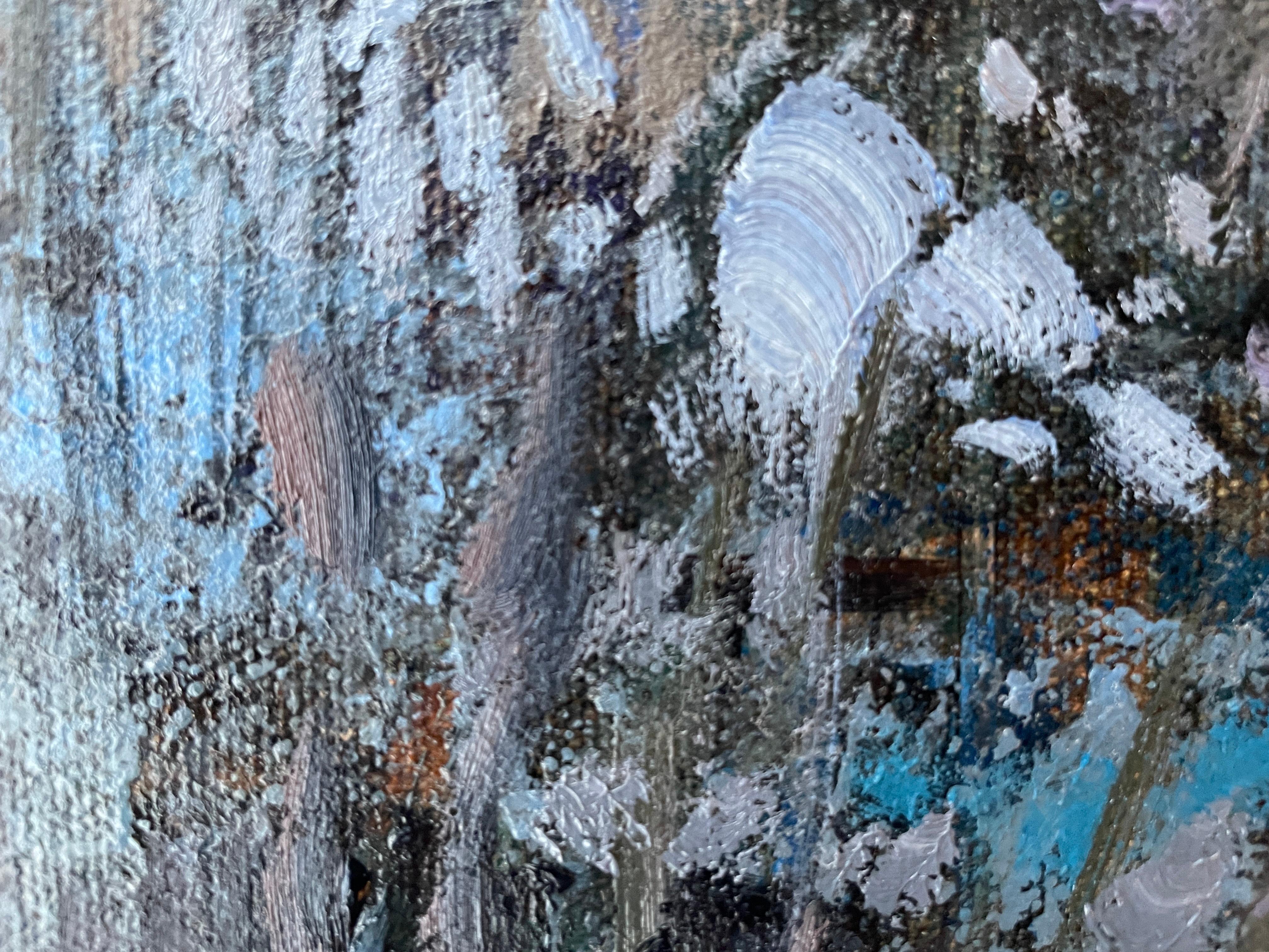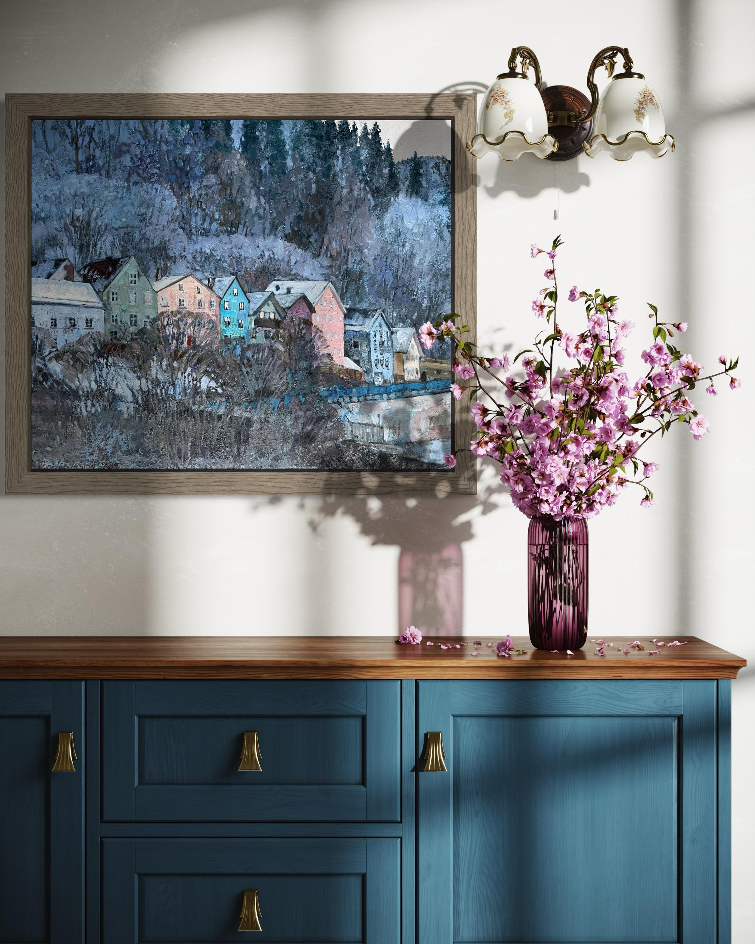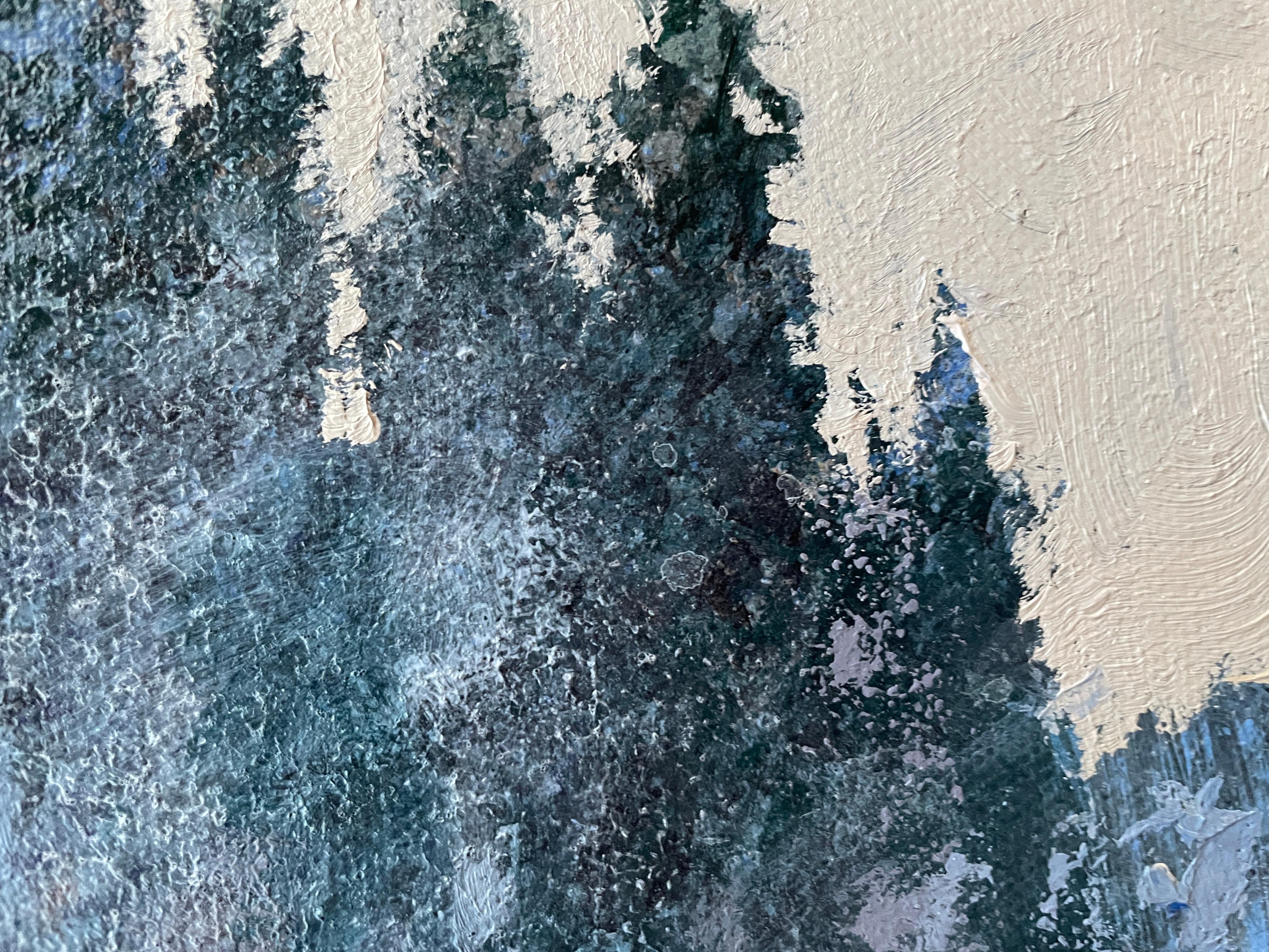 Dieses Kunstwerk fängt eine ruhige Winterlandschaft ein, in der sich eine malerische Reihe von pastellfarbenen Häusern an einen dichten, schneebedeckten Wald schmiegt. Die zarten Farbtöne der Gebäude - zarte Rosa-, Blau- und Grüntöne - stehen in auffälligem Kontrast zu den gedämpften Grau- und Weißtönen des umliegenden Geländes und schaffen eine visuelle Symphonie, die den Betrachter in ihren Bann zieht. Die filigranen Details der kahlen Bäume und ihrer verschlungenen Äste verleihen der Komposition Tiefe und Textur und erhöhen die Komplexität. Im Vordergrund ist ein sanfter, gewundener Weg zu sehen, der das Auge auf subtile Weise durch die Szene führt. Dieses Werk bietet ein einzigartiges Gleichgewicht zwischen Ruhe und Lebendigkeit, eine friedliche und doch dynamische Darstellung eines Winterdorfes, die die stille Schönheit und den kühlen Reiz eines verschneiten Tages gekonnt einfängt. Die Künstlerin setzt Farbe und Textur harmonisch ein, um sowohl die Isolation als auch die Wärme dieser idyllischen Umgebung zu vermitteln.