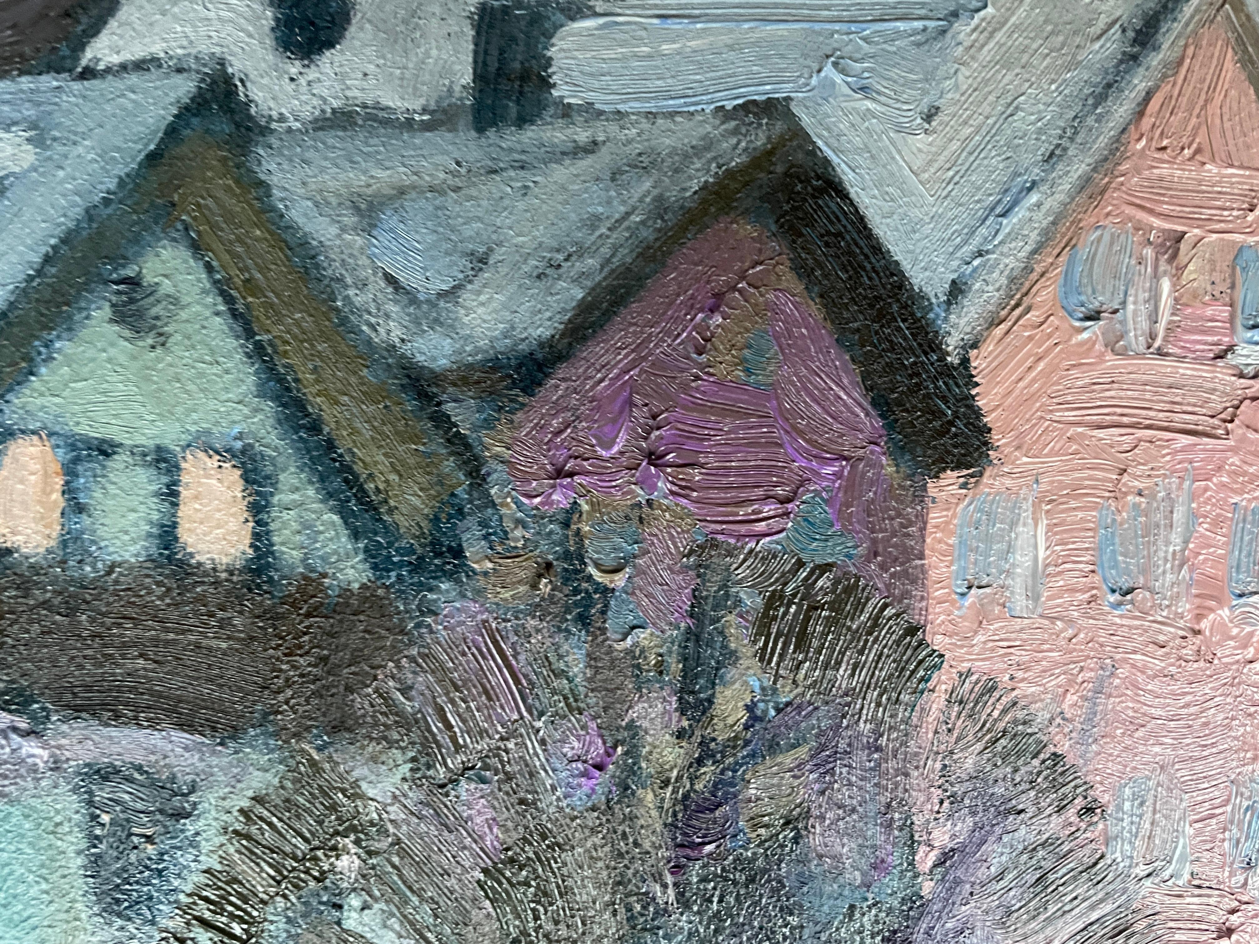 Houses in the Hill, Gemälde, Öl auf Holzplatte