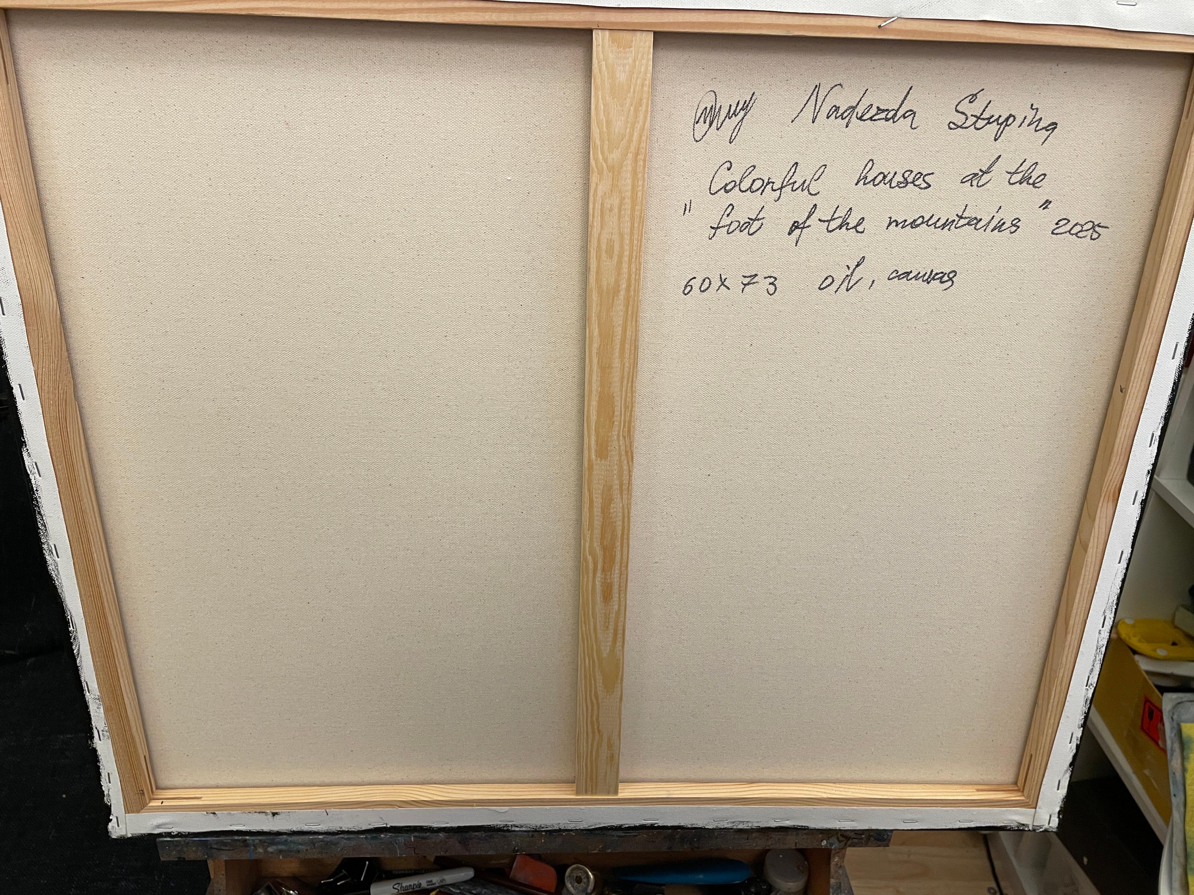 Nadezda Stupina"Bunte Häuser am Fuße der Berge" Originelle Landschaft in Öl.2025