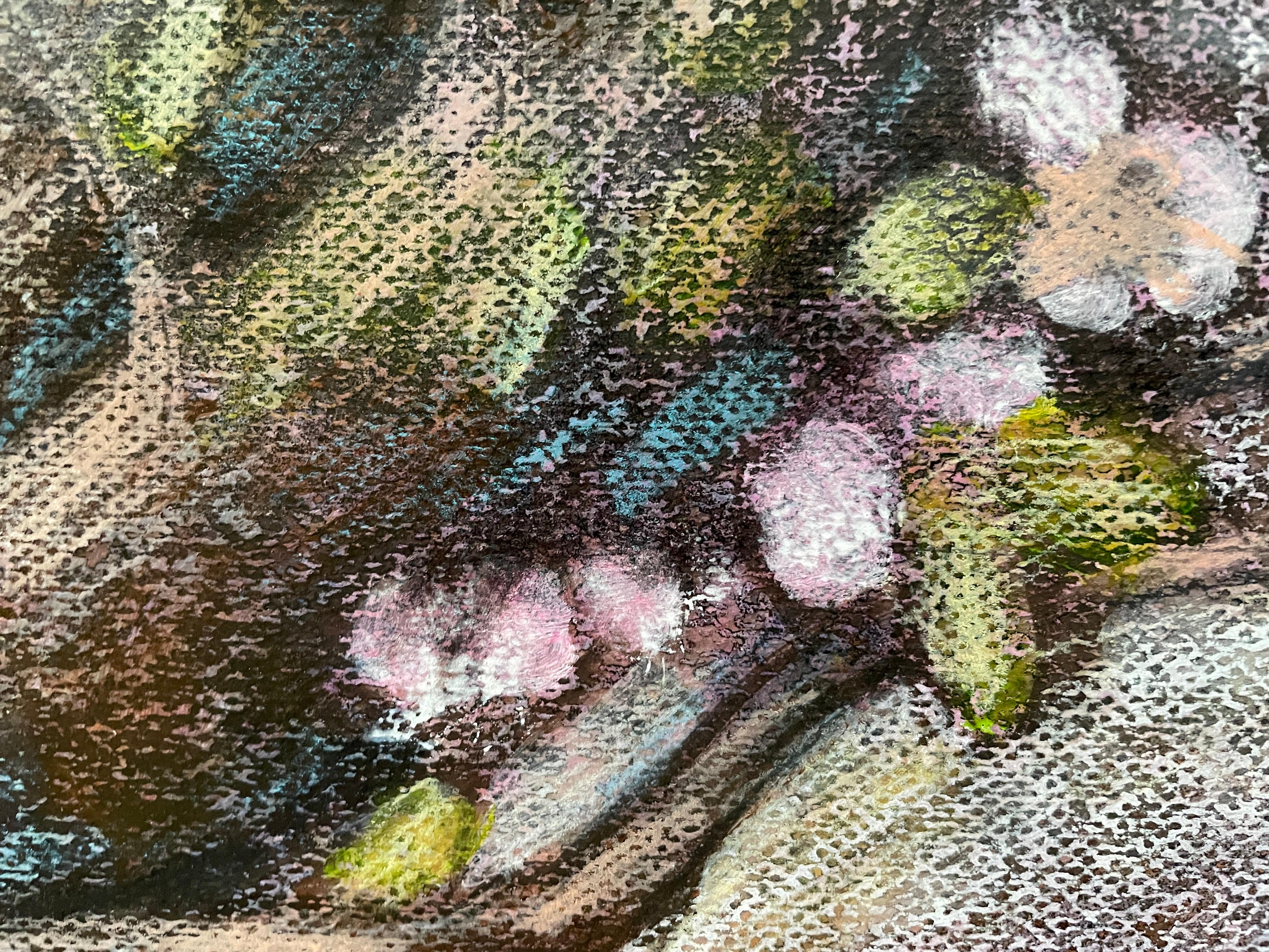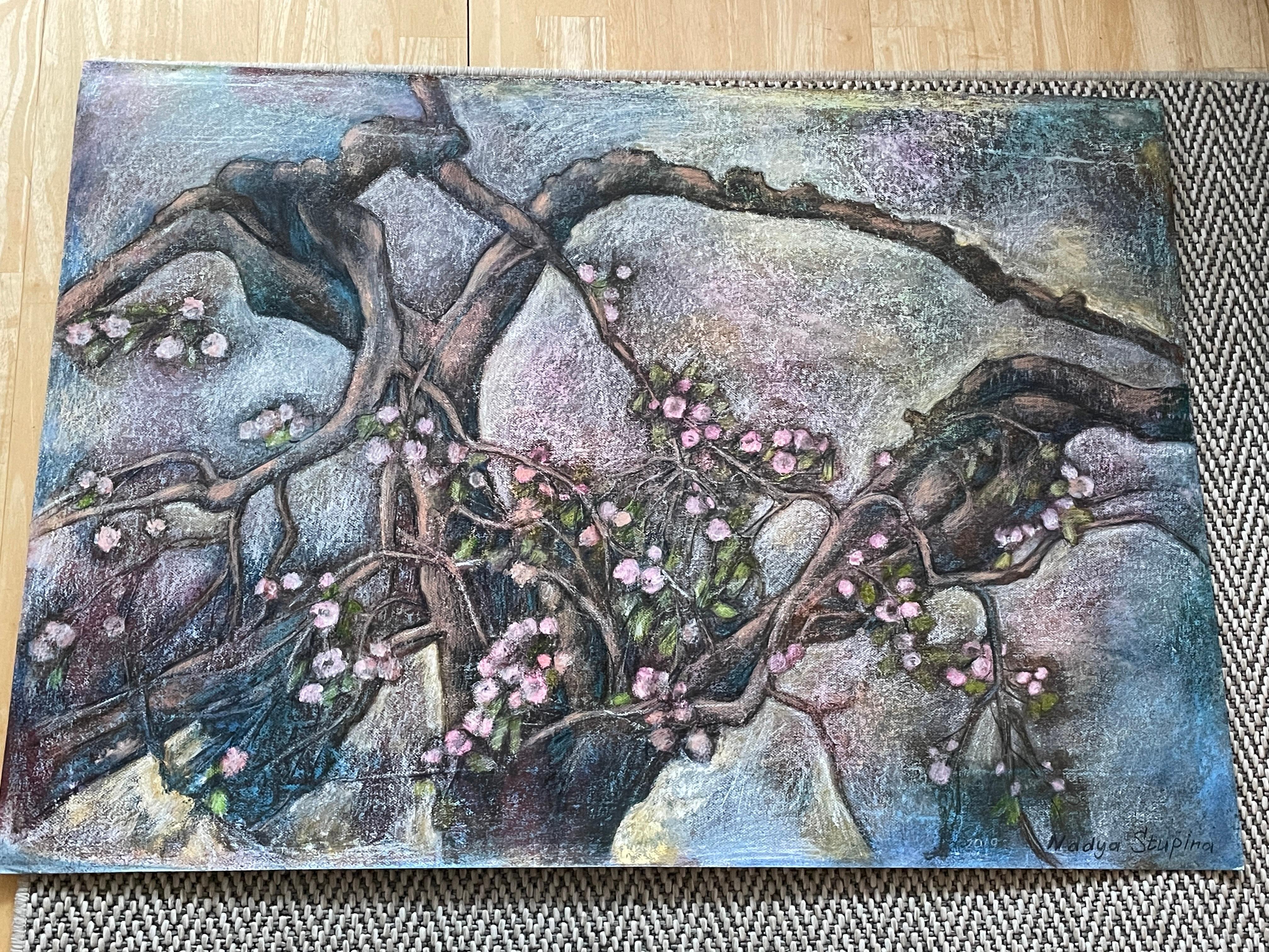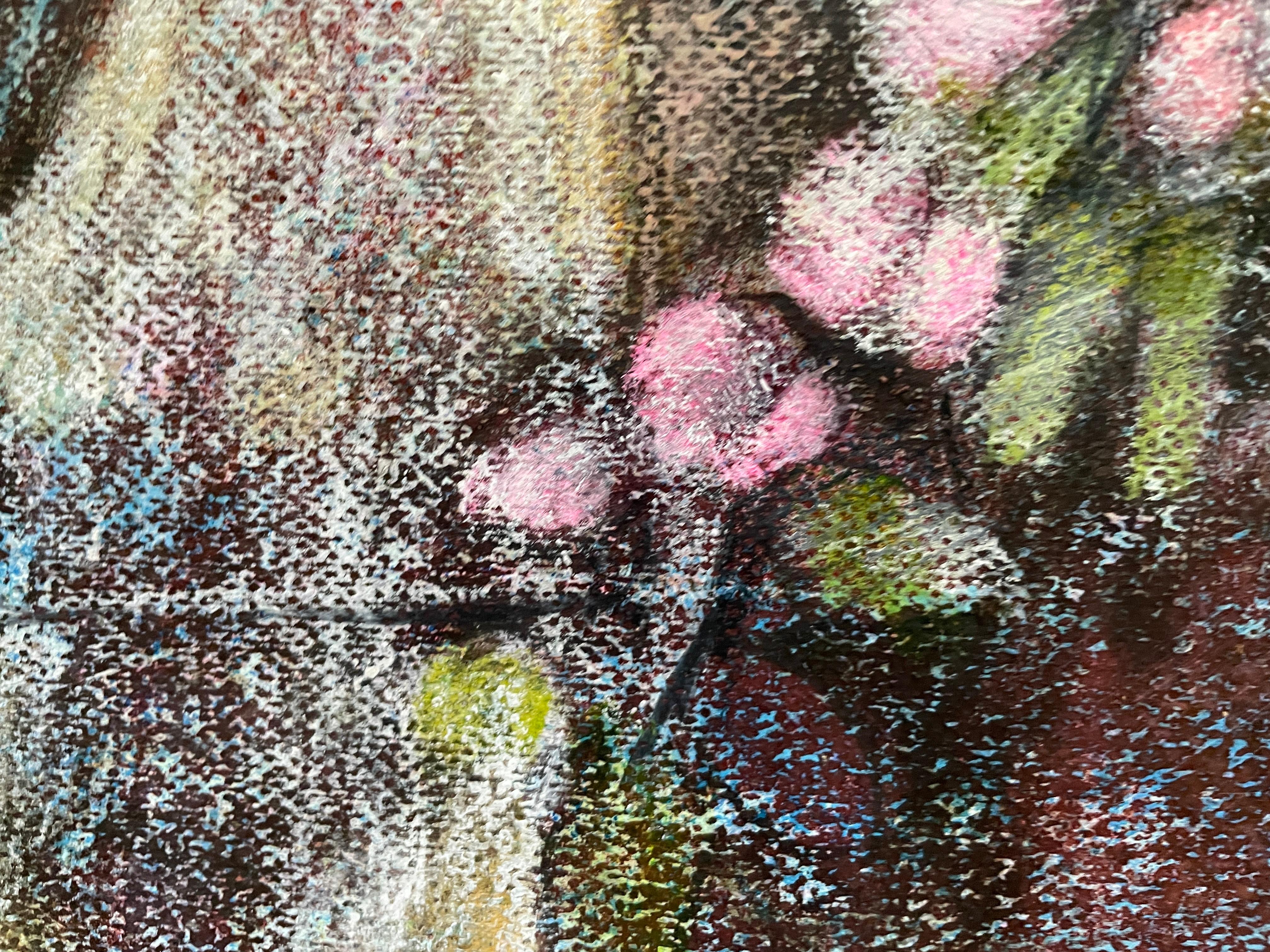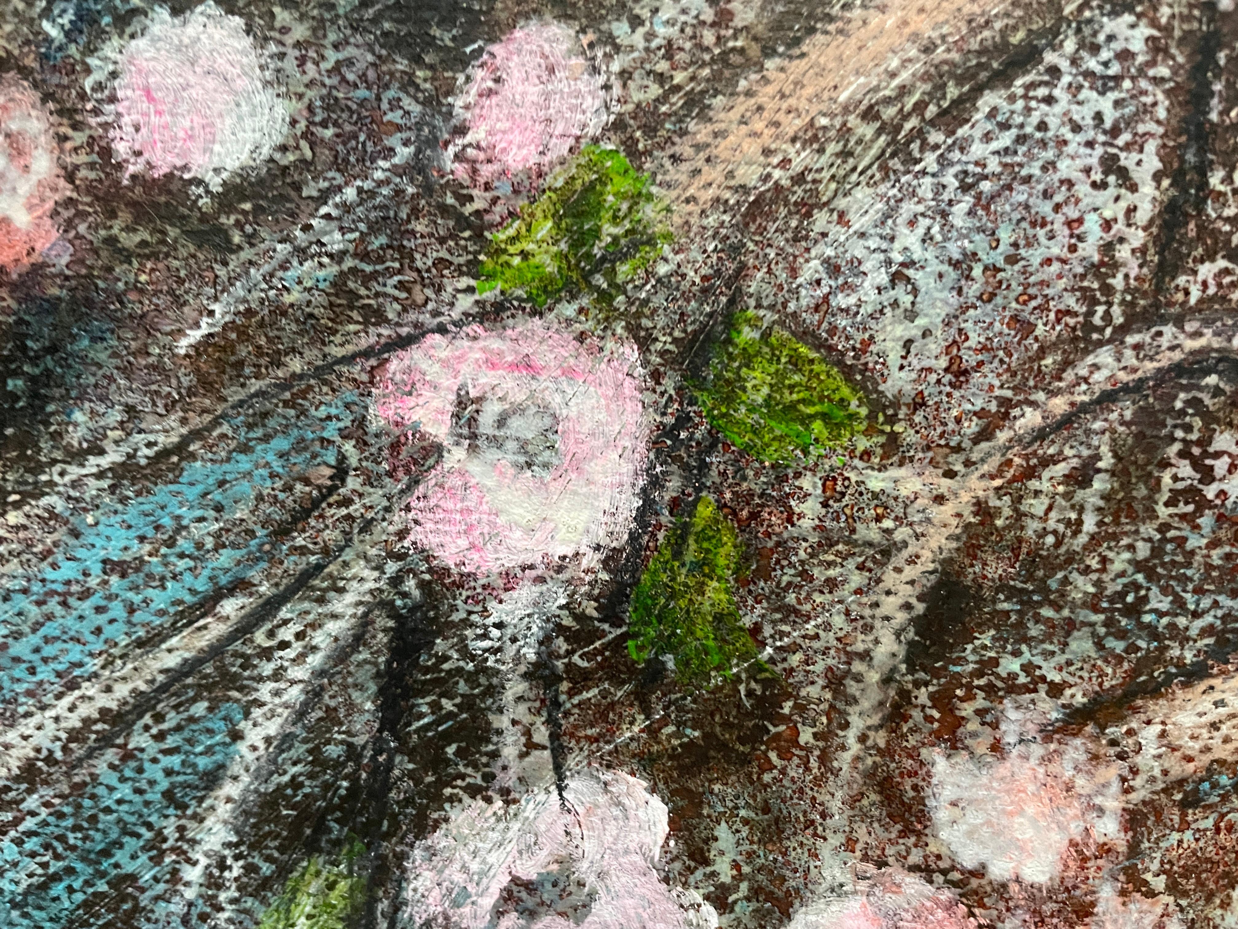 Dieses Kunstwerk zeigt anschaulich die komplexe Struktur knorriger Äste, die mit zarten Blüten geschmückt sind. Die Zweige verschlingen sich und bilden ein kompliziertes Geflecht vor einem verschwommenen, mehrfarbigen Hintergrund, der ein Gefühl von Tiefe und ätherischer Atmosphäre hervorruft. Die in zarten Rosatönen gehaltenen Blüten bilden einen auffälligen Kontrast zu der dunkleren, rauen Rinde und unterstreichen das harmonische Gleichgewicht zwischen Stärke und Zerbrechlichkeit. Die strukturierte Oberfläche des Werks suggeriert einen taktilen Realismus und lädt den Betrachter ein, das Zusammenspiel von Licht und Schatten zu erkunden. Der subtile Einsatz von Farbverläufen verstärkt den dynamischen Fluss der Zweige und führt den Blick über die Komposition. Dieses Werk verbindet auf einzigartige Weise Elemente natürlicher Schönheit mit einer abstrakten Sensibilität und fängt einen flüchtigen Moment ein, in dem Vitalität und Gelassenheit mitschwingen.