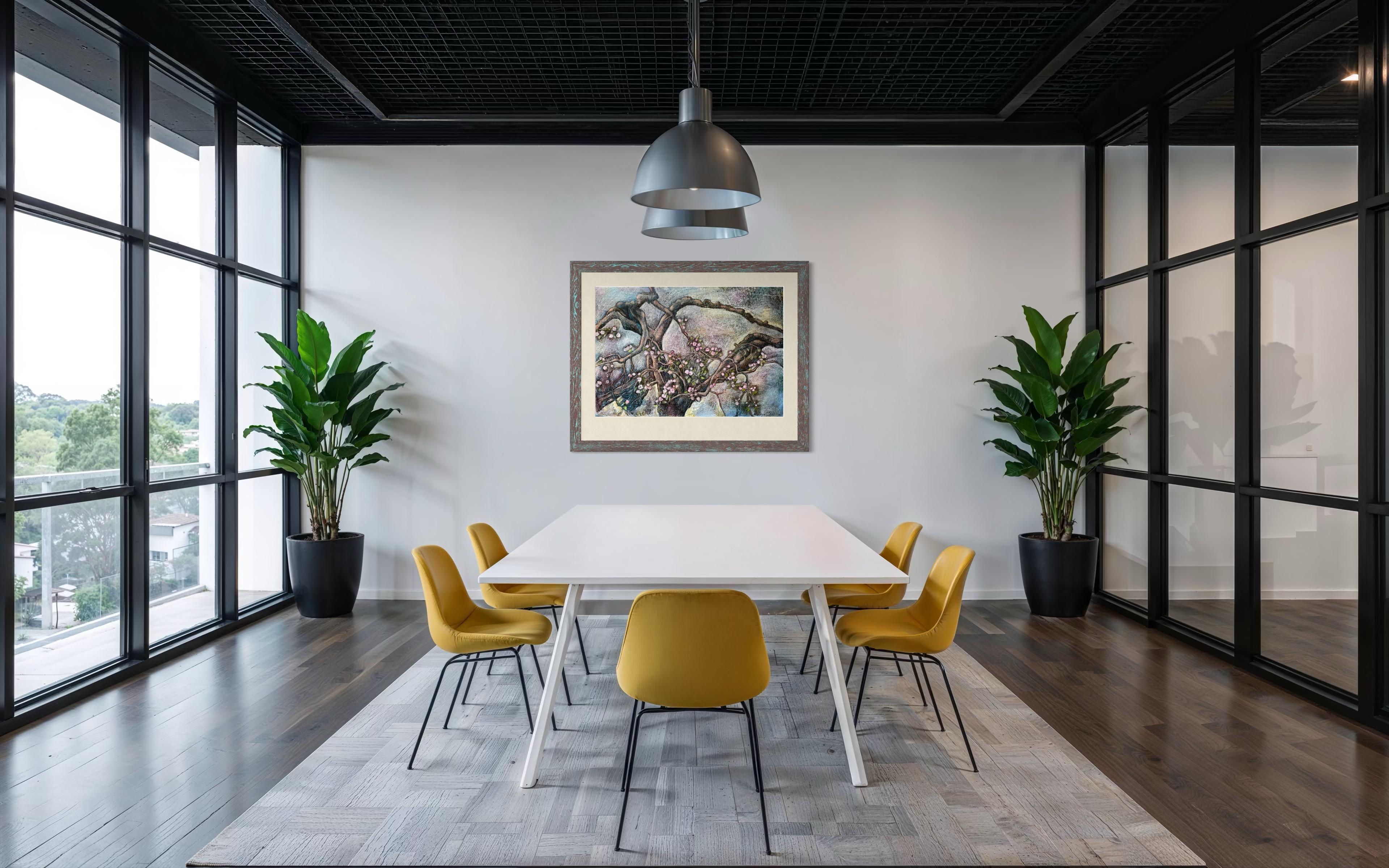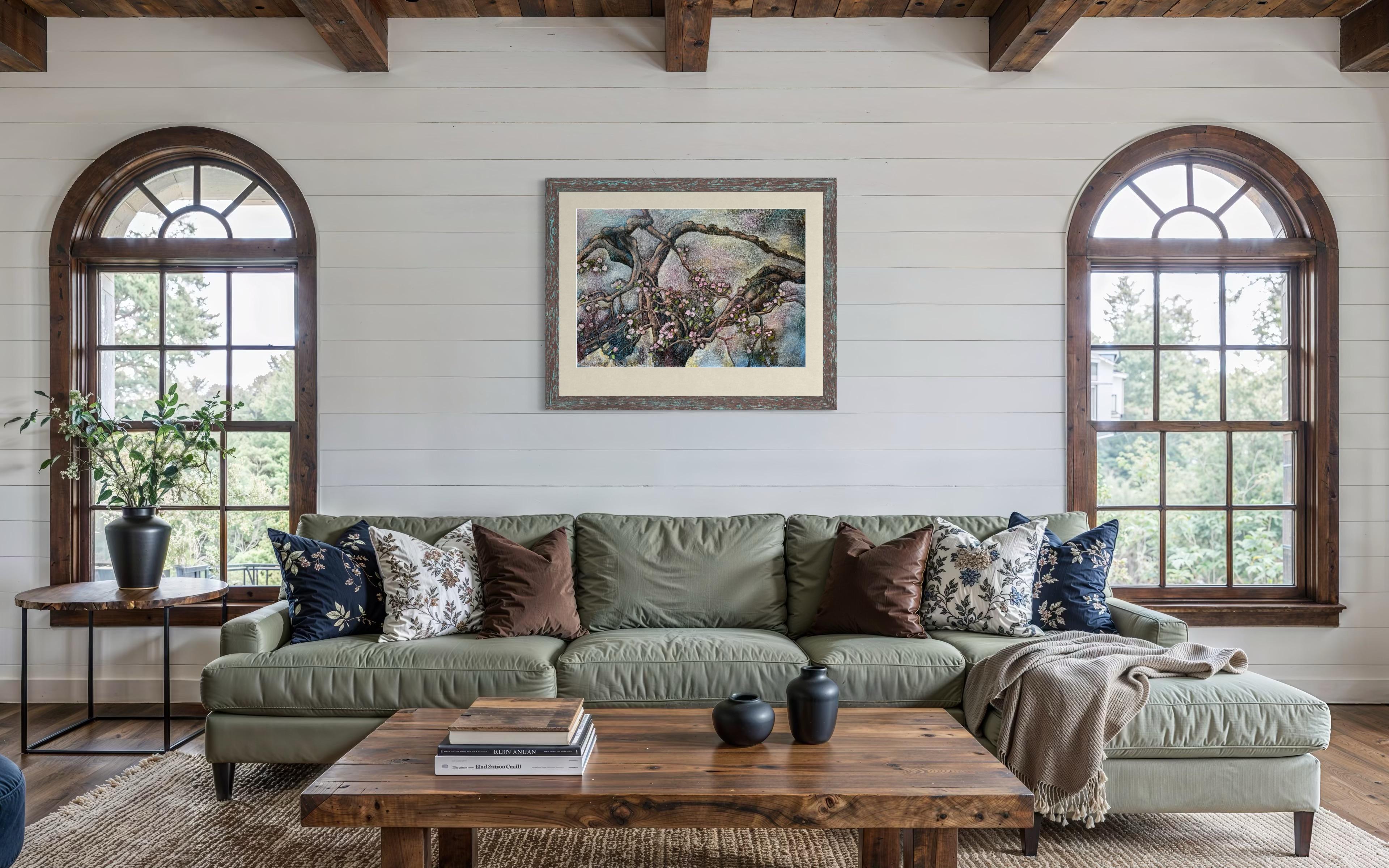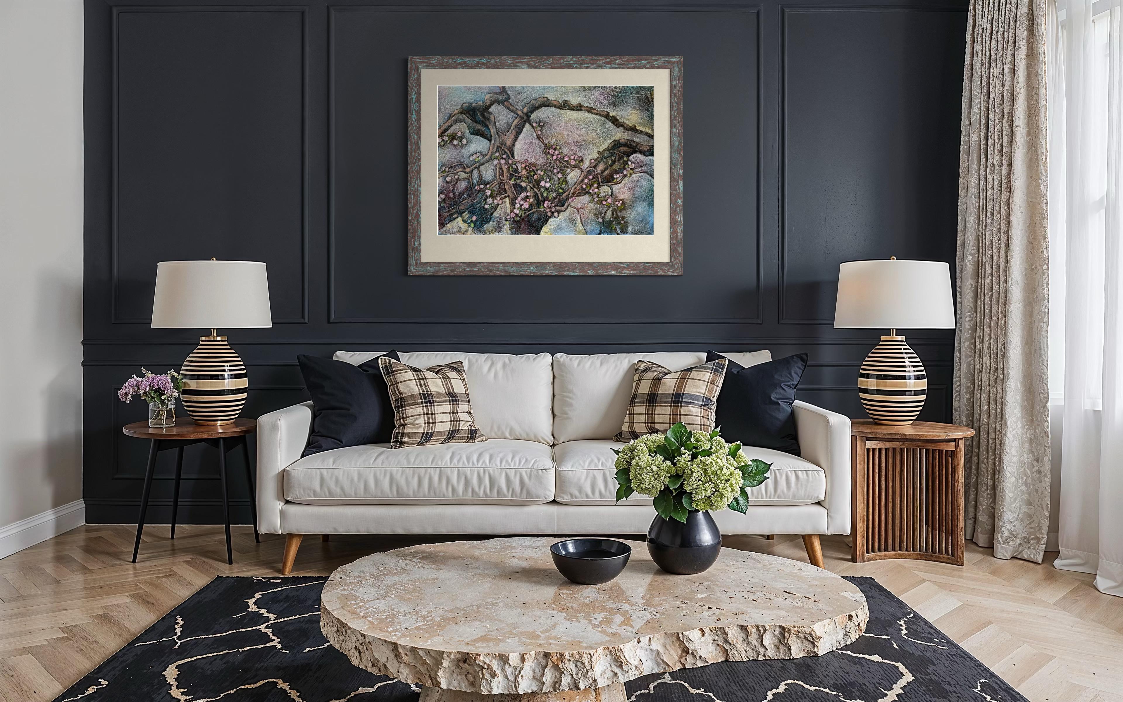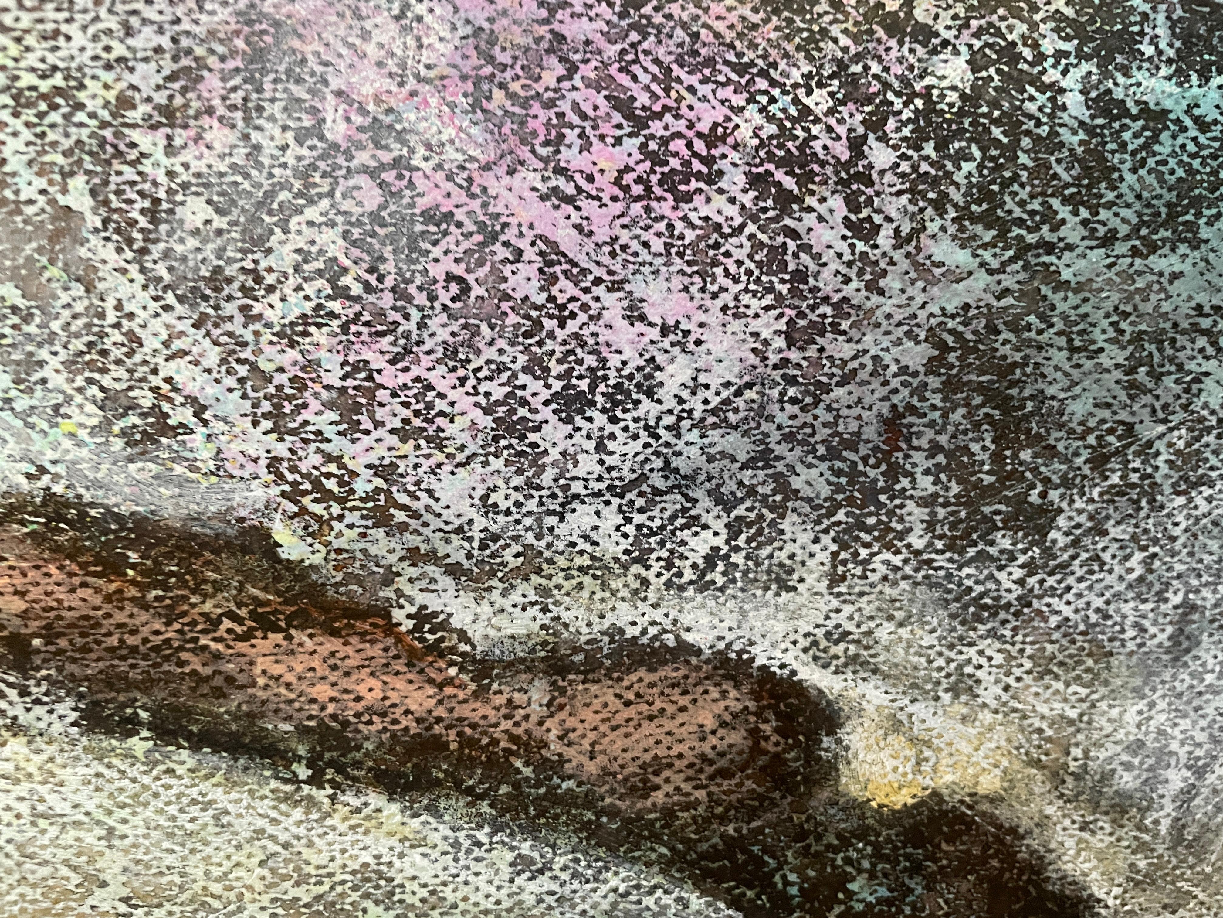 Dieses Kunstwerk zeigt anschaulich die komplexe Struktur knorriger Äste, die mit zarten Blüten geschmückt sind. Die Zweige verschlingen sich und bilden ein kompliziertes Geflecht vor einem verschwommenen, mehrfarbigen Hintergrund, der ein Gefühl von Tiefe und ätherischer Atmosphäre hervorruft. Die in zarten Rosatönen gehaltenen Blüten bilden einen auffälligen Kontrast zu der dunkleren, rauen Rinde und unterstreichen das harmonische Gleichgewicht zwischen Stärke und Zerbrechlichkeit. Die strukturierte Oberfläche des Werks suggeriert einen taktilen Realismus und lädt den Betrachter ein, das Zusammenspiel von Licht und Schatten zu erkunden. Der subtile Einsatz von Farbverläufen verstärkt den dynamischen Fluss der Zweige und führt den Blick über die Komposition. Dieses Werk verbindet auf einzigartige Weise Elemente natürlicher Schönheit mit einer abstrakten Sensibilität und fängt einen flüchtigen Moment ein, in dem Vitalität und Gelassenheit mitschwingen.