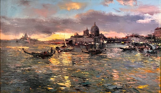 Narek Arakelyan fängt in diesem Ölgemälde die zeitlose Schönheit Venedigs ein. Der Sonnenuntergang färbt den Himmel in...
