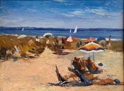 Whiting's erkennbare orangefarbene Regenschirme sind in dieser malerischen Strandszene zu sehen. Die Texturen und das Impasto, das White stets meisterhaft mit seinem Spachtel aufträg...