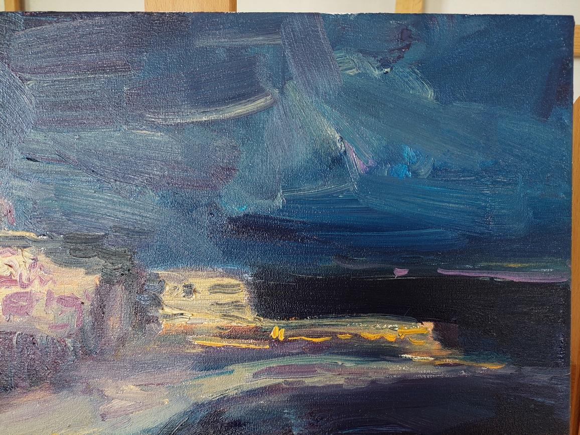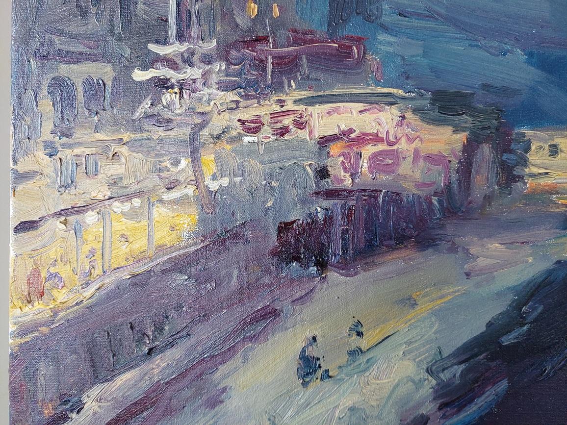 Dieses Werk, das 2025 direkt unter freiem Himmel entstand, ist von der Authentizität der Gegenwart geprägt. Der Künstler hat die Szene in seinem Studio nicht aus Erinnerungen oder Fotos rekonstruiert - er stand abends am Ufer, spürte die kühle Meeresbrise, hörte das ferne Rauschen der Wellen und die Musik aus dem Café und sah zu, wie sich die letzten Schimmer des Sonnenuntergangs in der violetten Dämmerung auflösten.