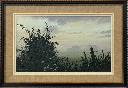 Gelassener ländlicher Morgen mit Wildblumen, rustikalem Zaun und weichem, nebligem Licht von der britischen Künstlerin des 20. Jahrhunderts, Pamela Derry (1932-2002)