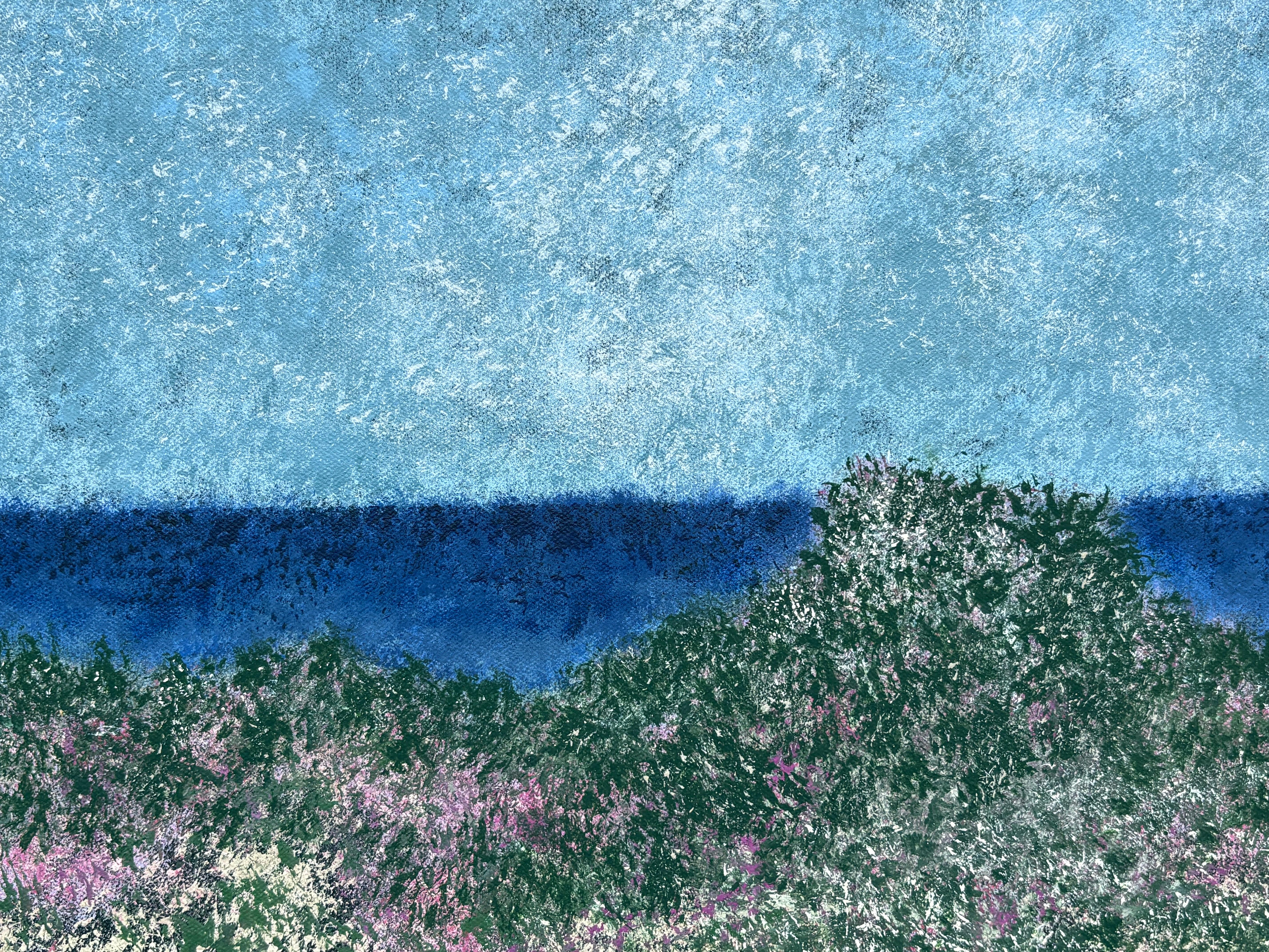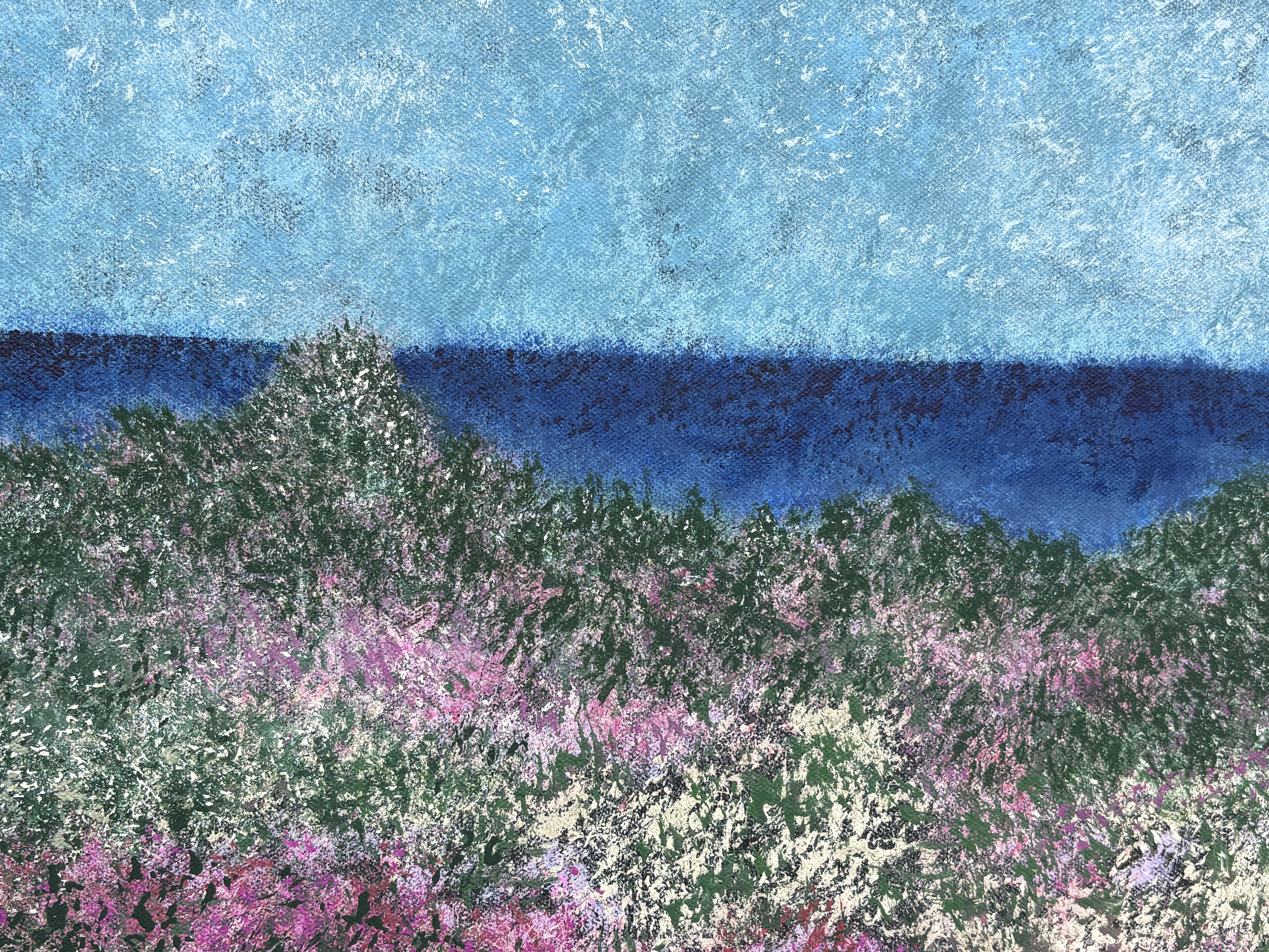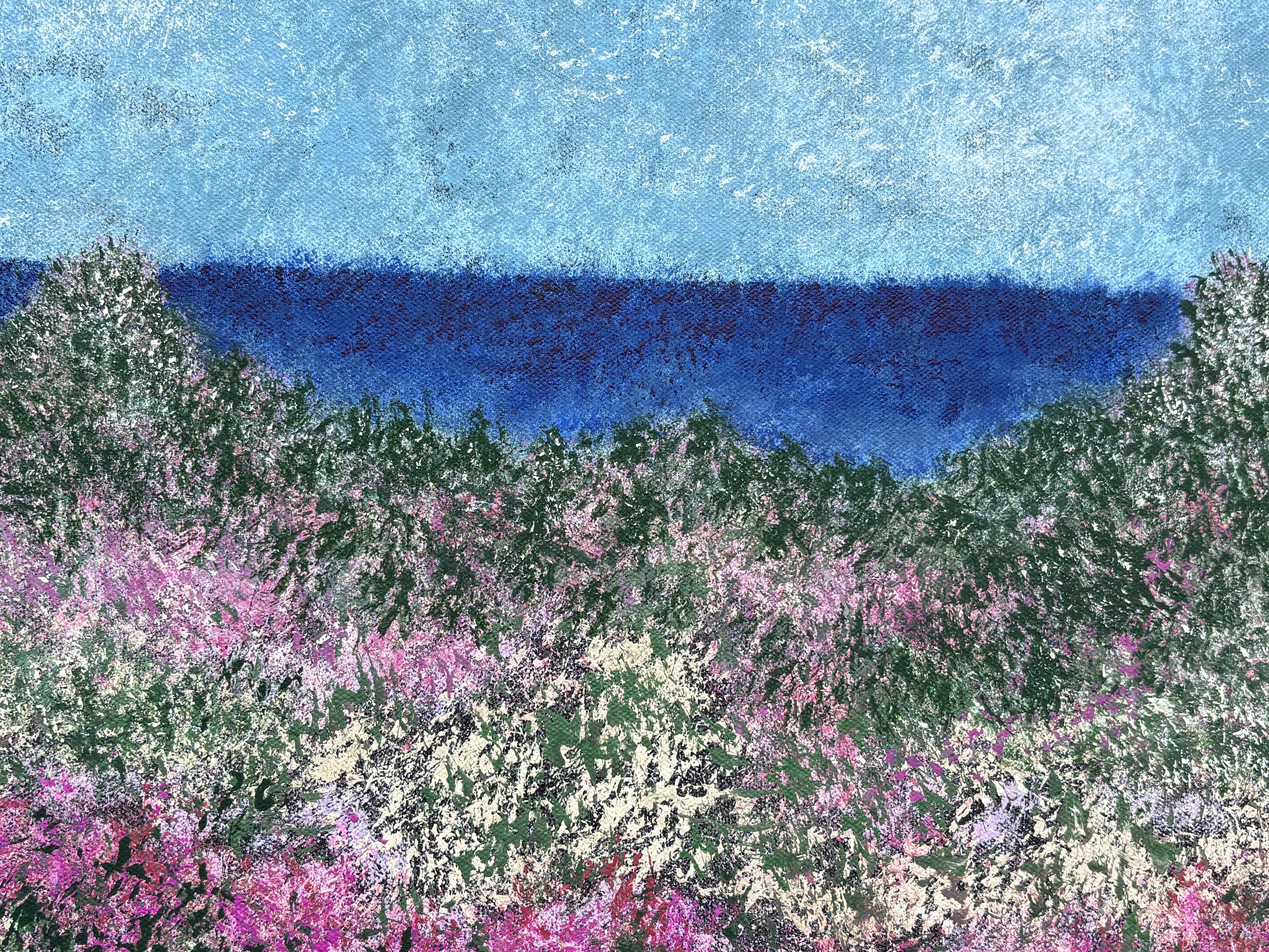 "Asilomar Beach" - Ruhige post-impressionistische Meereslandschaft mit lila Blumen
