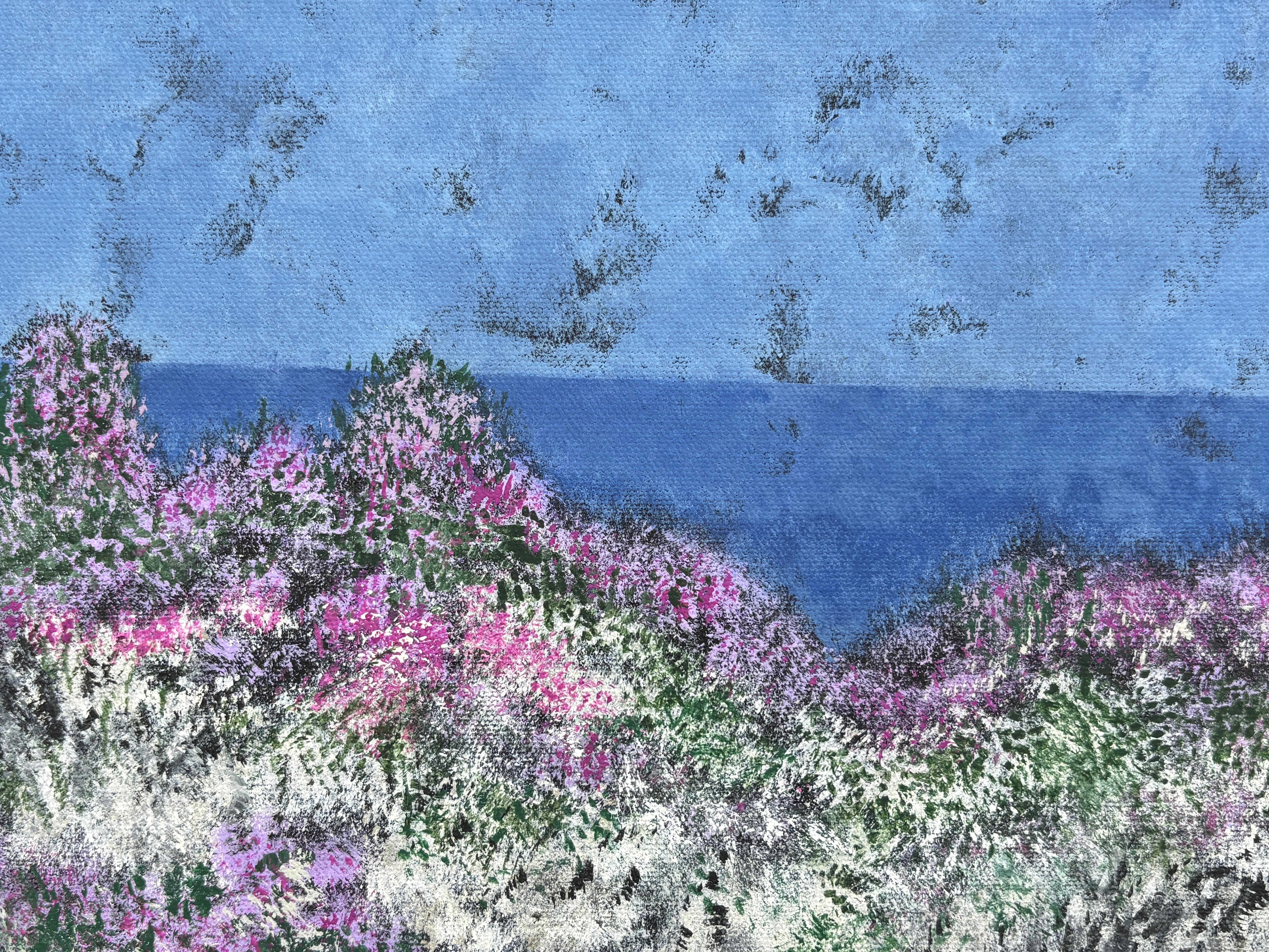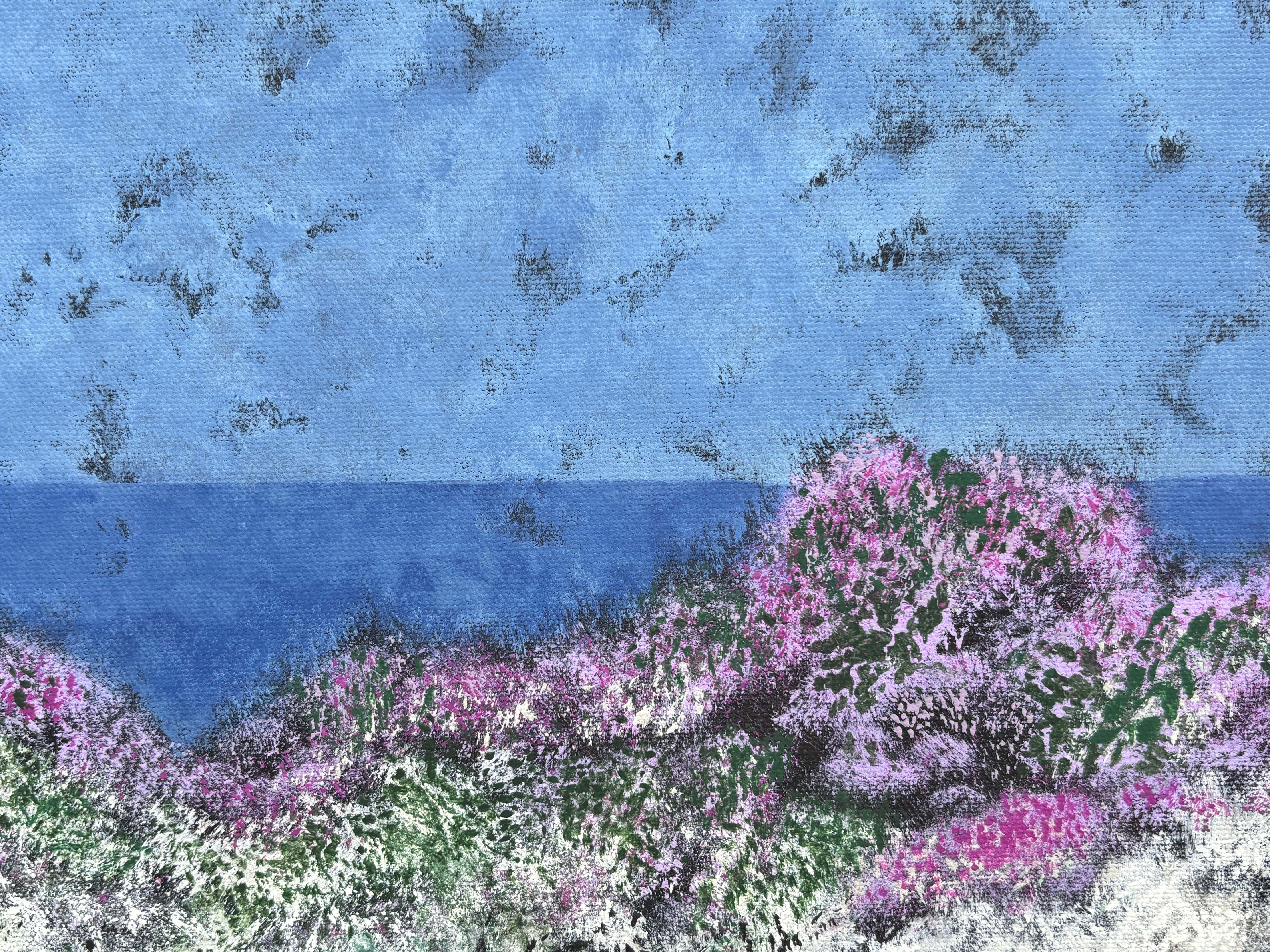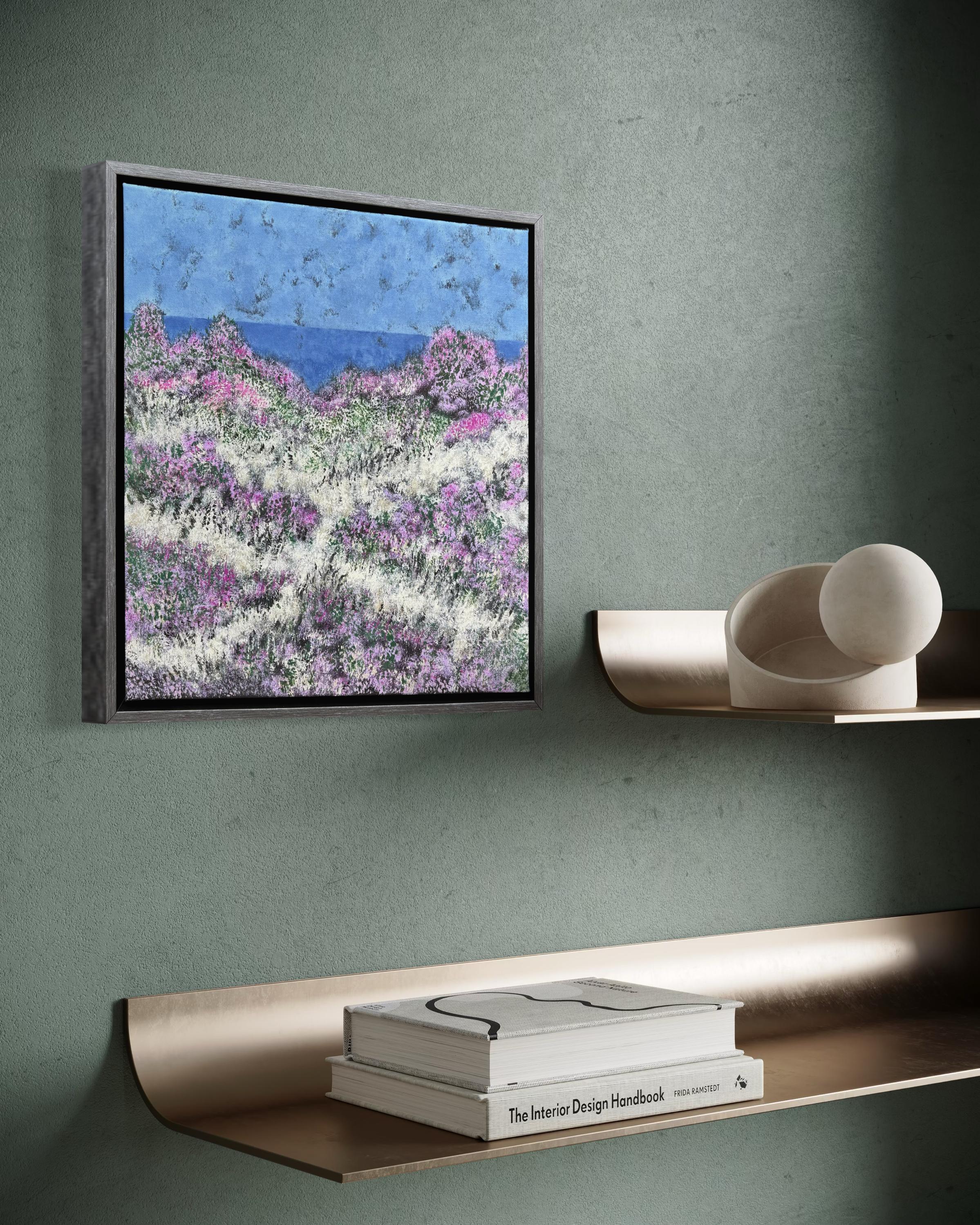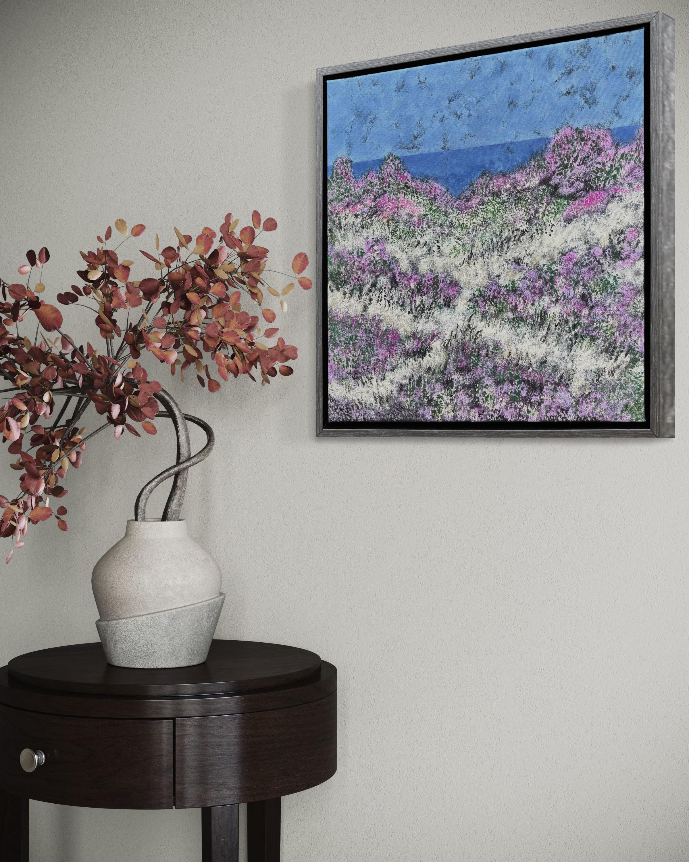 Dieses Werk fängt die windgepeitschte Schönheit der kalifornischen Küste in einem zeitgenössischen post-impressionistischen Stil ein. Schichten von Wildblumen in zarten Lila-, Rosa- und Weißtönen erstrecken sich bis zum Horizont und treffen auf das tiefe Blau des Pazifiks unter einem leuchtenden Himmel. Dieses ebenso heitere wie ausdrucksstarke Gemälde zelebriert die natürliche Poesie der Küstenlinie von Pacific Grove.