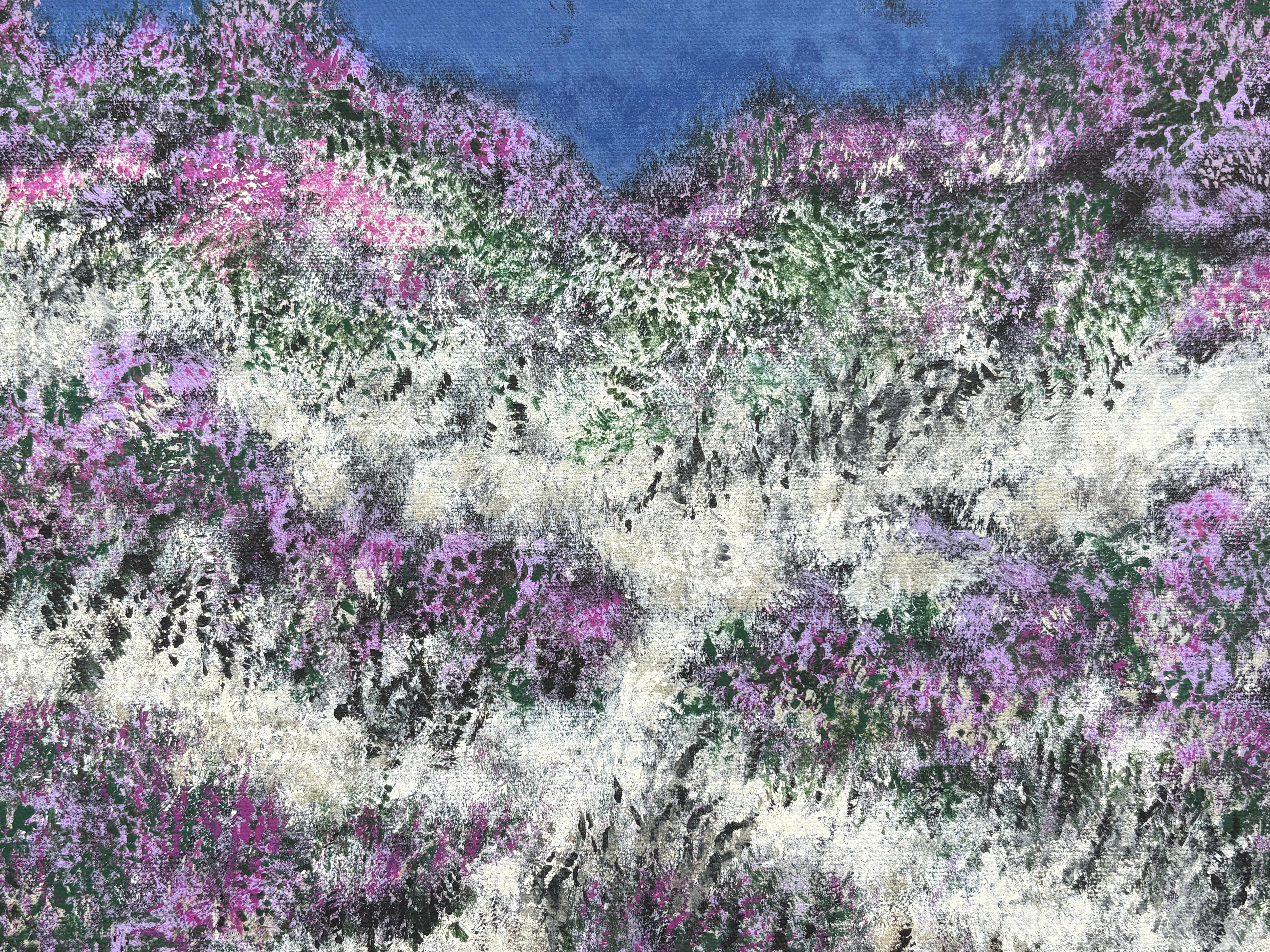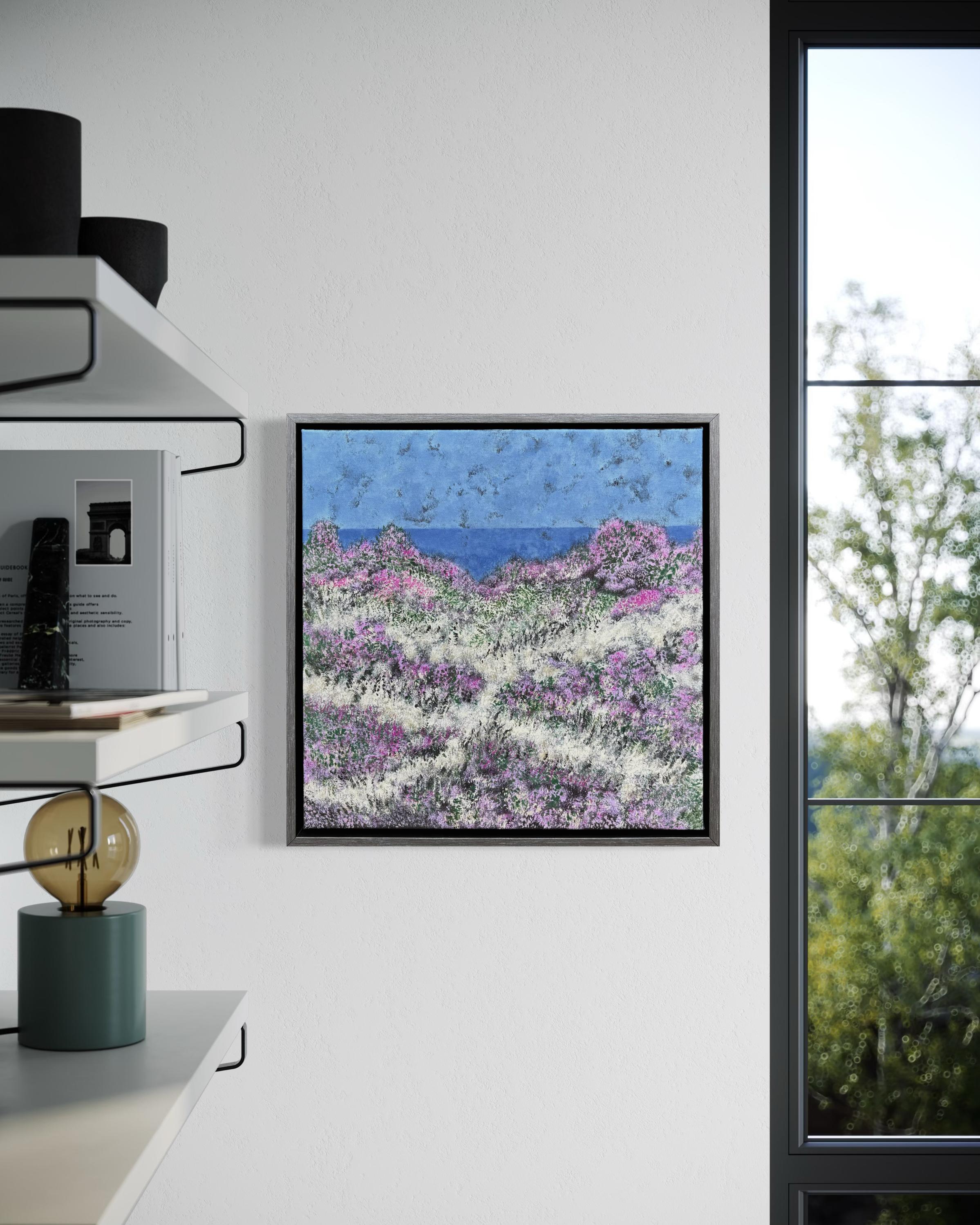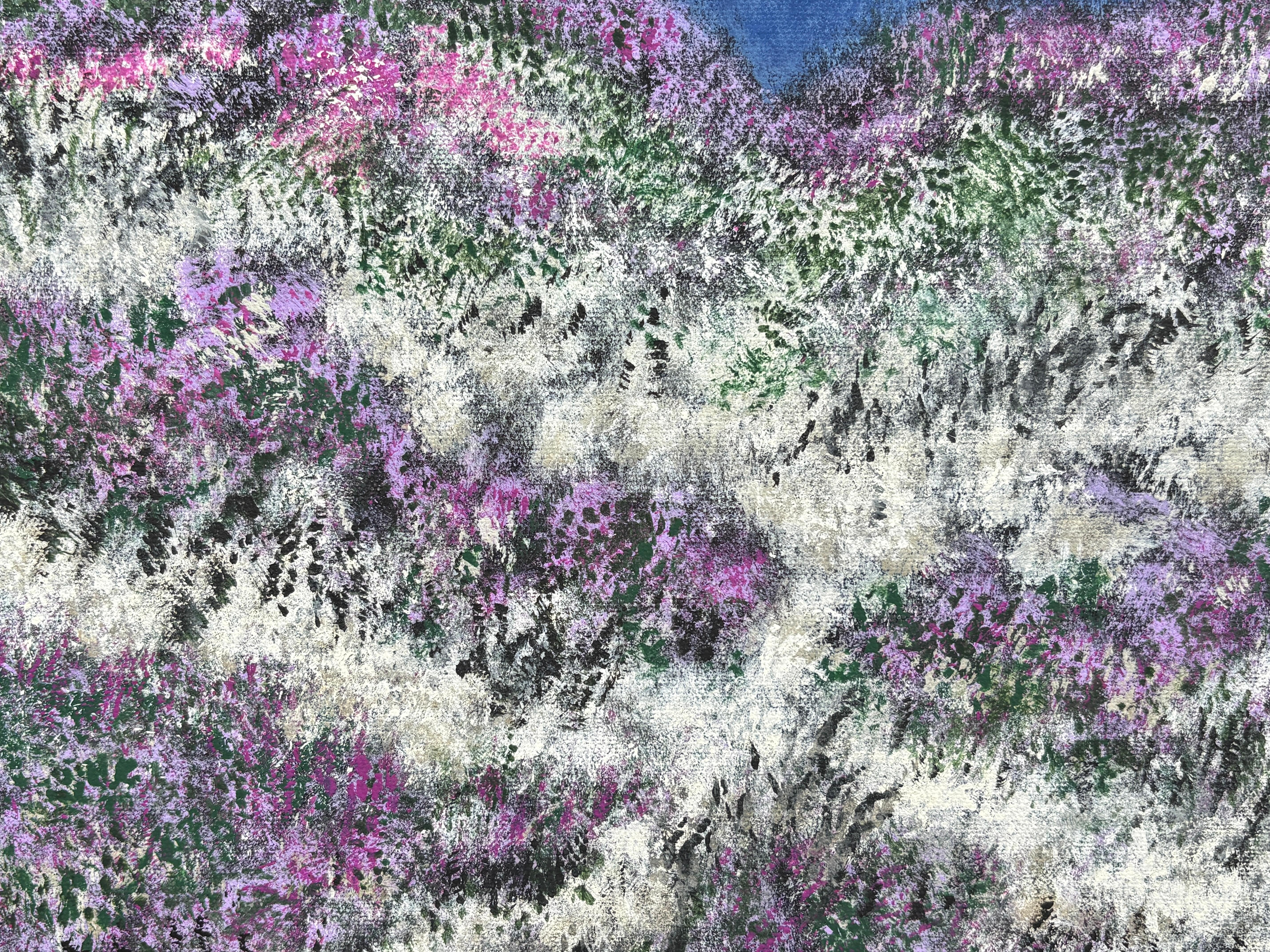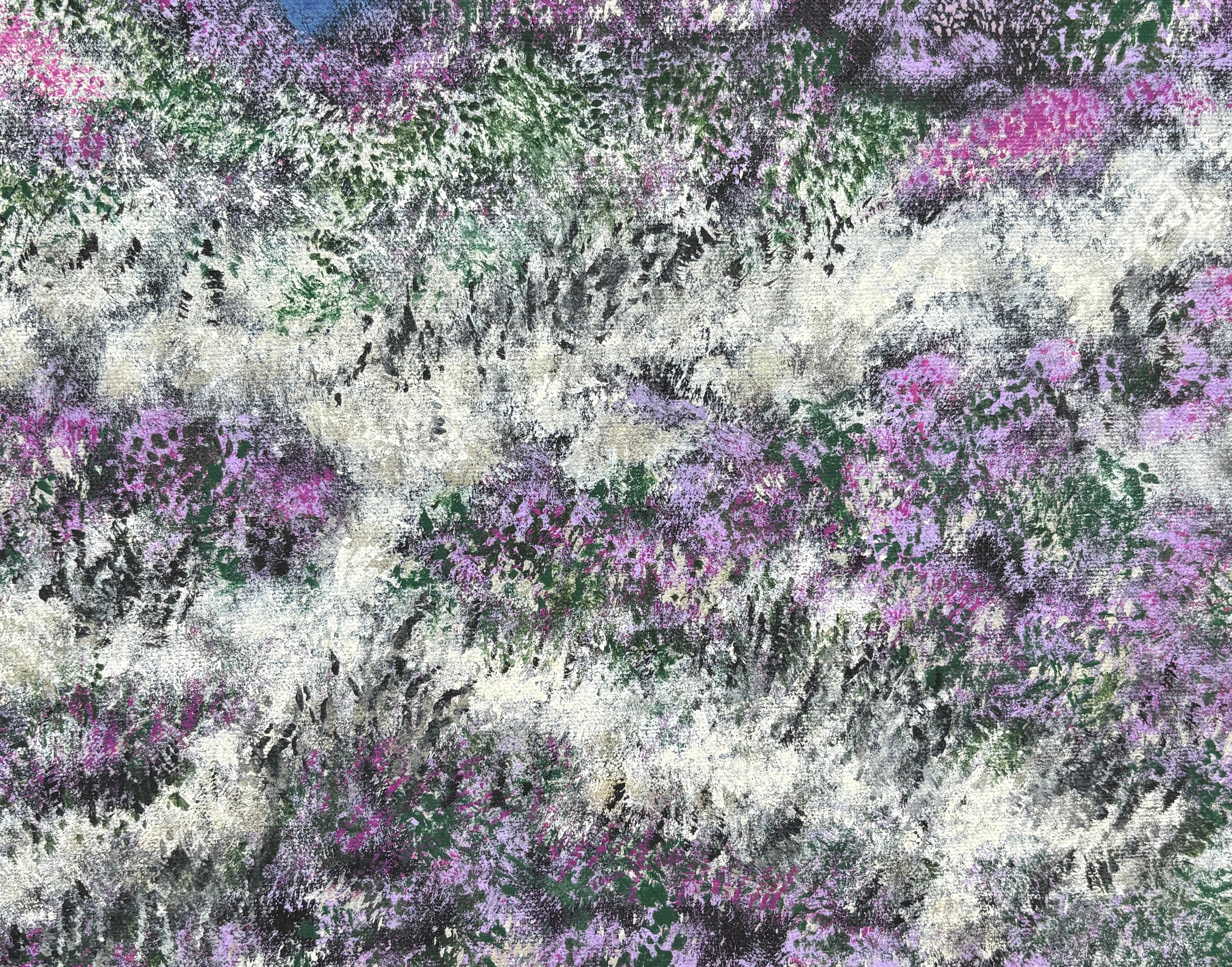 Dieses Werk fängt die windgepeitschte Schönheit der kalifornischen Küste in einem zeitgenössischen post-impressionistischen Stil ein. Schichten von Wildblumen in zarten Lila-, Rosa- und Weißtönen erstrecken sich bis zum Horizont und treffen auf das tiefe Blau des Pazifiks unter einem leuchtenden Himmel. Dieses ebenso heitere wie ausdrucksstarke Gemälde zelebriert die natürliche Poesie der Küstenlinie von Pacific Grove.