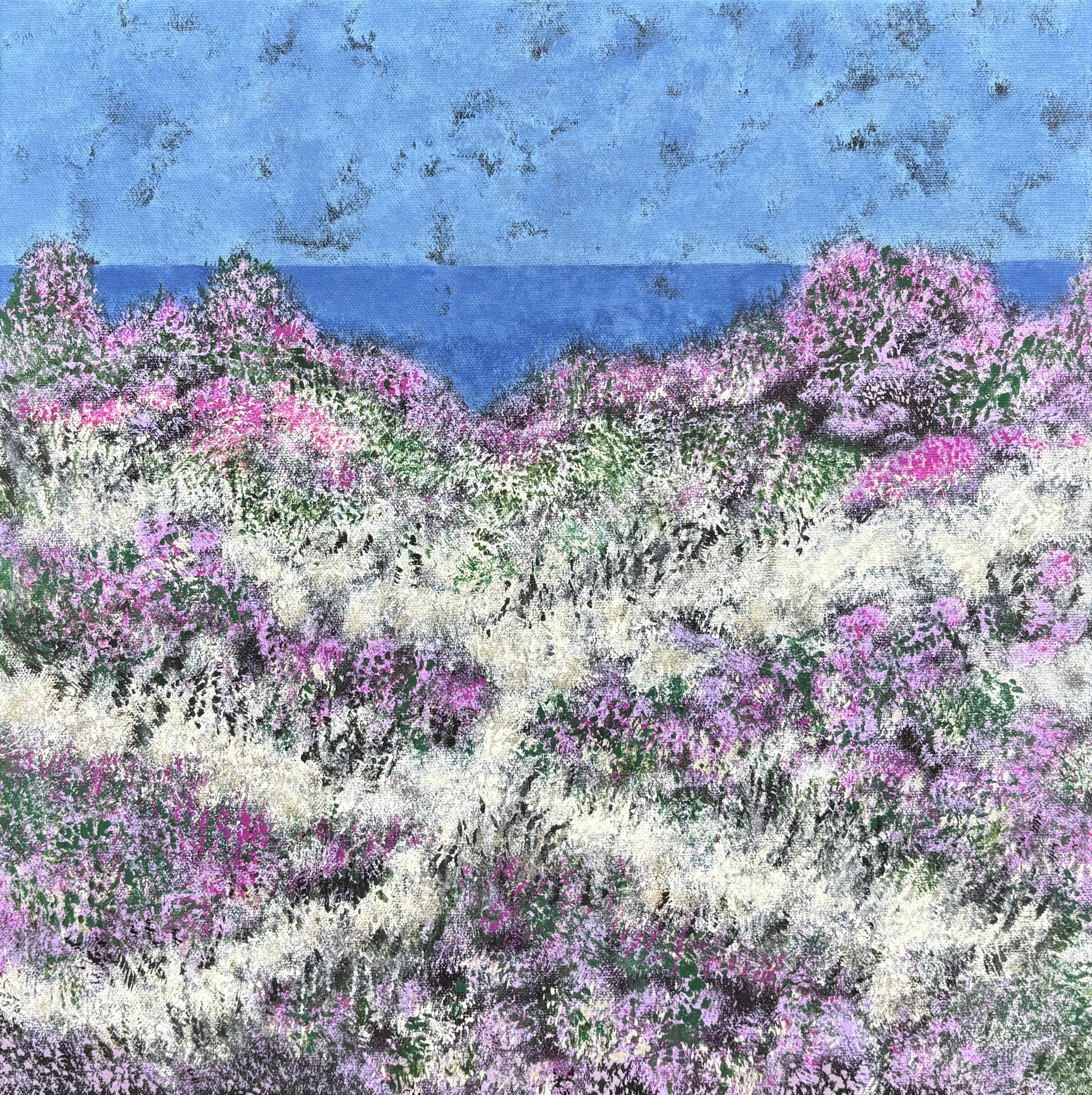Penny Whent"Pacific Grove Coast" - Helle Sandstrandlandschaft mit lila und grüner Flora2024