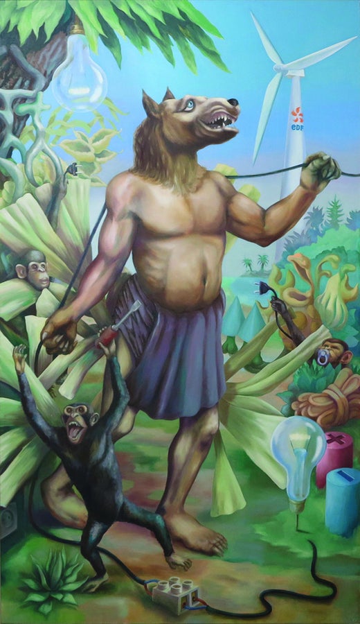 Ob er sich nun von alten Stichen oder von Berichten in Paris Match oder National Geographic inspirieren lässt, seine Fantasie wird von seltsamen, exzentrischen und unerwarteten Motiven beflügelt: Alien-Typologie (die kleinen Grauen und andere), Beatles (umgeben von Kaninchen und Erbsendosen), Conquistadoren, die auf den Status böser Zwerge reduziert werden, Michelin-Männchen mit Pfeilen, Unterwasser-Vespa und natürlich alles, was den primitiven Künsten eines aus der Milchstraße gefallenen Quai Branly ähnelt. Die Malerei, die sich über das Label des Anekdotischen lustig macht und gerne seltsame Geschichten erzählt (nicht zuletzt eine ihrer Funktionen, wenn auch sicher nicht die einzige), hat sich einen hohen Adel erworben, von Hieronymus Bosch bis Salvador Dali. Mit der perfekten Präzision einer sehr fortgeschrittenen Technik liebt es Stéphane Fauchille, Geschichten zu erzählen, vorzugsweise unwahrscheinliche, verrückte Geschichten, die er mit der todernsten Ernsthaftigkeit eines gelehrten Anthropologen erzählt."