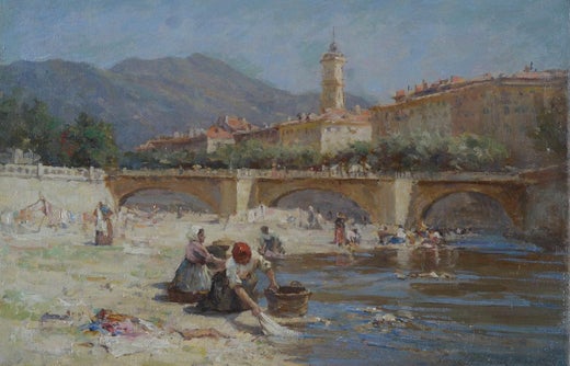 Ein weiteres prächtiges impressionistisches Gemälde von einem der beliebtesten britischen Maler. Eine schöne, von der Sonne verwöhnte Szene mit Wäscherinnen am Ufer des Flusses Paillon in Nizza in Südfrankreich. Er hat die wundervoll gezeichneten Figuren im Vordergrund mit der Brücke und der Stadt im Hintergrund mit den Bergen dahinter.